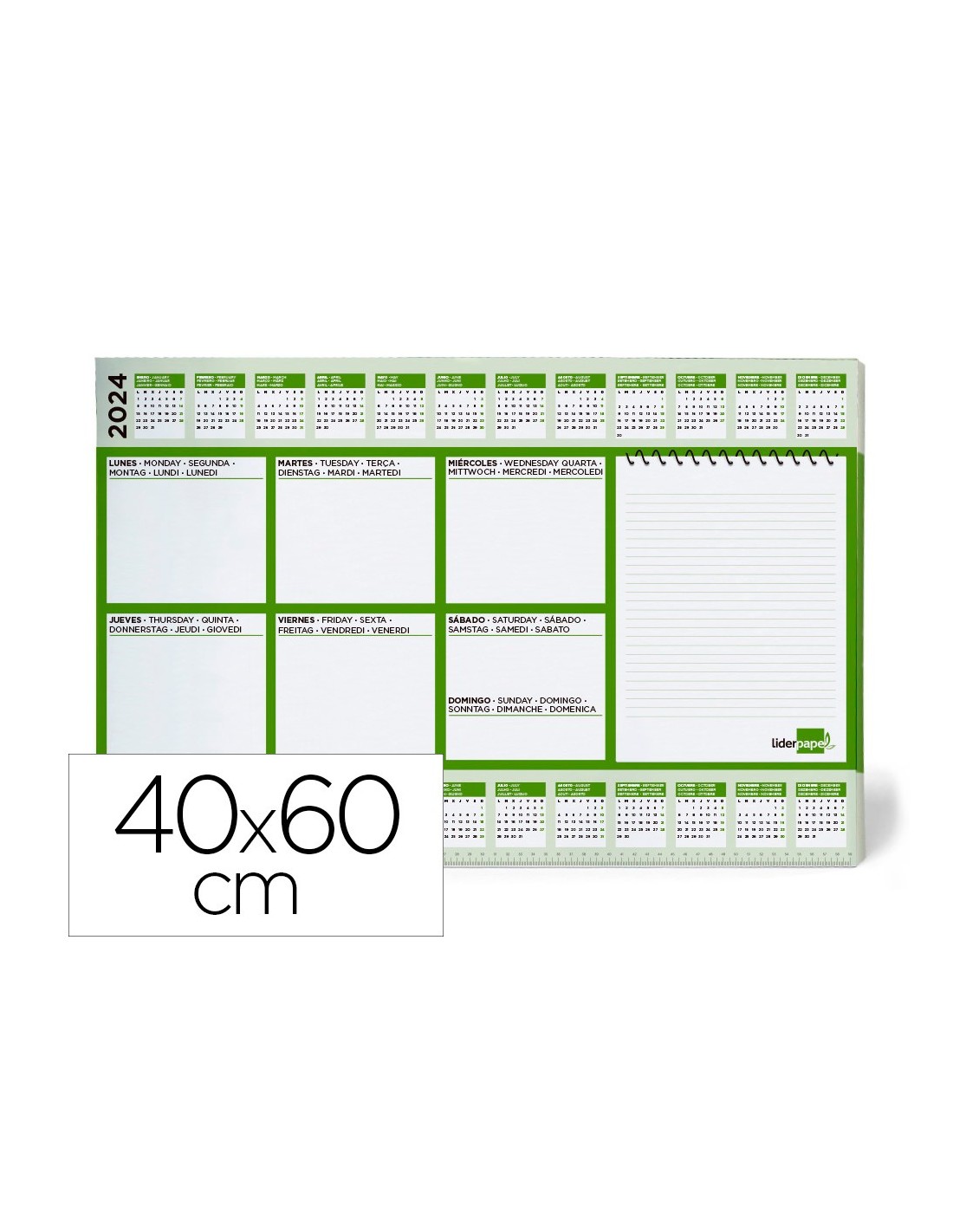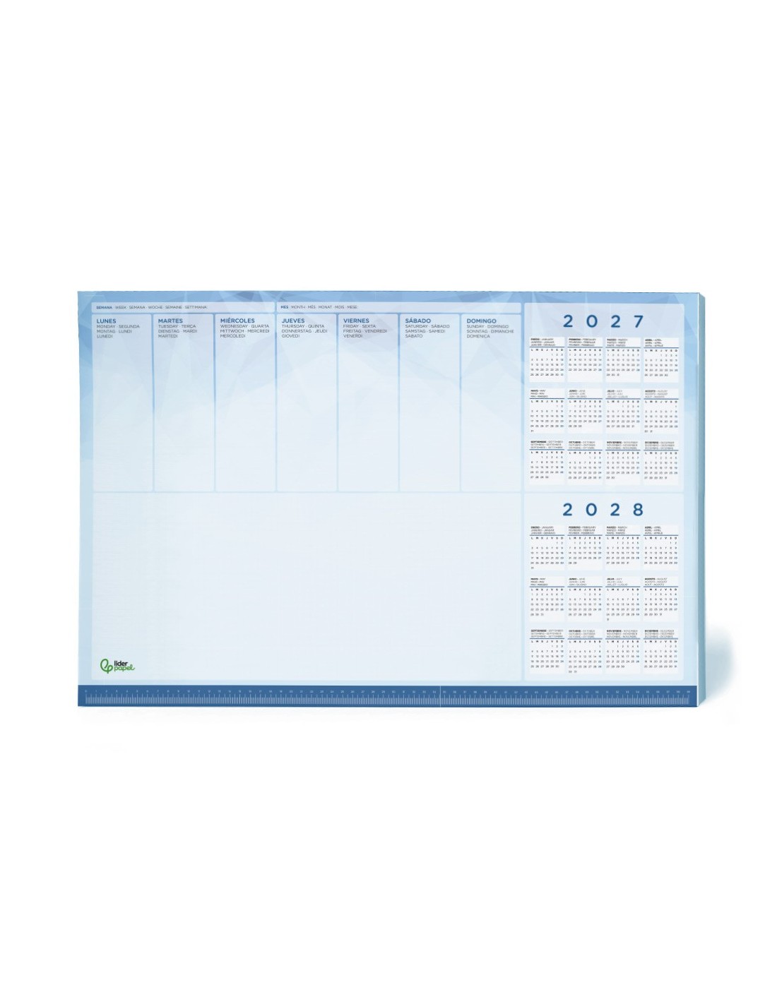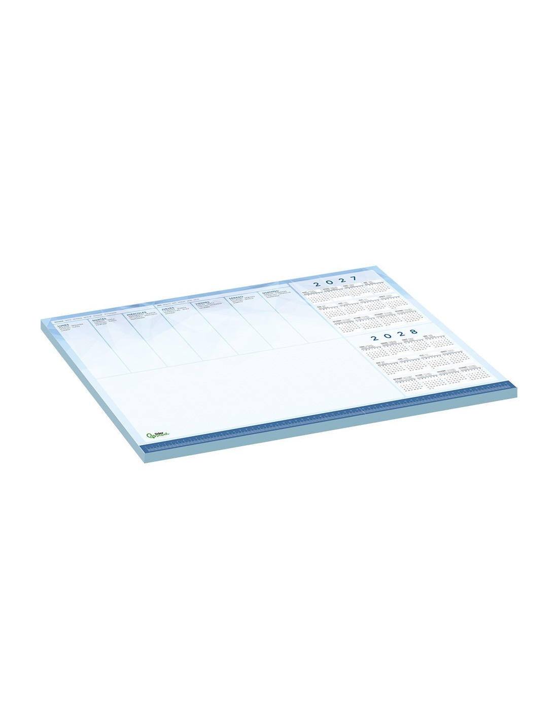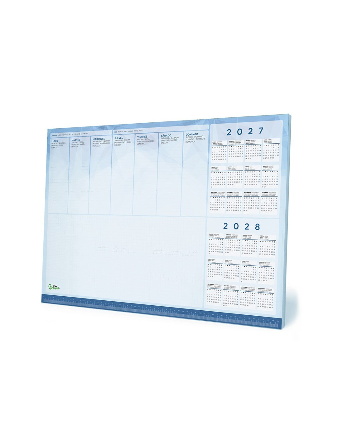 Planning de sobremesa semanal ideal para el escritorio. Calendarios 2027/2028. Regla inferior de 59 cm. Con espacio para anotaciones. Papel de 90 g/m². 50 hojas. Medidas: 600 x 400 mm.