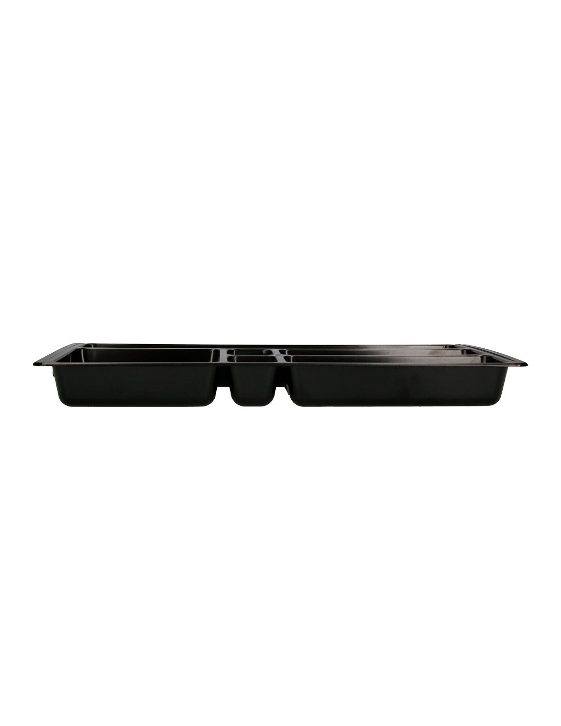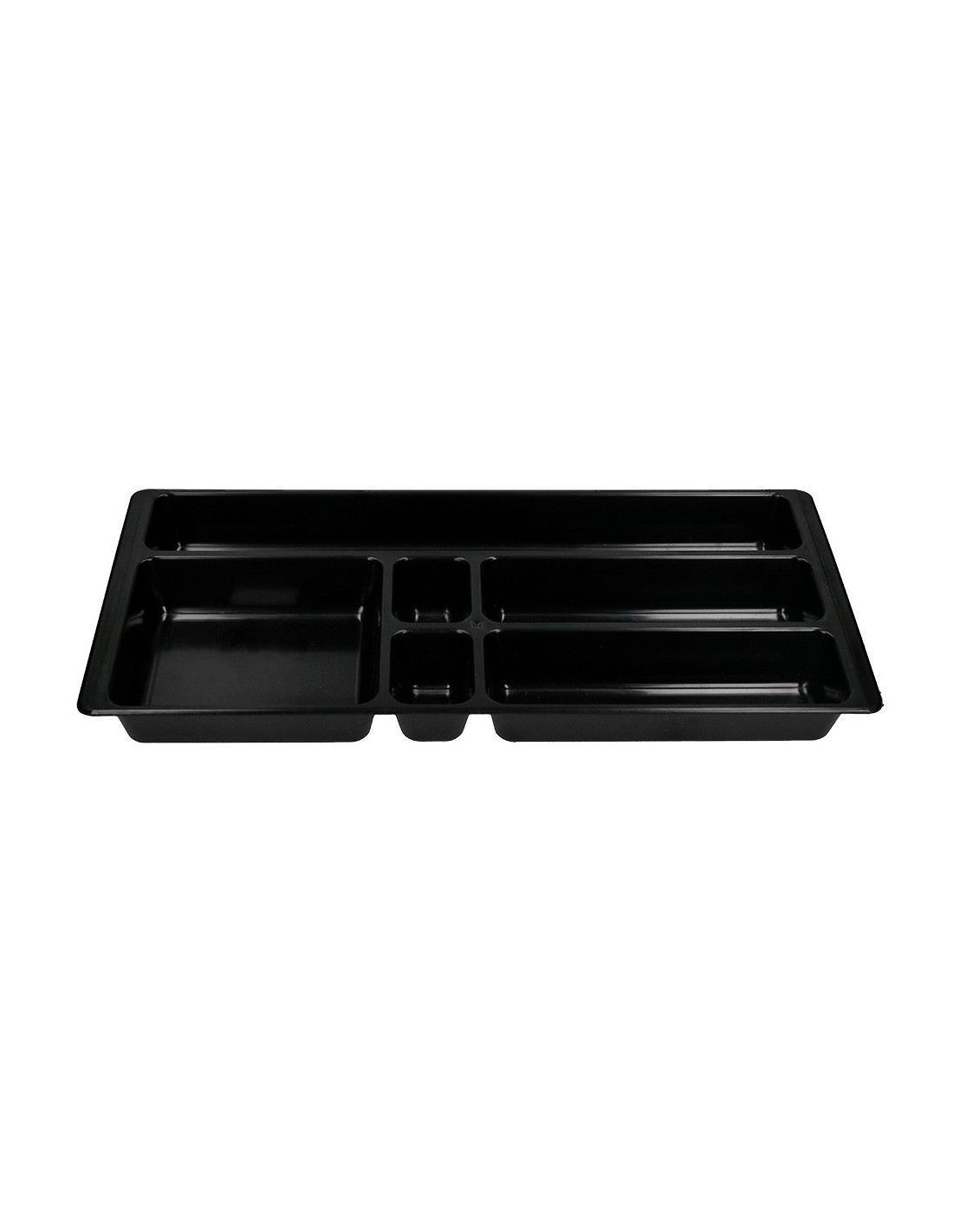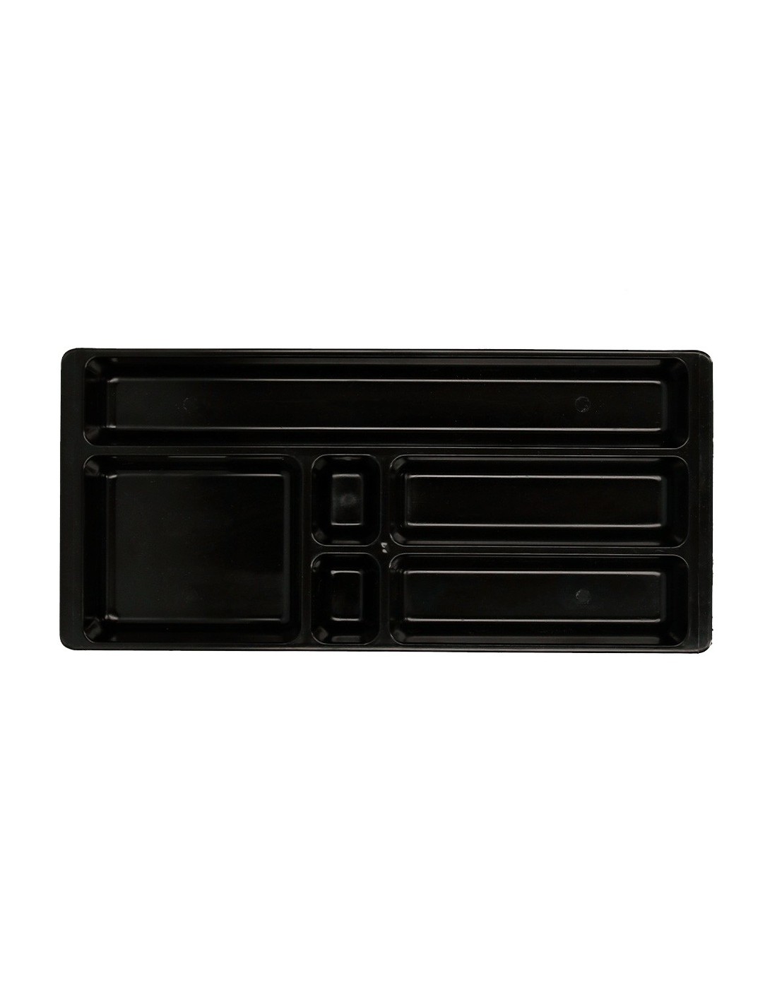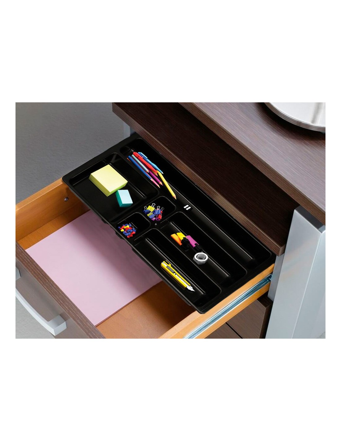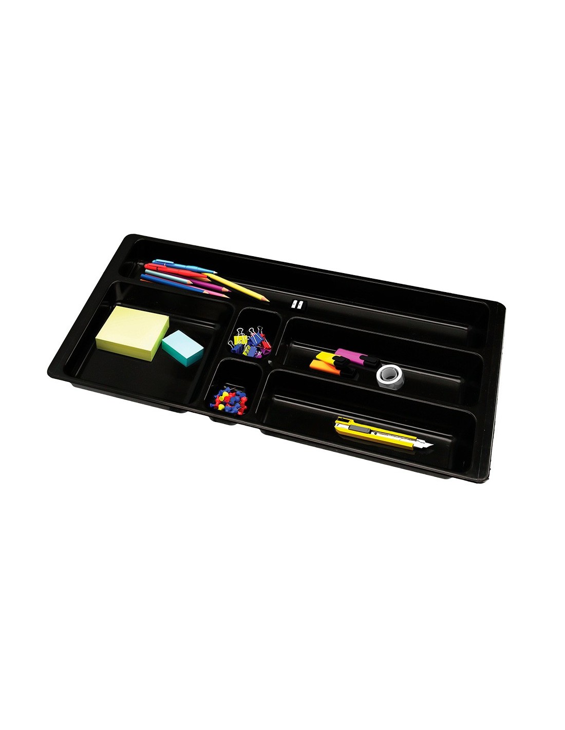 Fabricada en poliestireno de alta resistencia. Compuesta por 6 compartimentos de diferentes tamaños, es perfecta para organizar y ordenar los pequeños accesorios (bolígrafos, llaves, memorias USB, etc) en un cajón. Apto para cajones de escritorio de 344 mm de ancho. Color negro. Medidas: 344 x 160 x 33 mm. No incluye accesorios.