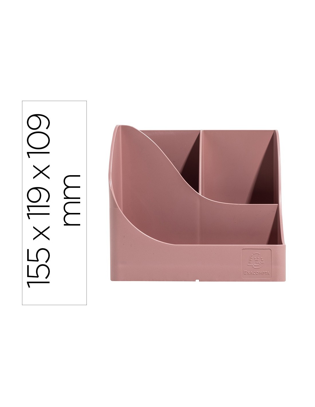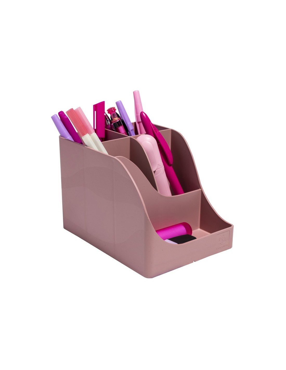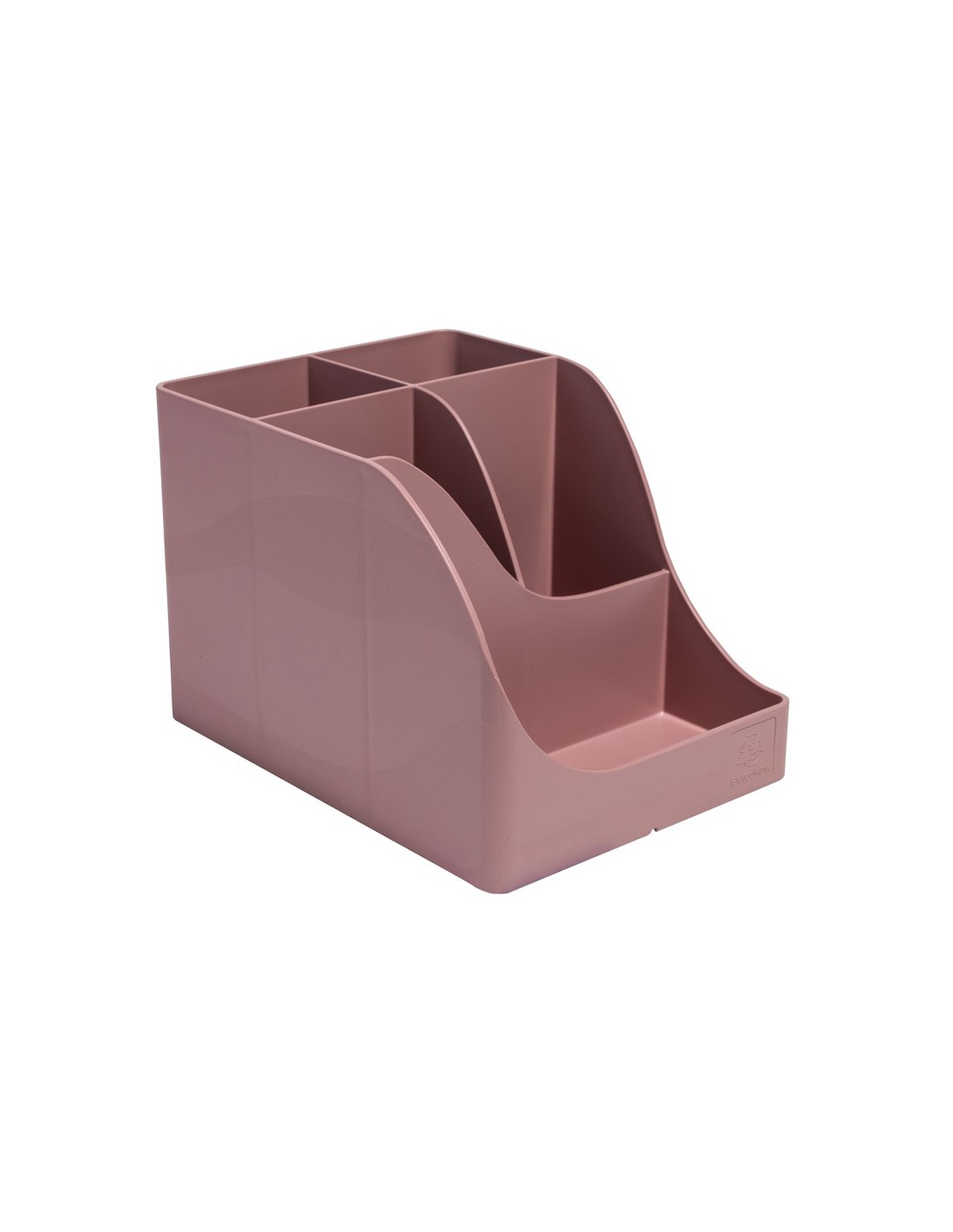 Organizador de sobremesa Pen Wave Skandi grande de 4 compartimientos. Material en plástico reciclado certificado Ángel Azul. Ideal para colocar y sujetar un dispositivo teléfono movil en la parte frontal. Color rosa vintage. Medidas: 155x119x109 mm.