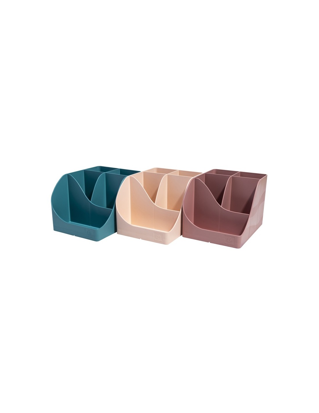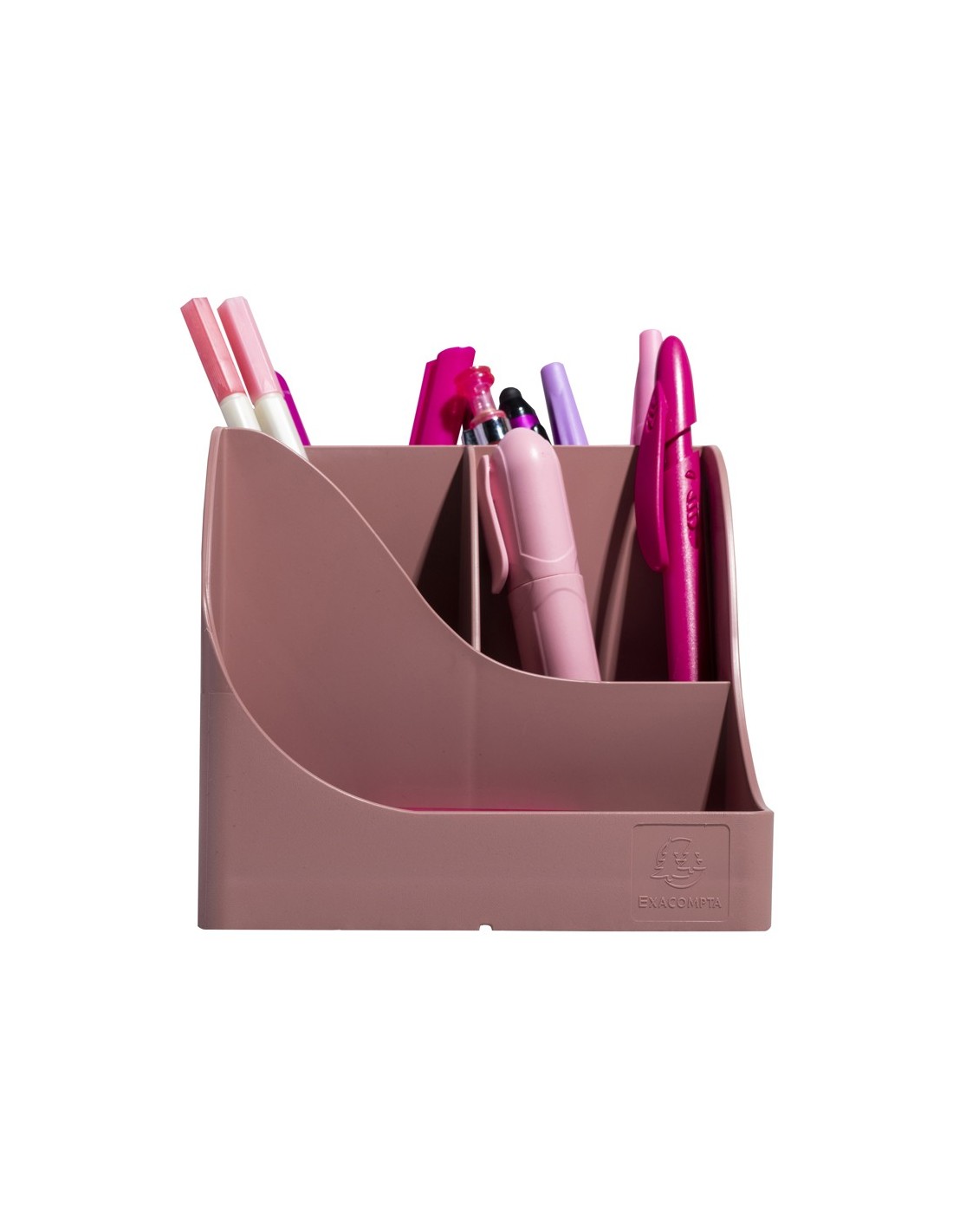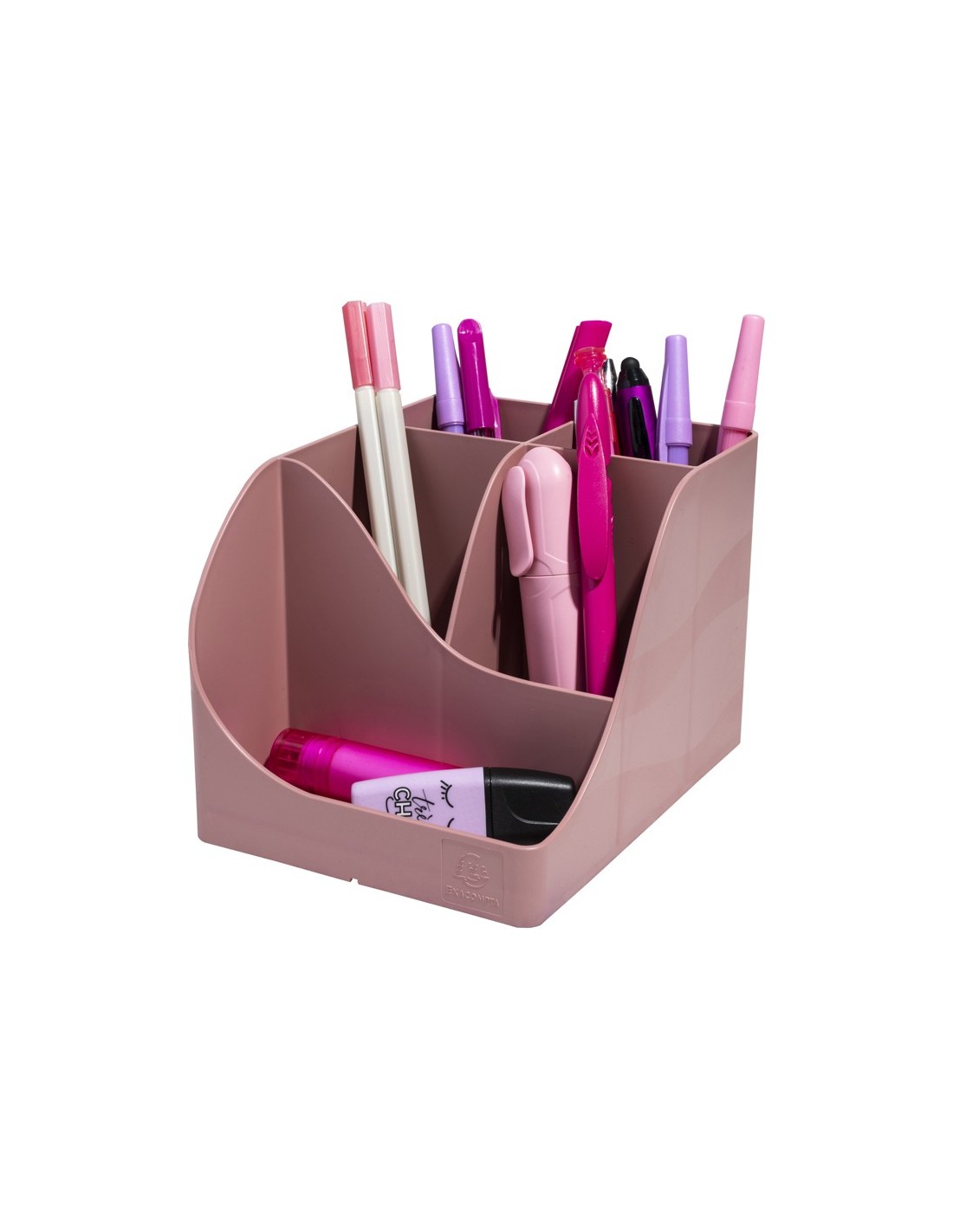 Organizador de sobremesa Pen Wave Skandi grande de 4 compartimientos. Material en plástico reciclado certificado Ángel Azul. Ideal para colocar y sujetar un dispositivo teléfono movil en la parte frontal. Color rosa vintage. Medidas: 155x119x109 mm.