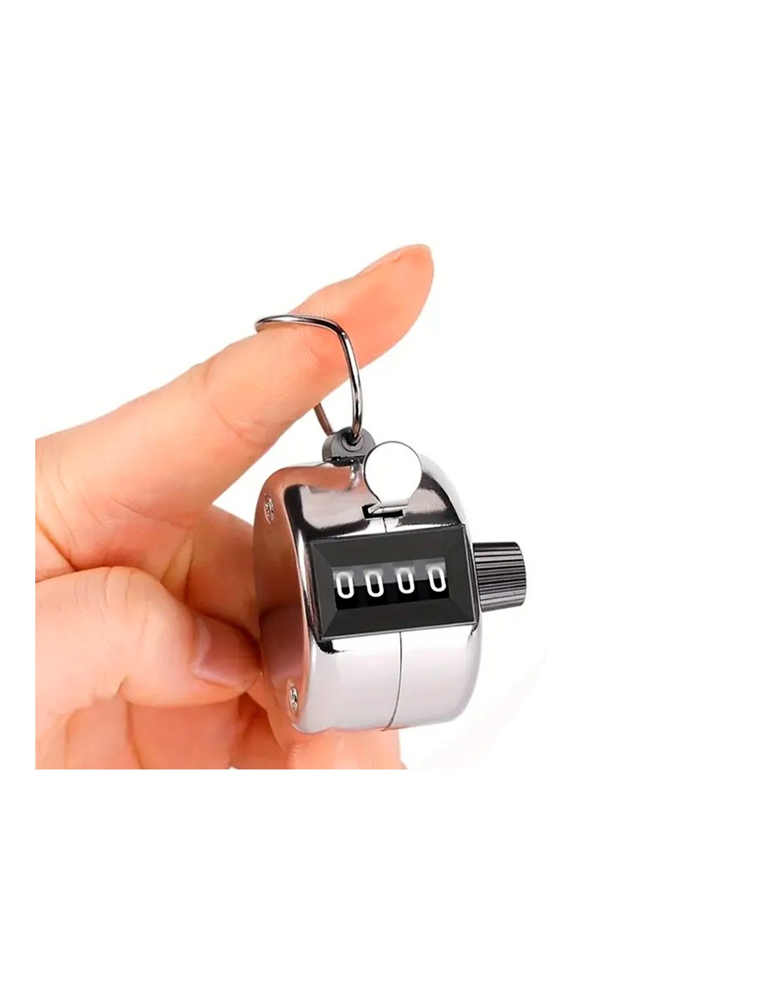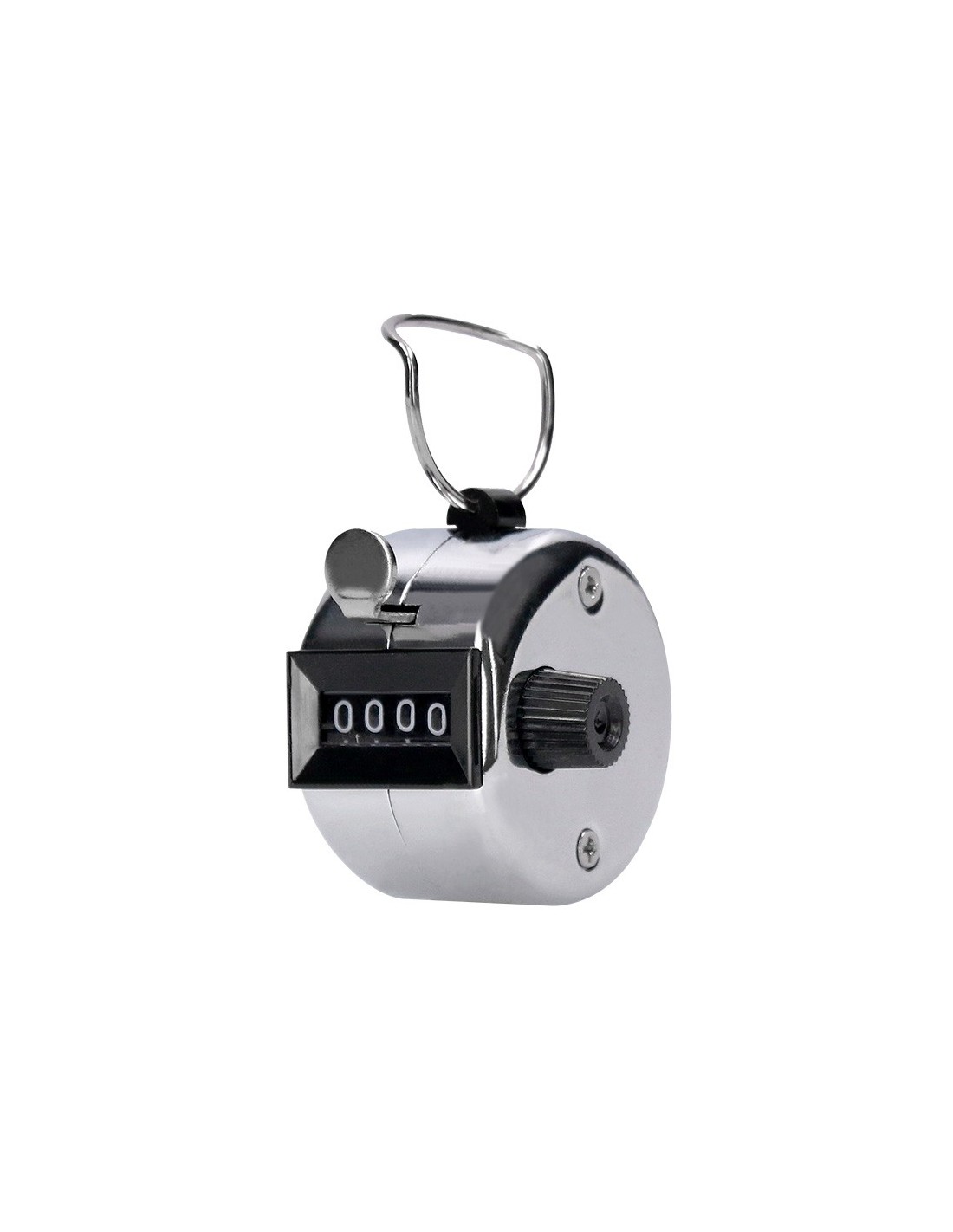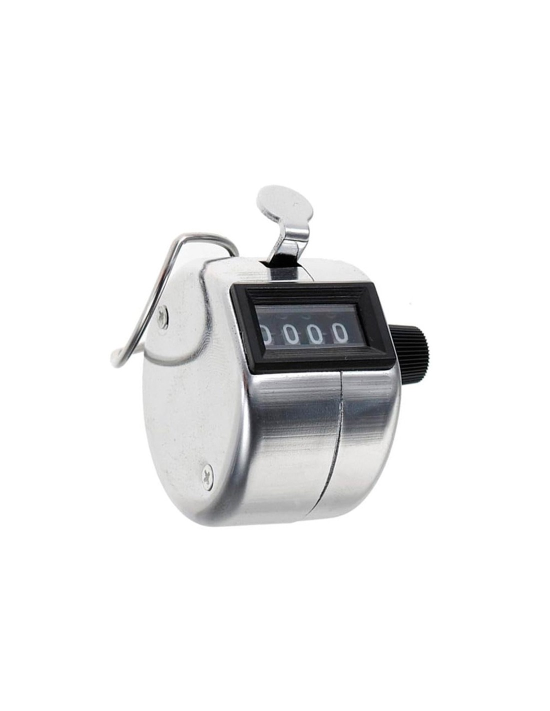 Contadora manual. Cuenta de 0 a 9999. Palanca de reinicio de conteo. Se ajusta bien a la mano. Peso: 50 g.