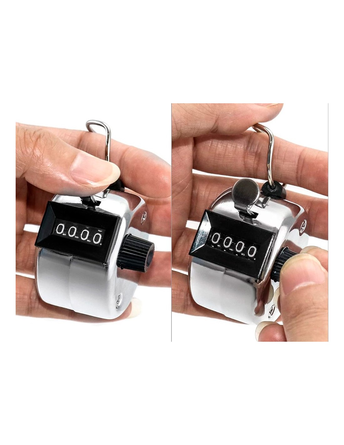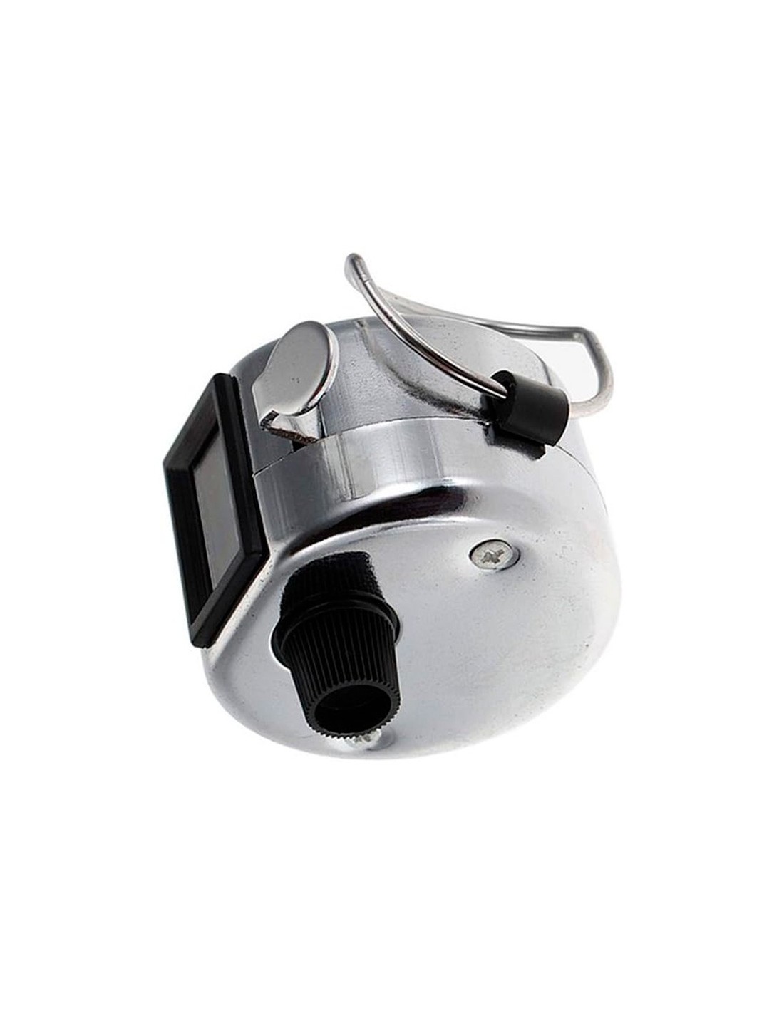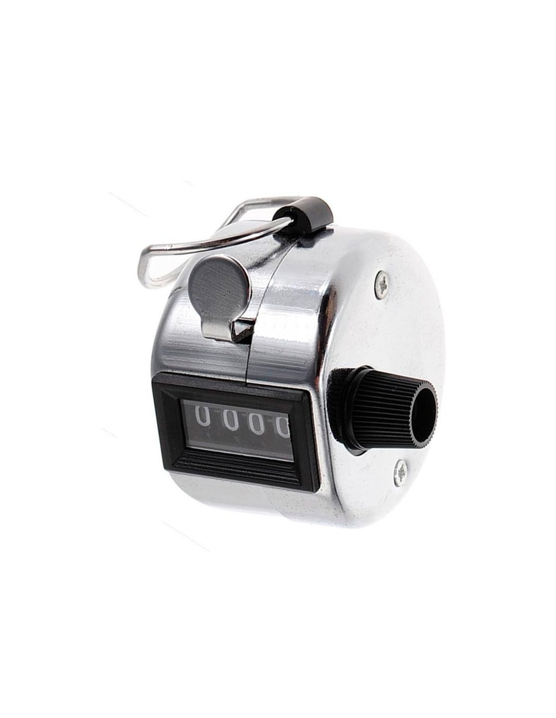 Contadora manual. Cuenta de 0 a 9999. Palanca de reinicio de conteo. Se ajusta bien a la mano. Peso: 50 g.