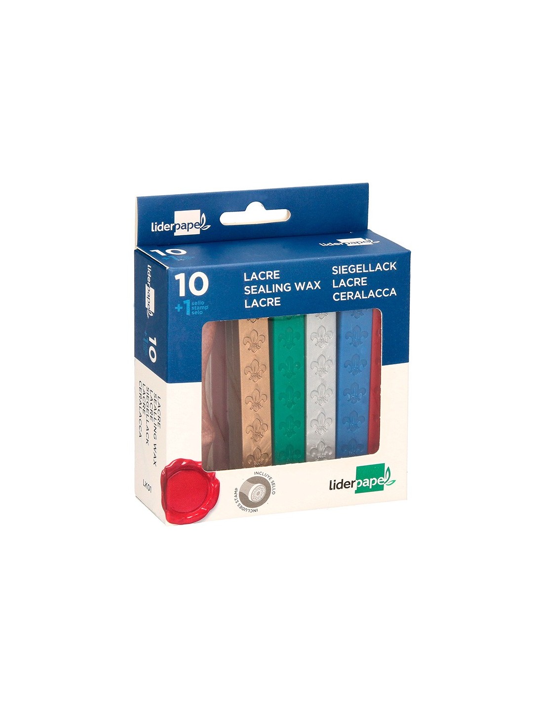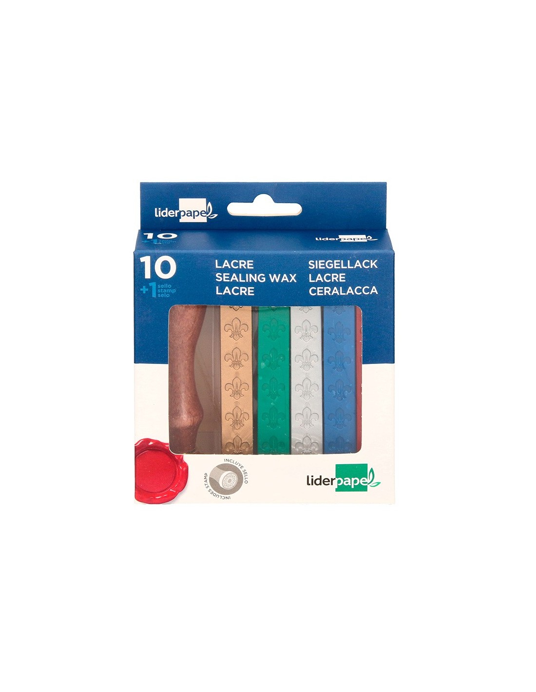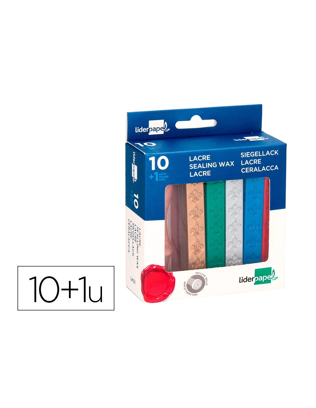Barras de lacres para sellar. 10 barras de colores surtidos (6 unidades color rojo, 1 azul, 1 verde, 1 plata y 1 dorado). Con sello de carta incluido. Presentación en blíster.