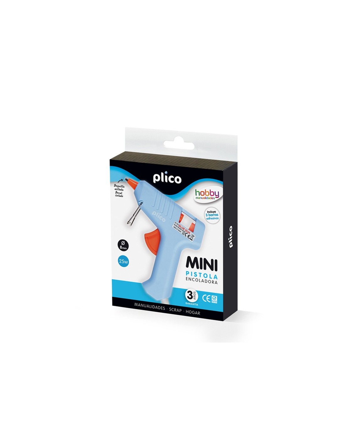 Pistola encoladora de 25W de potencia. Ideal para manualidades y pequeñas reparaciones en el hogar. Pega al instante gran variedad de materiales: madera, plásticos rígidos, cerámica, vidrio, metal, porcelana. También para uso como adhesivo de relleno. Medidas: 110 x 110 mm.