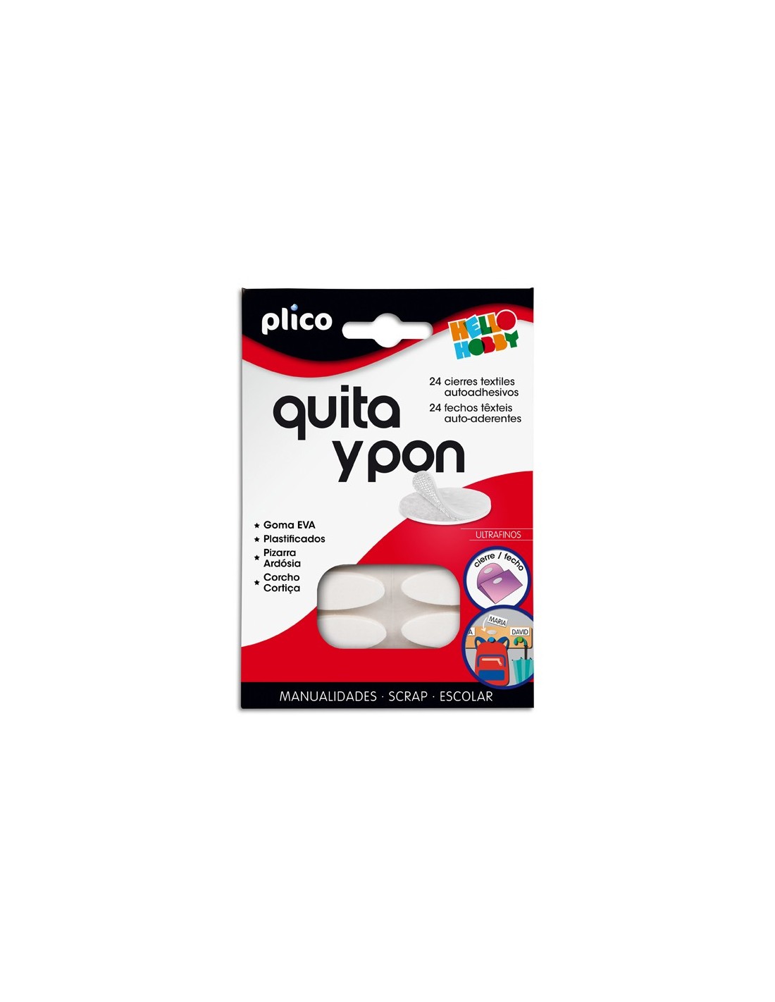 Quita y Pon son piezas de velcro ovaladas y autoadhesivas. Ultrafinas. Pegan sobre múltiples materiales como goma EVA, cartón, madera, textil, plastificados. Son ideales en el ámbito de las manualidades y el escolar. 24 cierres textiles en cada sobre. Color blanco. Medidas: 35 x 12 mm.