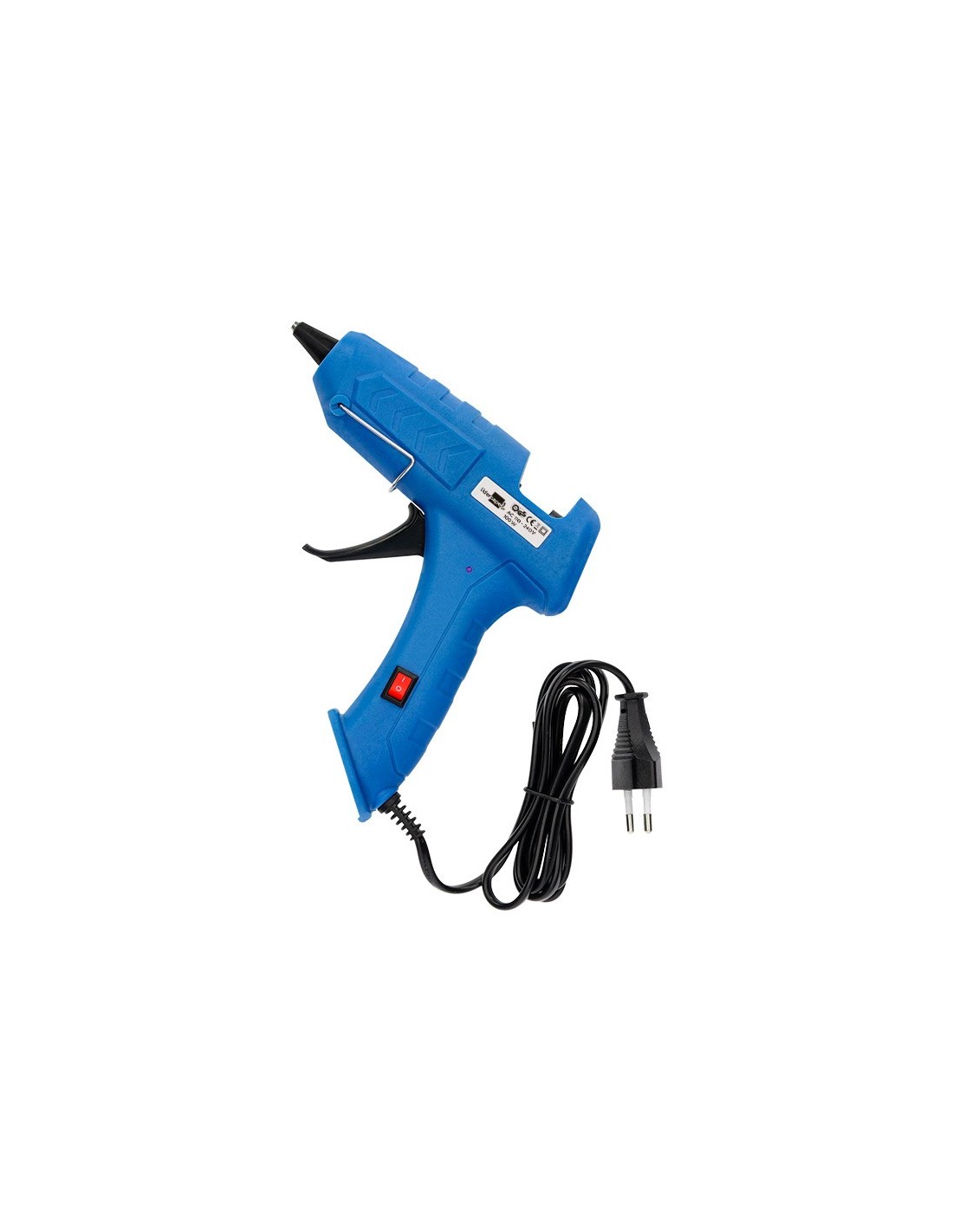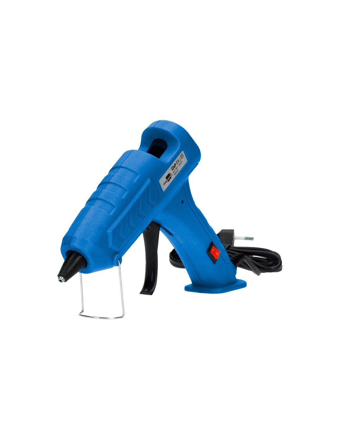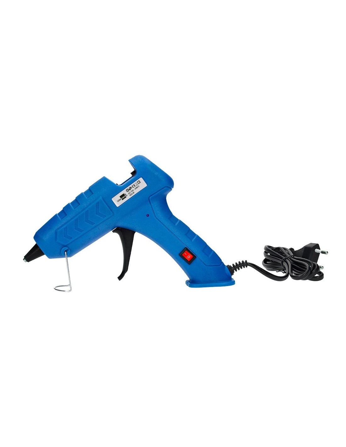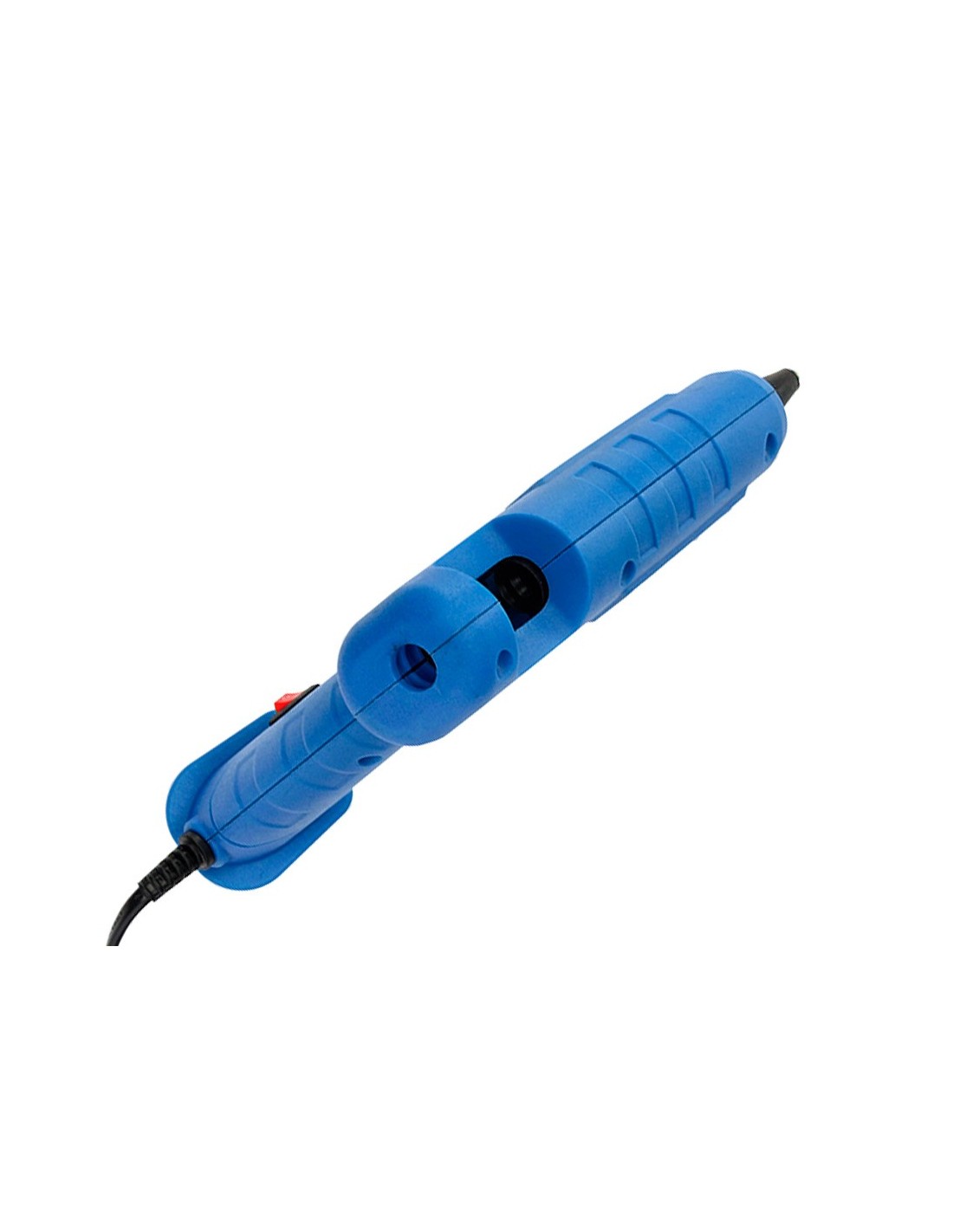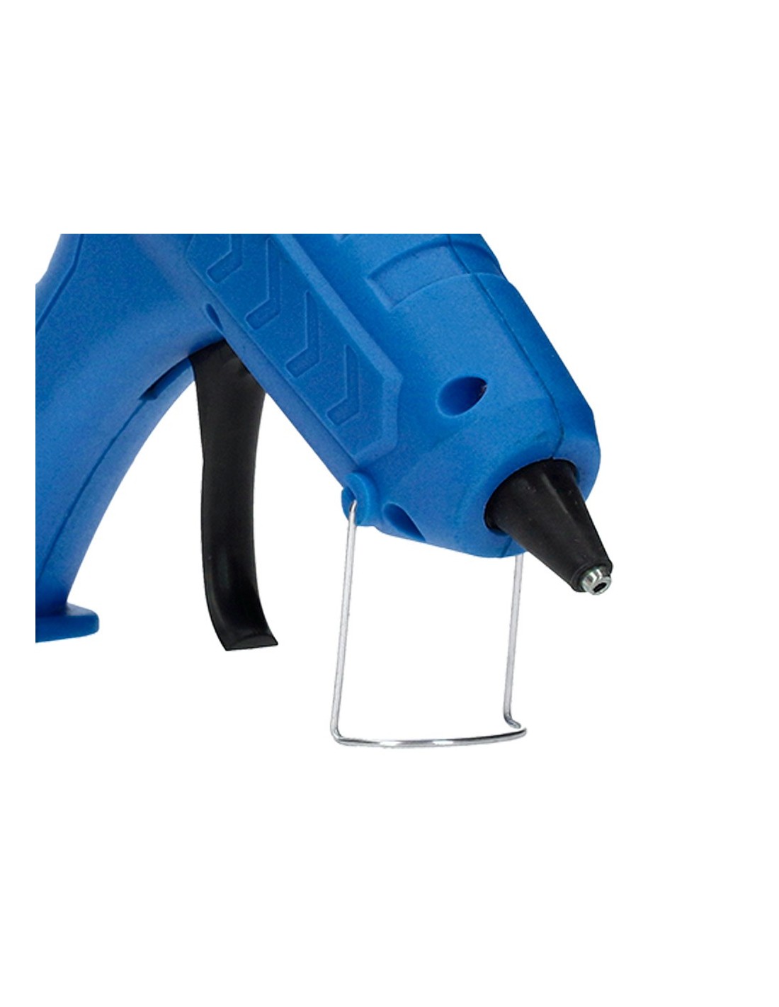 Pistola de pegamento termofusible. Con gatillo dispensador. Ideal para realizar trabajos manuales. Potencia: 100 W. Incluye 2 barras sólidas de 100 mm de largo x 11 mm de diámetro. Medidas: 165 x 160 x 37 mm.