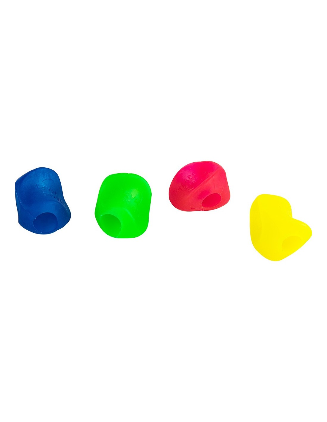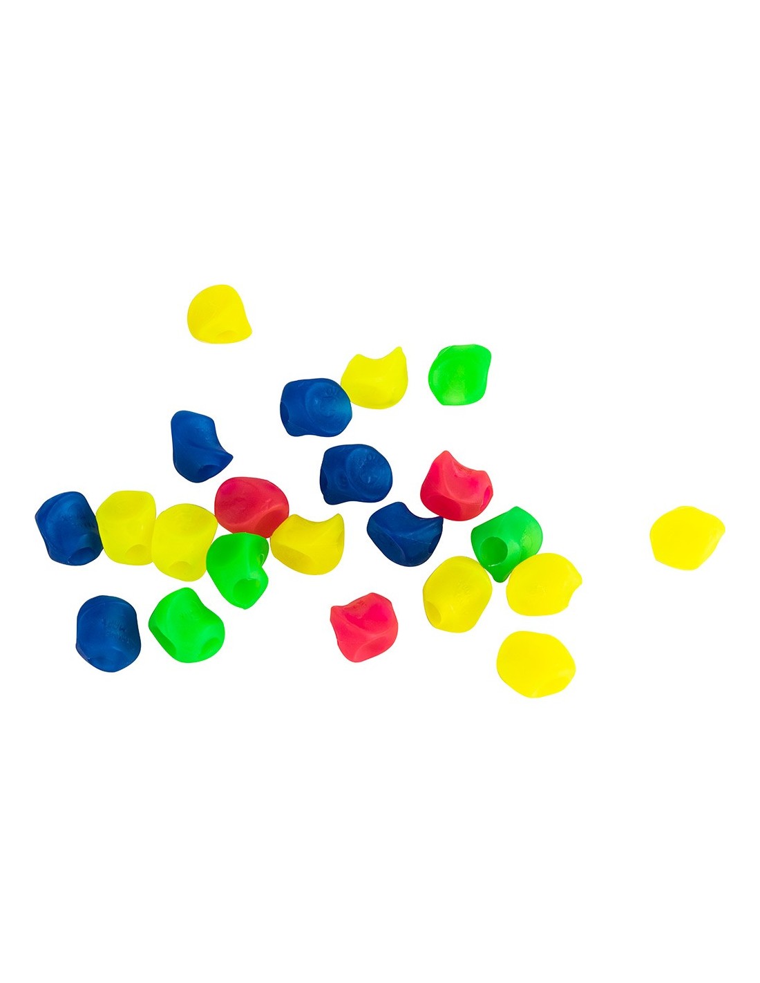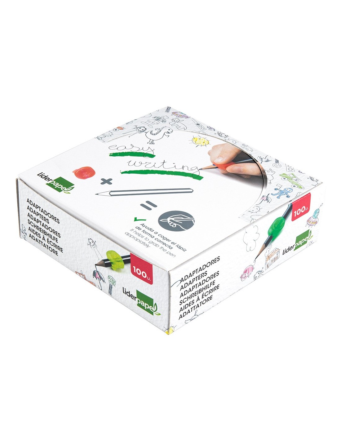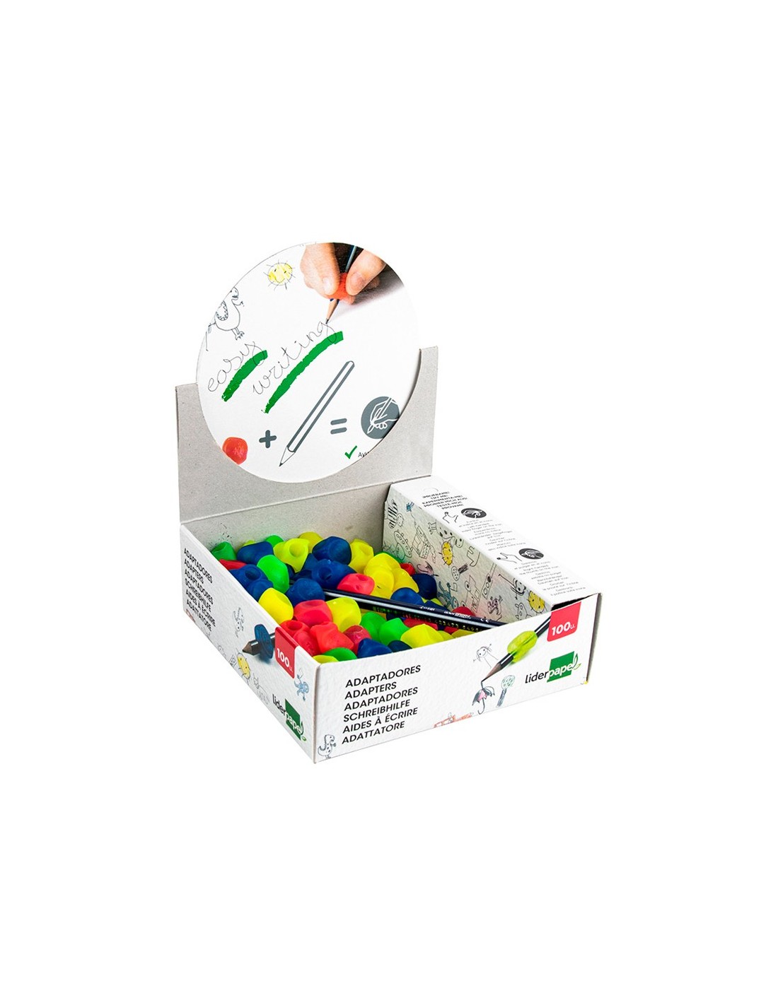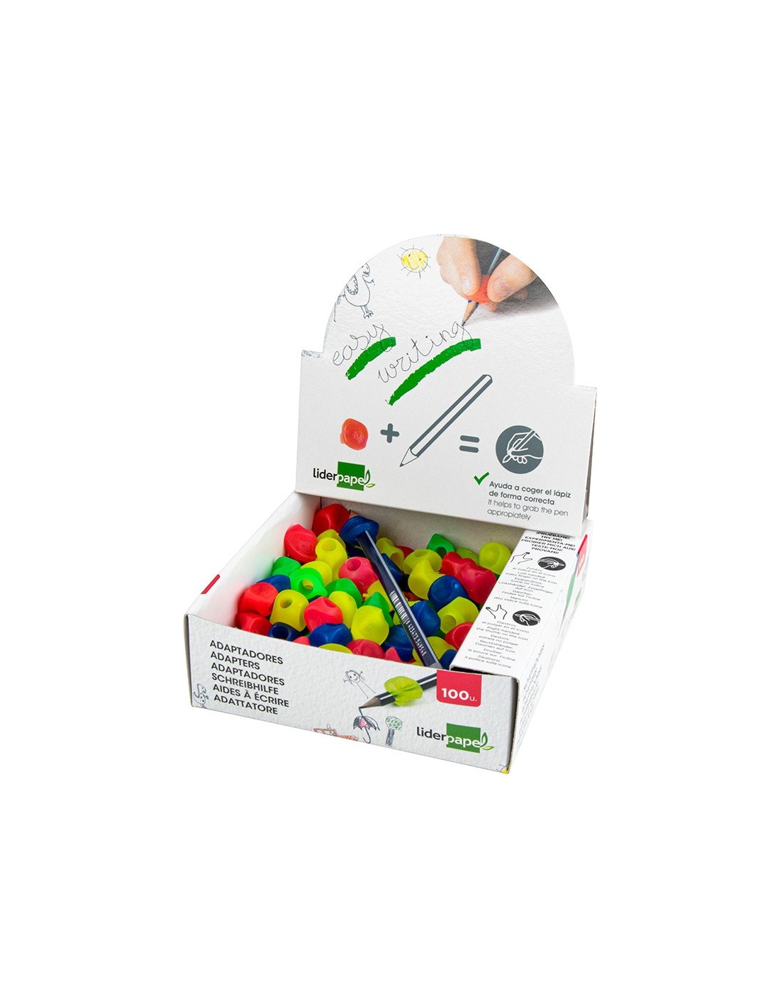 Adaptador de plástico moldeado a la posición de los dedos. Ideal para enseñar al escolar a coger el lápiz correctamente y a la vez facilitar la escritura en sus inicios. Puede adaptarse tanto a zurdos como a diestros. Recomendado por los educadores. Colores surtidos. La caja de 100 unidades.