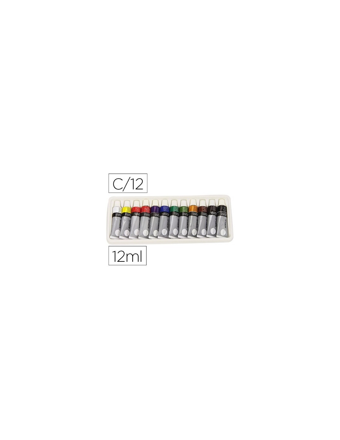 Apta para todo tipo de superficies como papel, cartón, lienzo, etc. Se puede usar directamente o diluida con agua. En caja de cartón. 12 colores surtidos. 12 tubos de 12 ml.