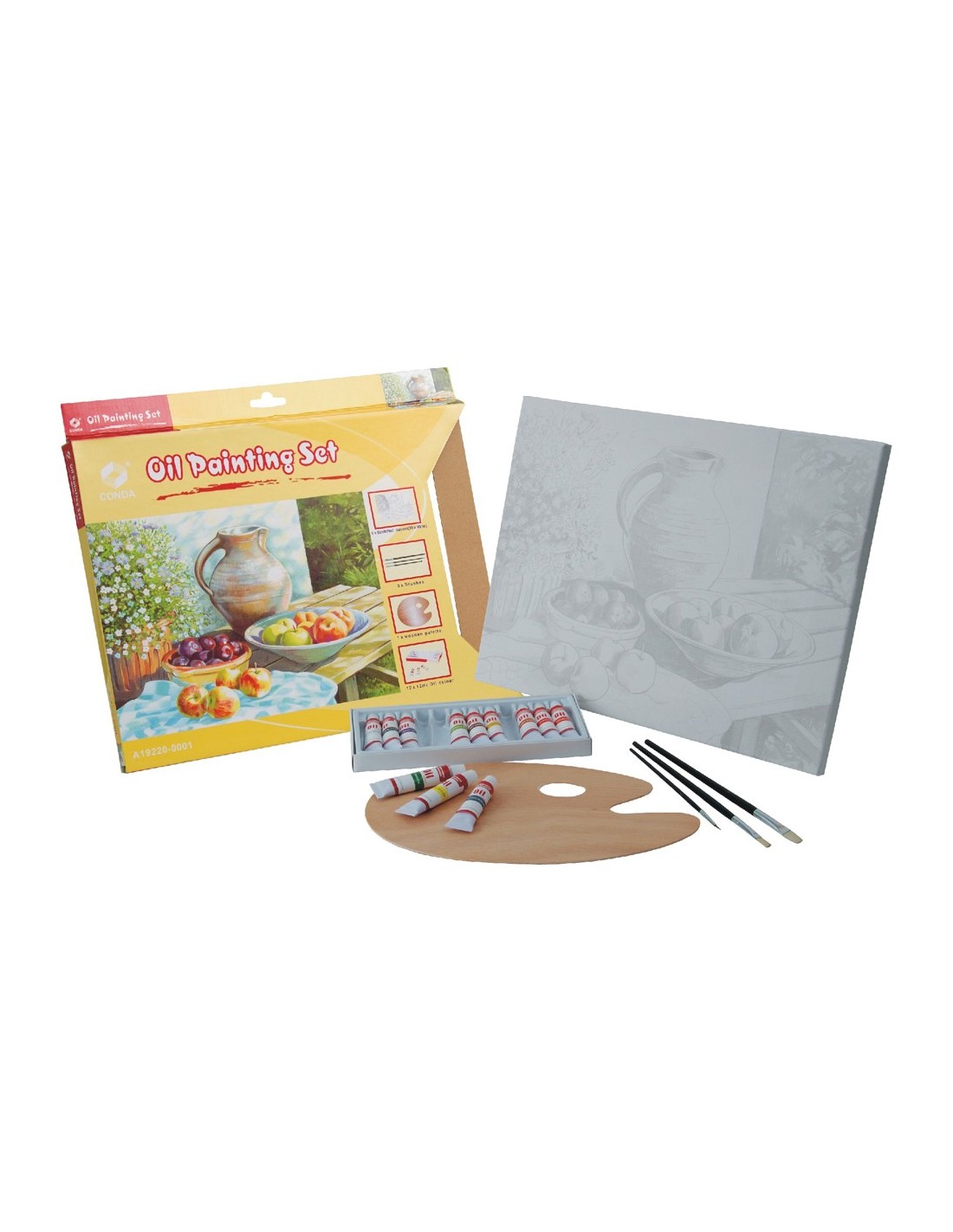 Contiene un lienzo extendido con imprimación de 30 x 40 cm. 1 paleta de madera. 3 pinceles y 12 tubos de colores al óleo de 12 ml.