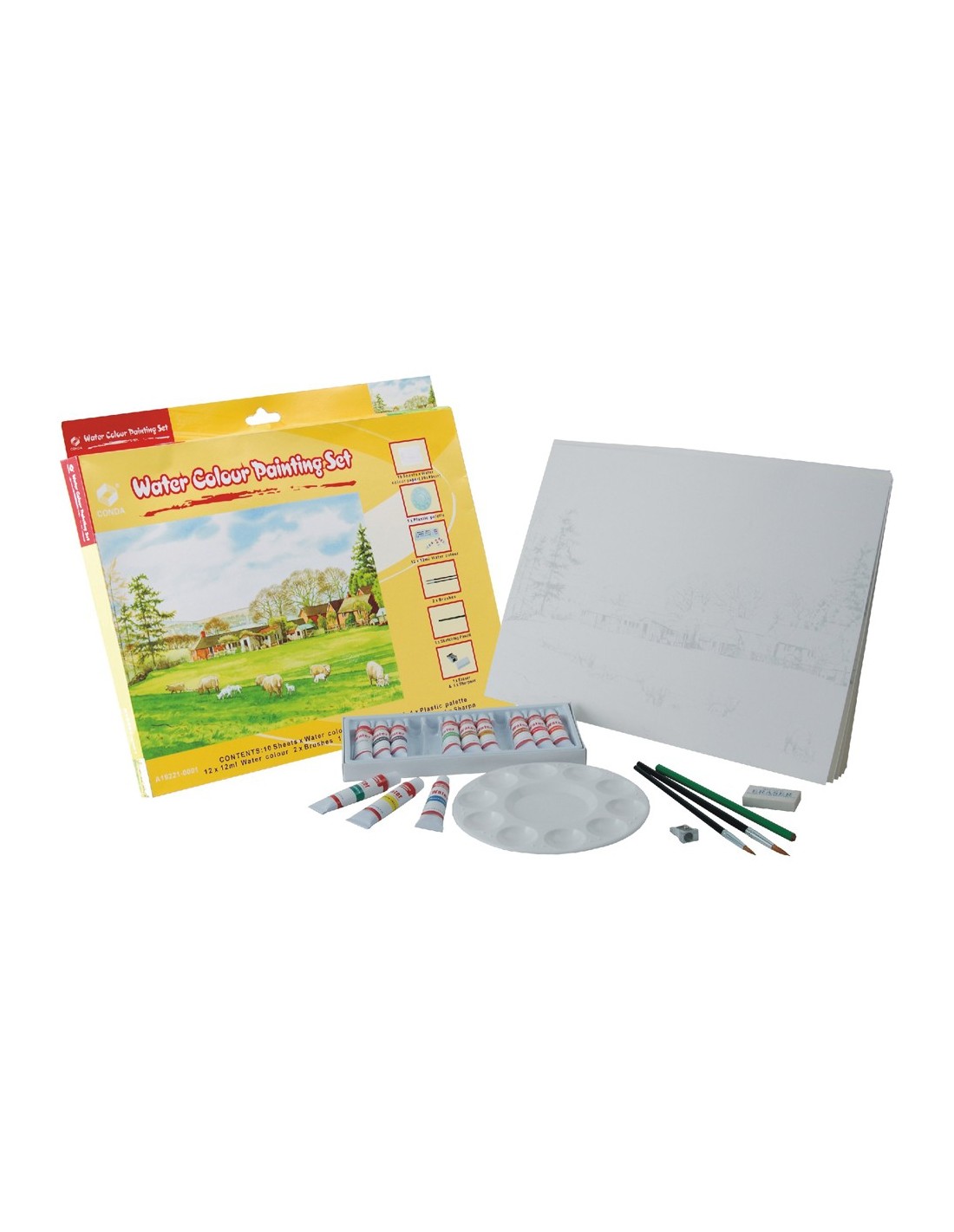 Contiene 10 láminas de acuarela de 27 x 38 cm, 1 con imprimación y el resto en blanco, 2 pinceles, 1 paleta de plástico, 1 perfilador, 1 goma, 1 sacapuntas y 12 tubos de acuarelas de 12 ml.