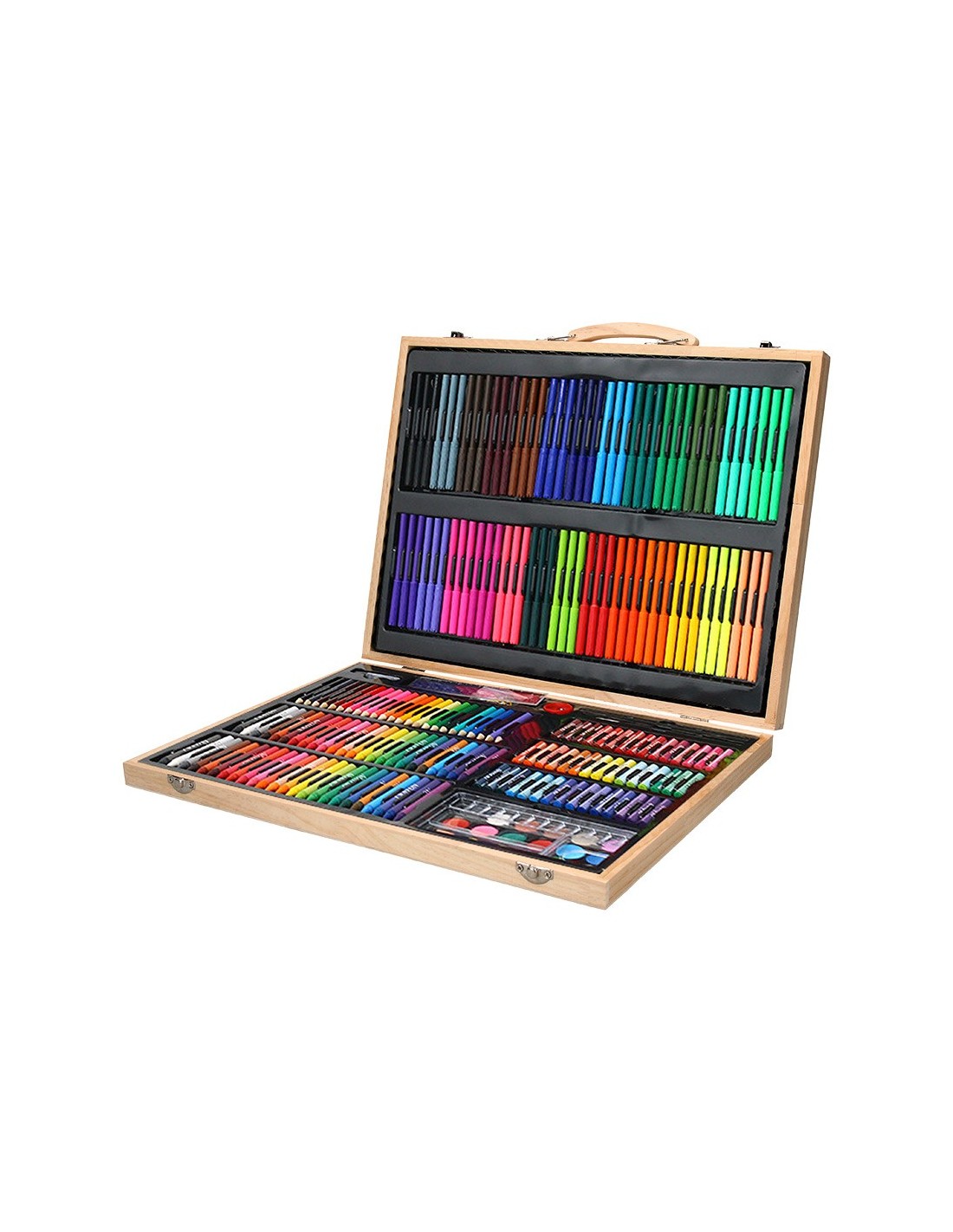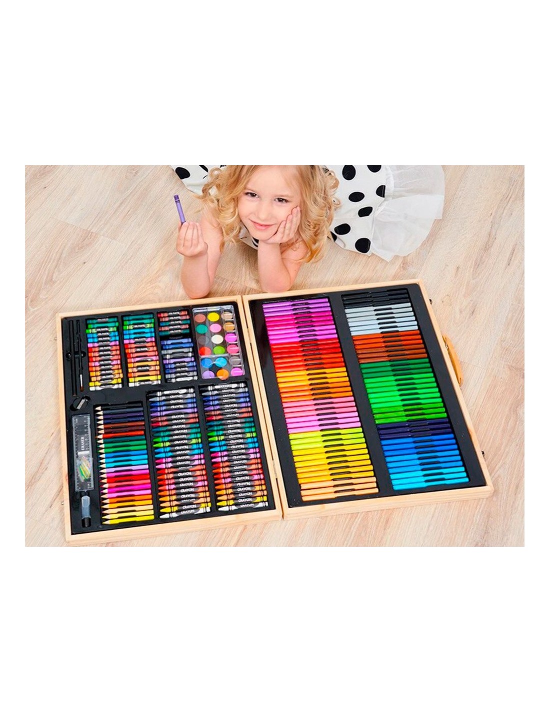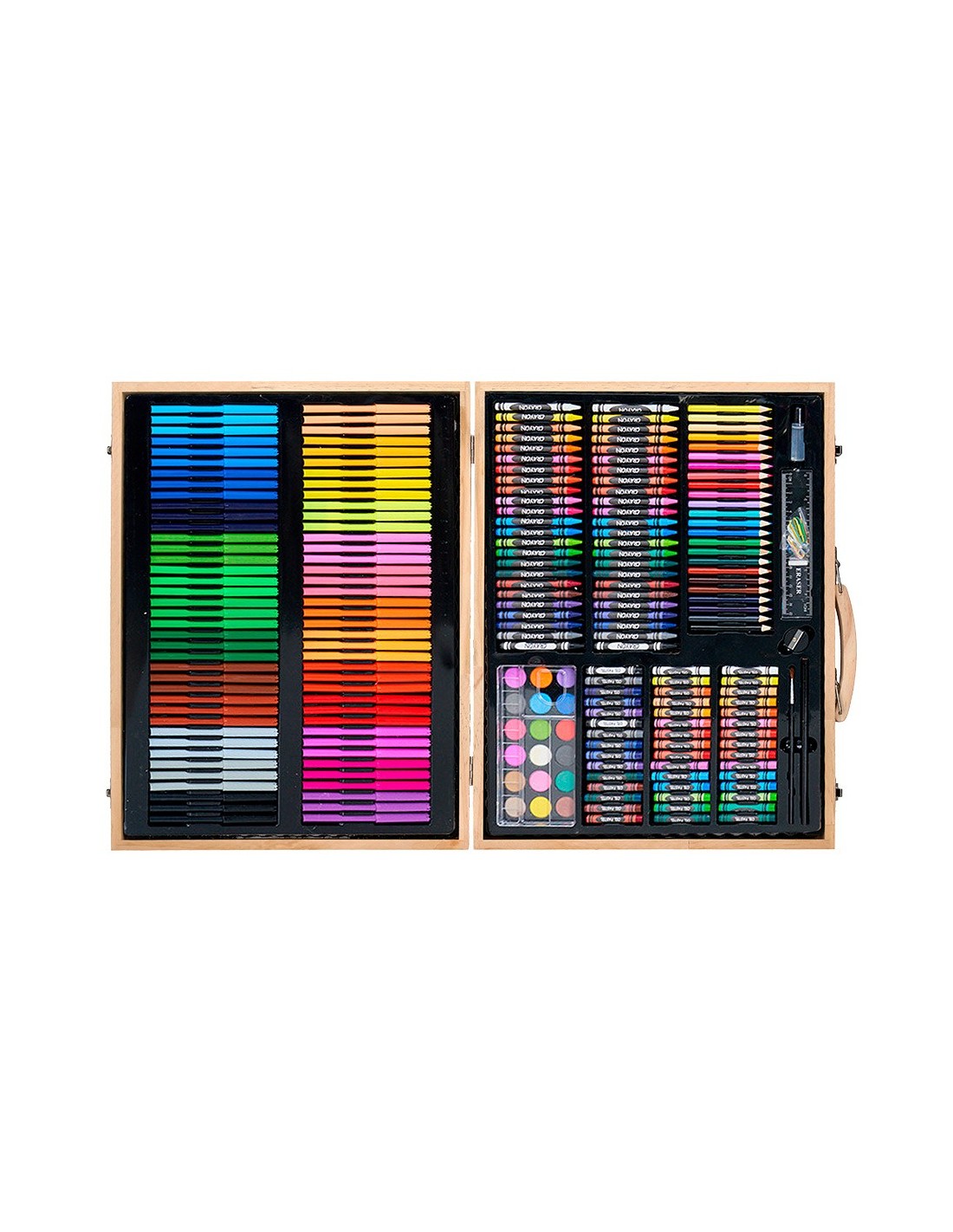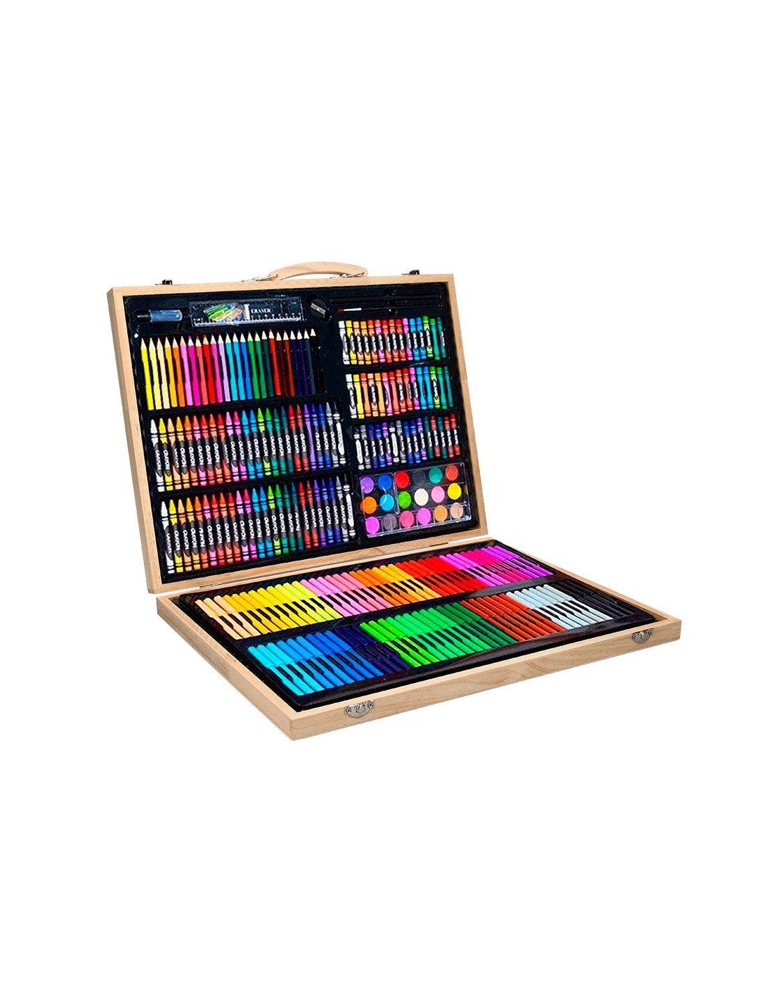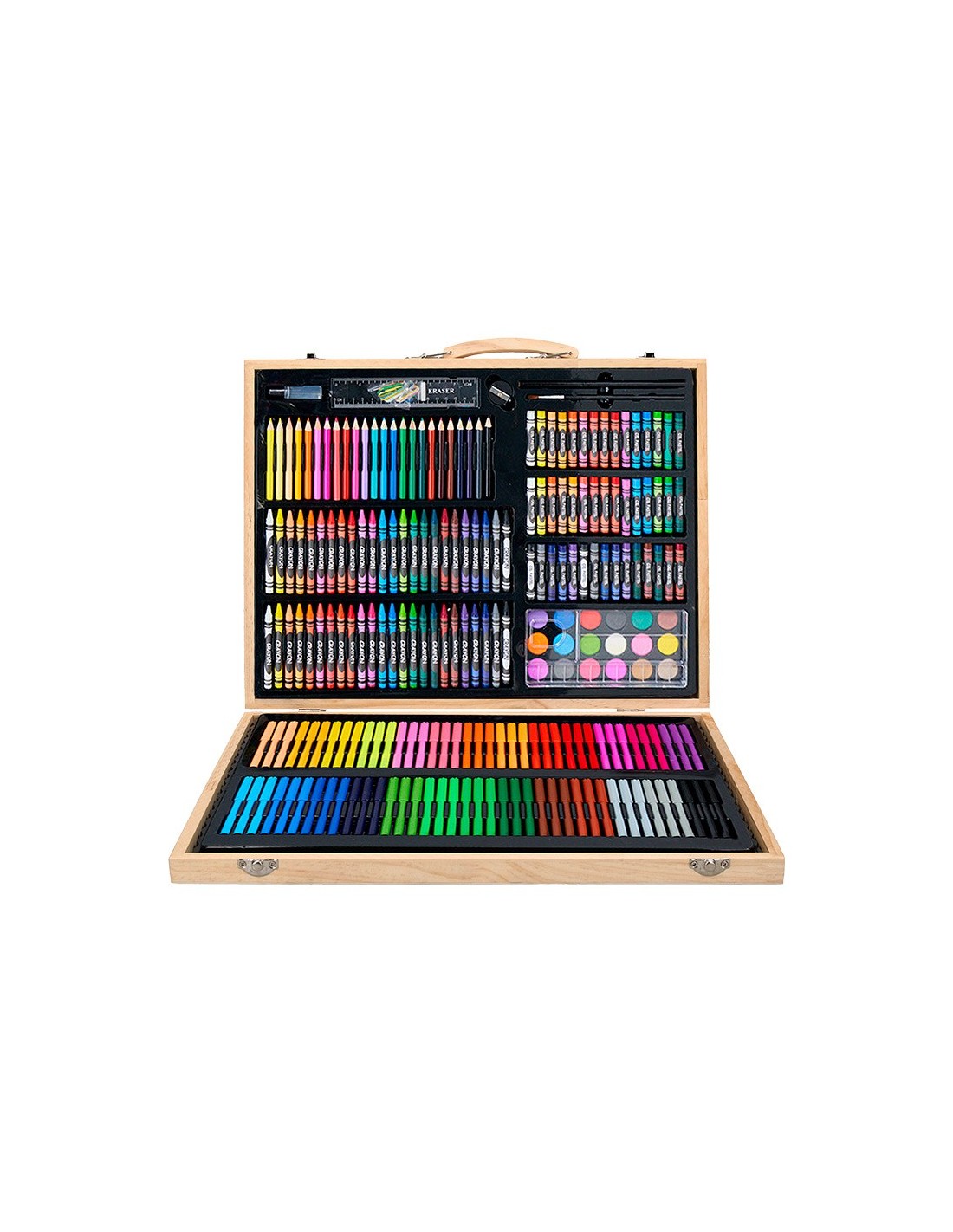 Conjunto de dibujo y coloración en elegante estuche de madera: elementos esenciales creativos para dibujar, colorear y hacer en cualquier momento y en cualquier lugar. Contenido: rotuladores de colores, lápices de colores, ceras de colores, ceras blandas de colores, colores de acuarela, clips, lápiz, pincel, pegamento, goma, sacapuntas, cola blanca y paleta.