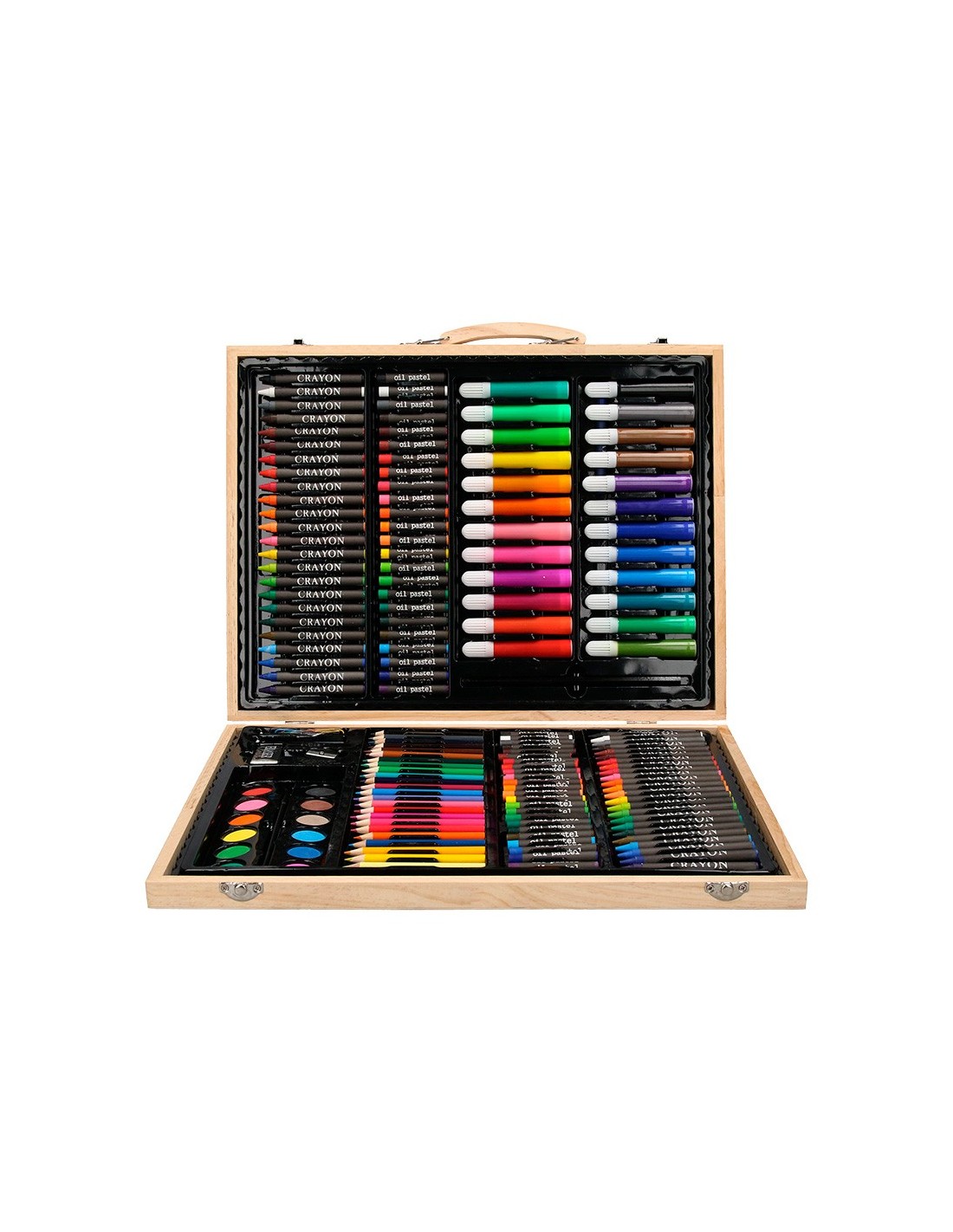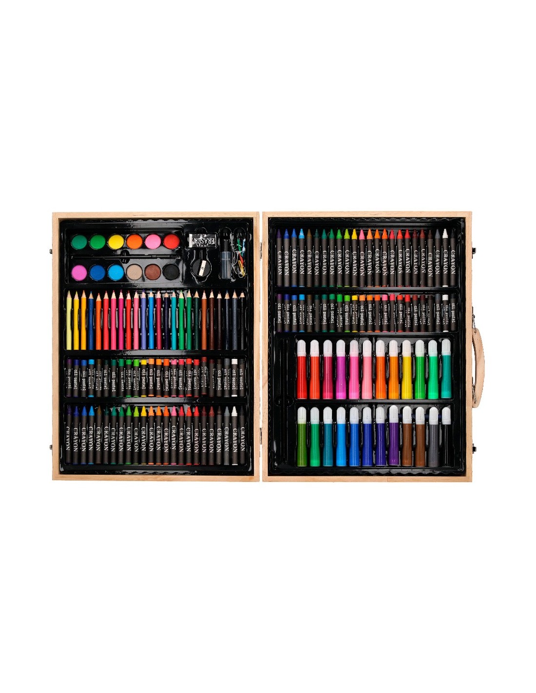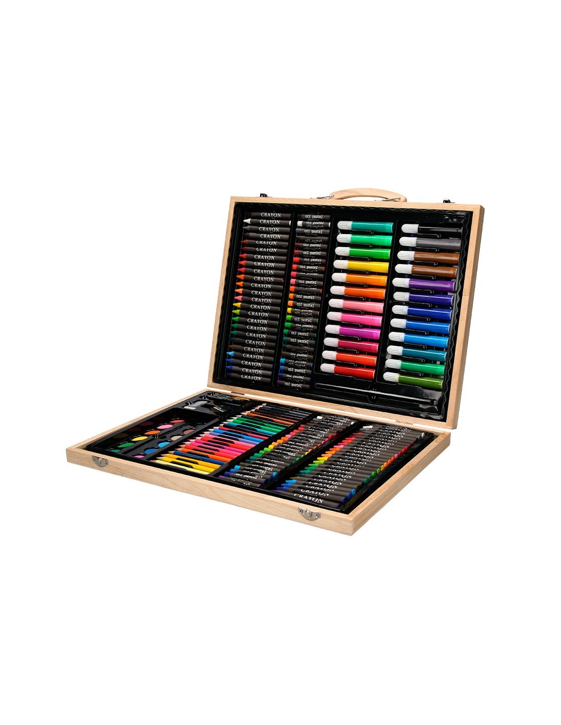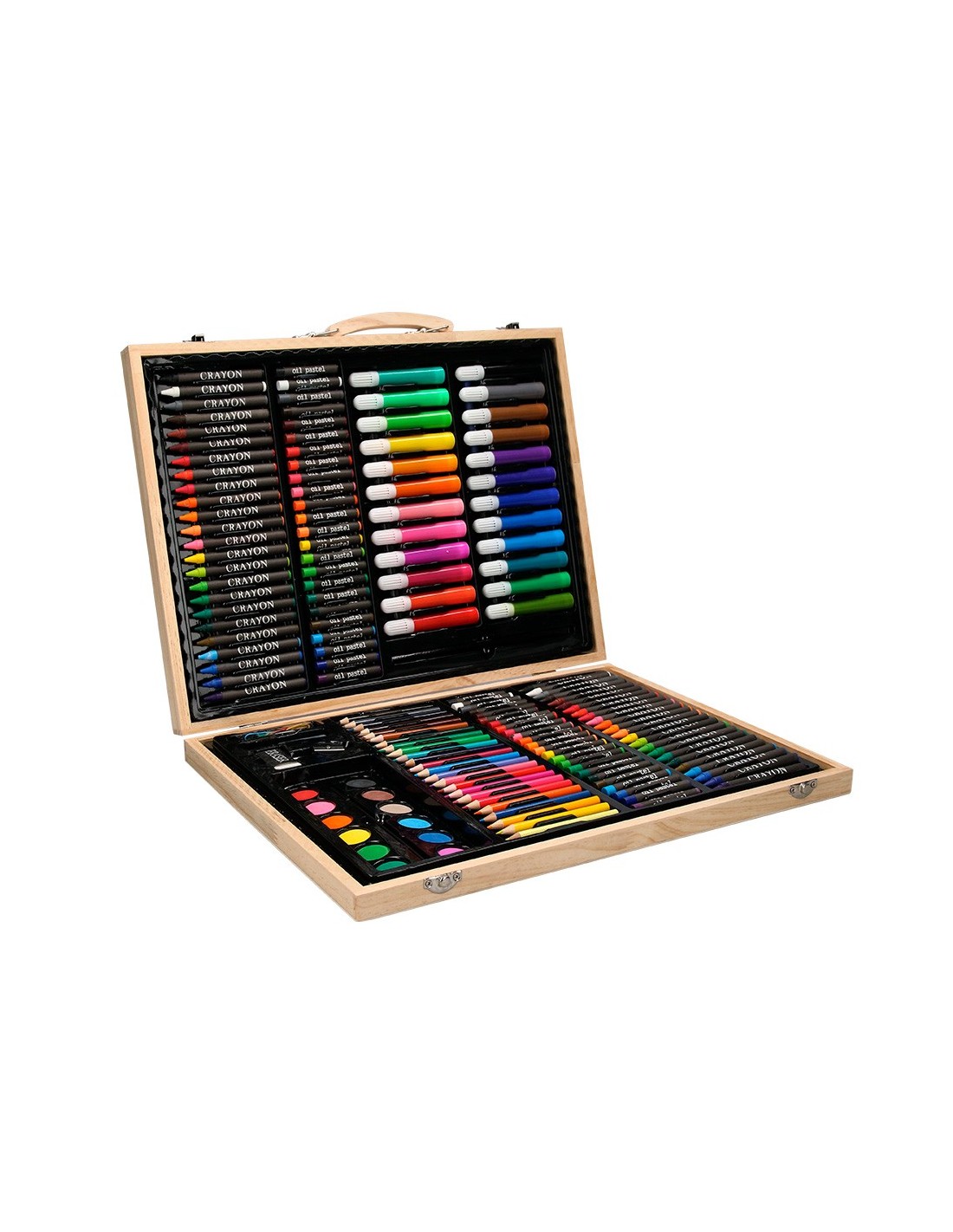 Conjunto de dibujo y coloración en elegante estuche de madera: elementos esenciales creativos para dibujar, colorear y hacer en cualquier momento y en cualquier lugar. Contenido: rotuladores de colores, lápices de colores, ceras de colores, ceras blandas de colores, colores de acuarela, clips, lápiz, pincel, pegamento, goma, sacapuntas, cola blanca y paleta.