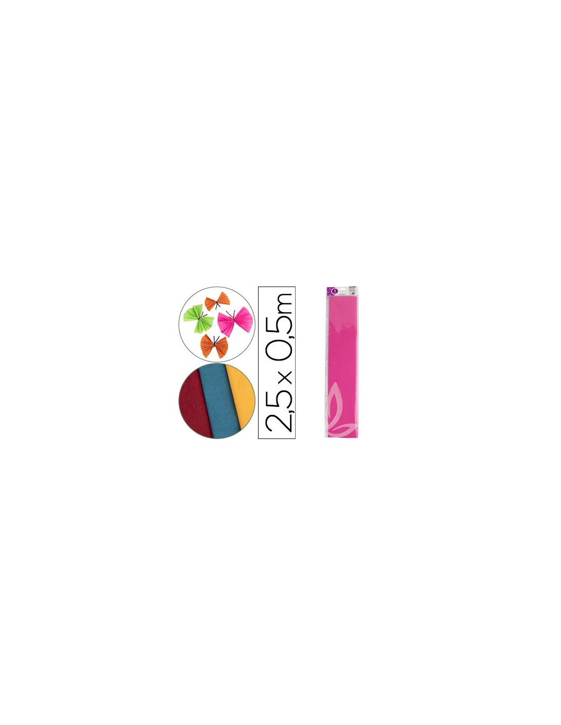 Gramaje 34 g/m² en colores clásicos y fluorescentes, 85 g/m² en colores clásicos (gramaje especial para floristerías) y 94 g/m² en colores metalizados. Resistencia al estiramiento (60% en clásicos y 35% en metalizados). Protegido en bolsa individual. Medidas: 50 x 2,5 m.