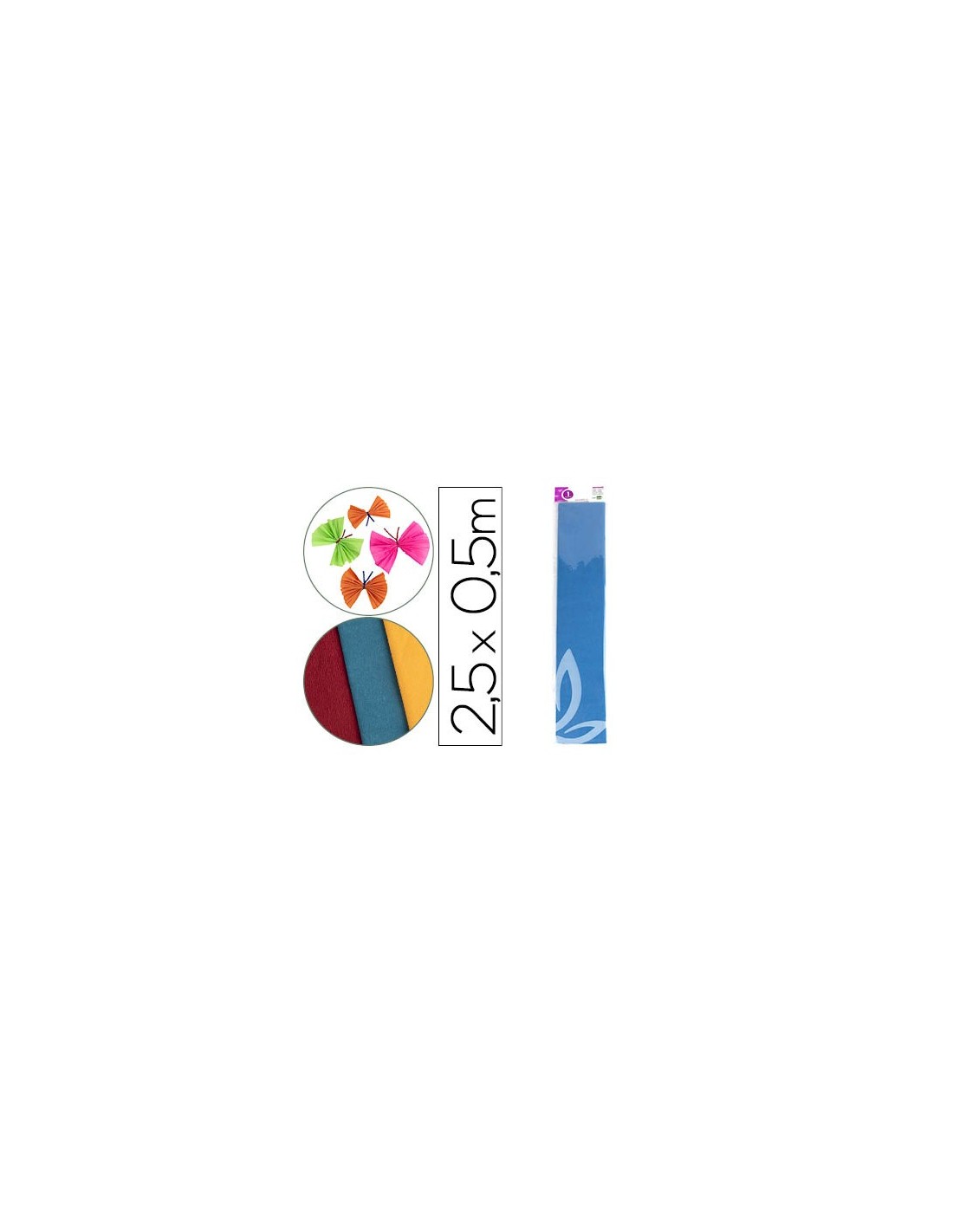 Gramaje 34 g/m² en colores clásicos y fluorescentes, 85 g/m² en colores clásicos (gramaje especial para floristerías) y 94 g/m² en colores metalizados. Resistencia al estiramiento (60% en clásicos y 35% en metalizados). Protegido en bolsa individual. Medidas: 50 x 2,5 m.
