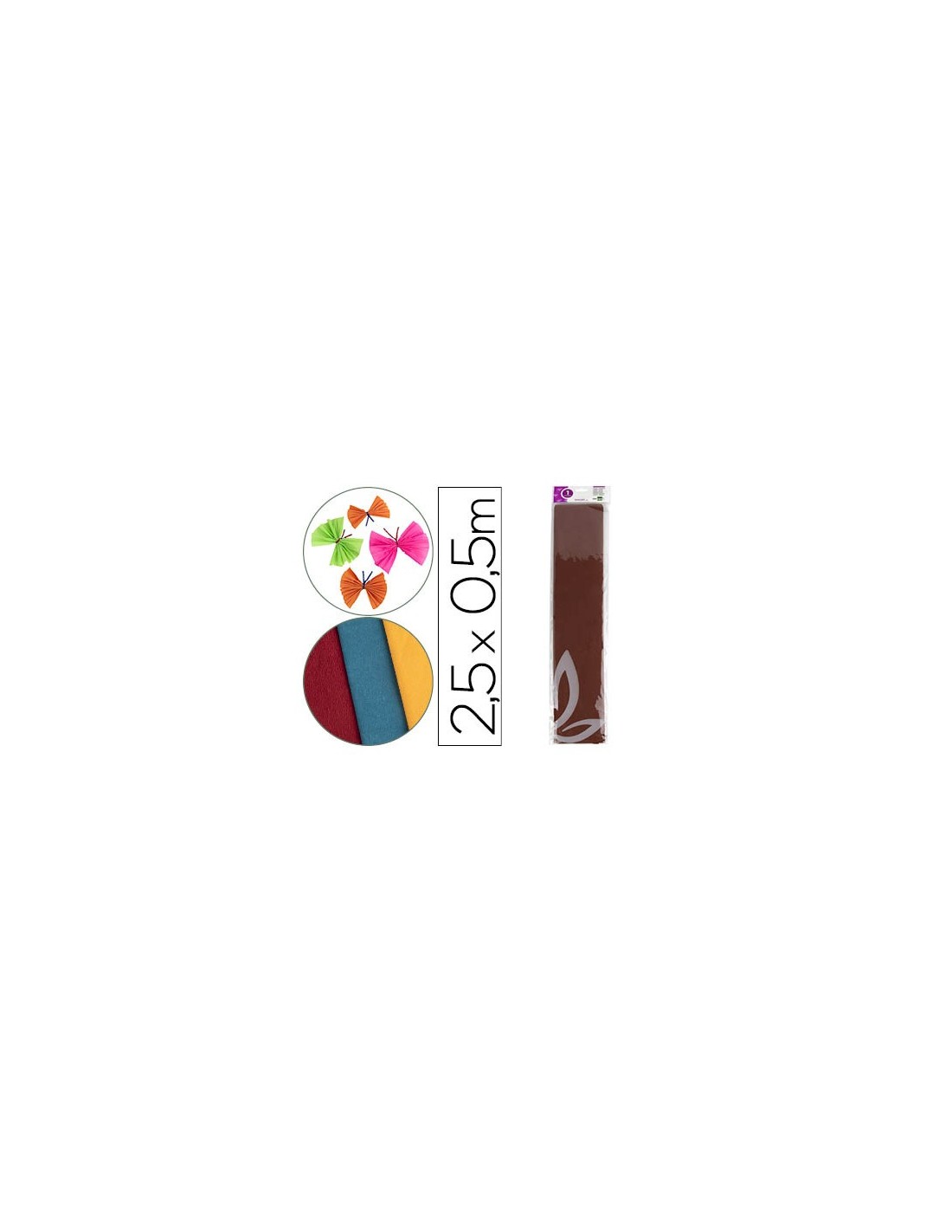 Gramaje 34 g/m² en colores clásicos y fluorescentes, 85 g/m² en colores clásicos (gramaje especial para floristerías) y 94 g/m² en colores metalizados. Resistencia al estiramiento (60% en clásicos y 35% en metalizados). Protegido en bolsa individual. Medidas: 50 x 2,5 m.