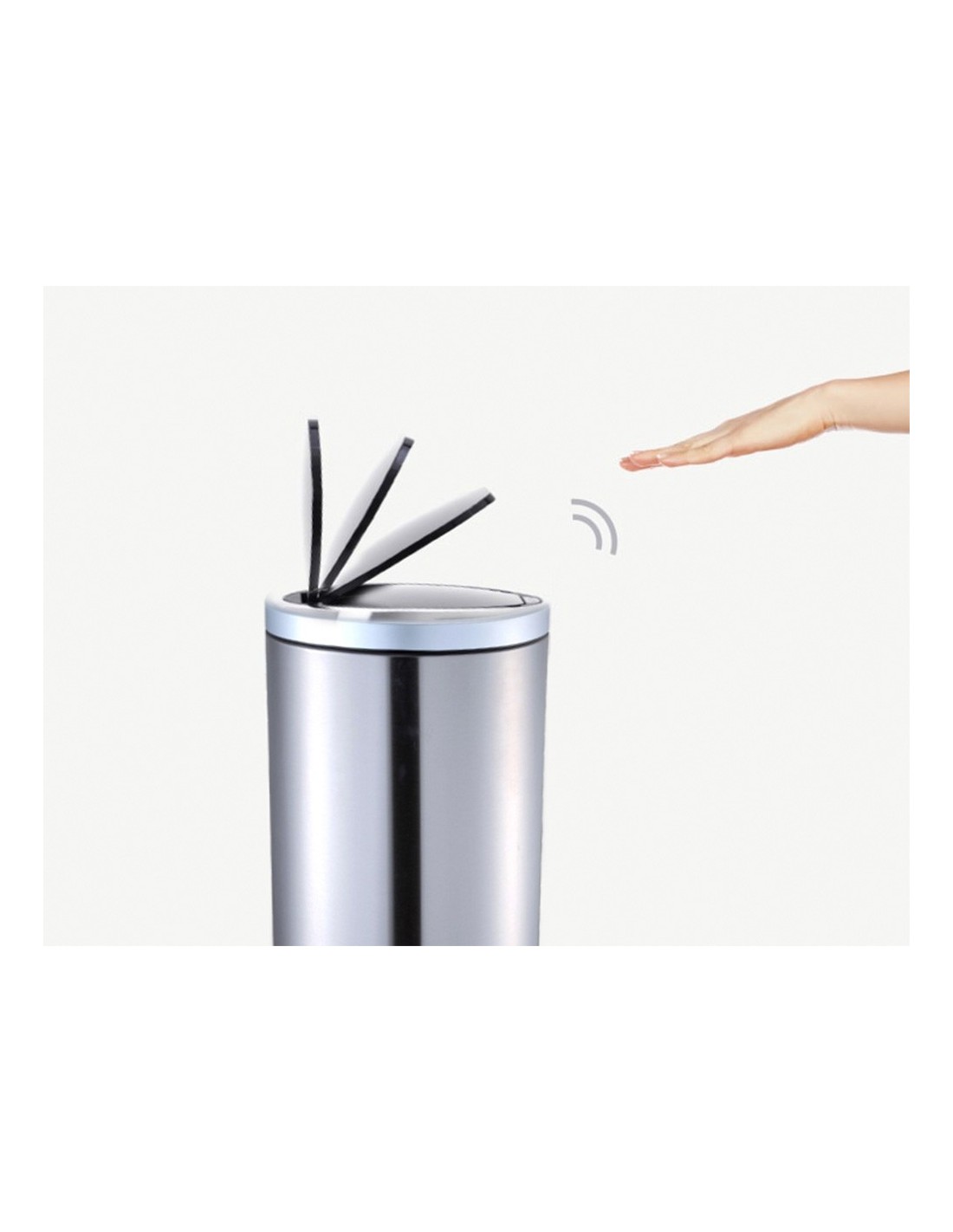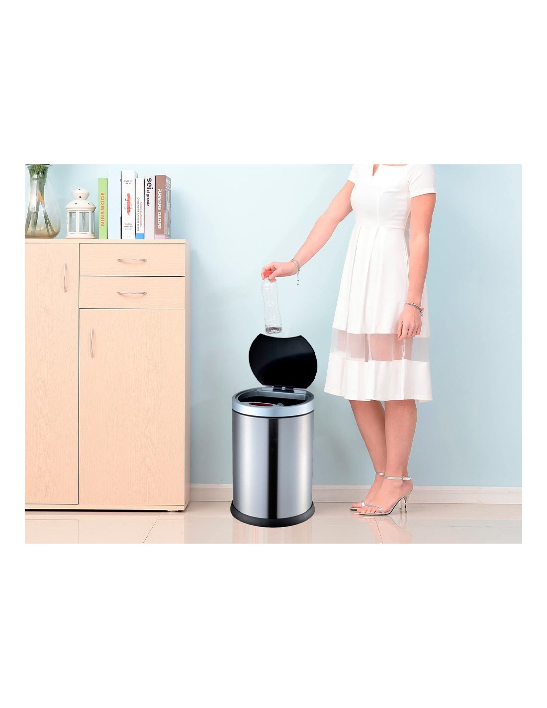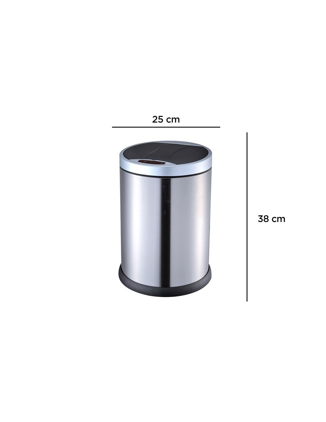 Papelera fabricada en metal con acabado espejo. Con sistema de apertura automática que detecta los movimientos. Resistente, higiénico y seguro. Funciona con pilas. Pilas no incluidas. Ideal para oficinas y restaurantes.