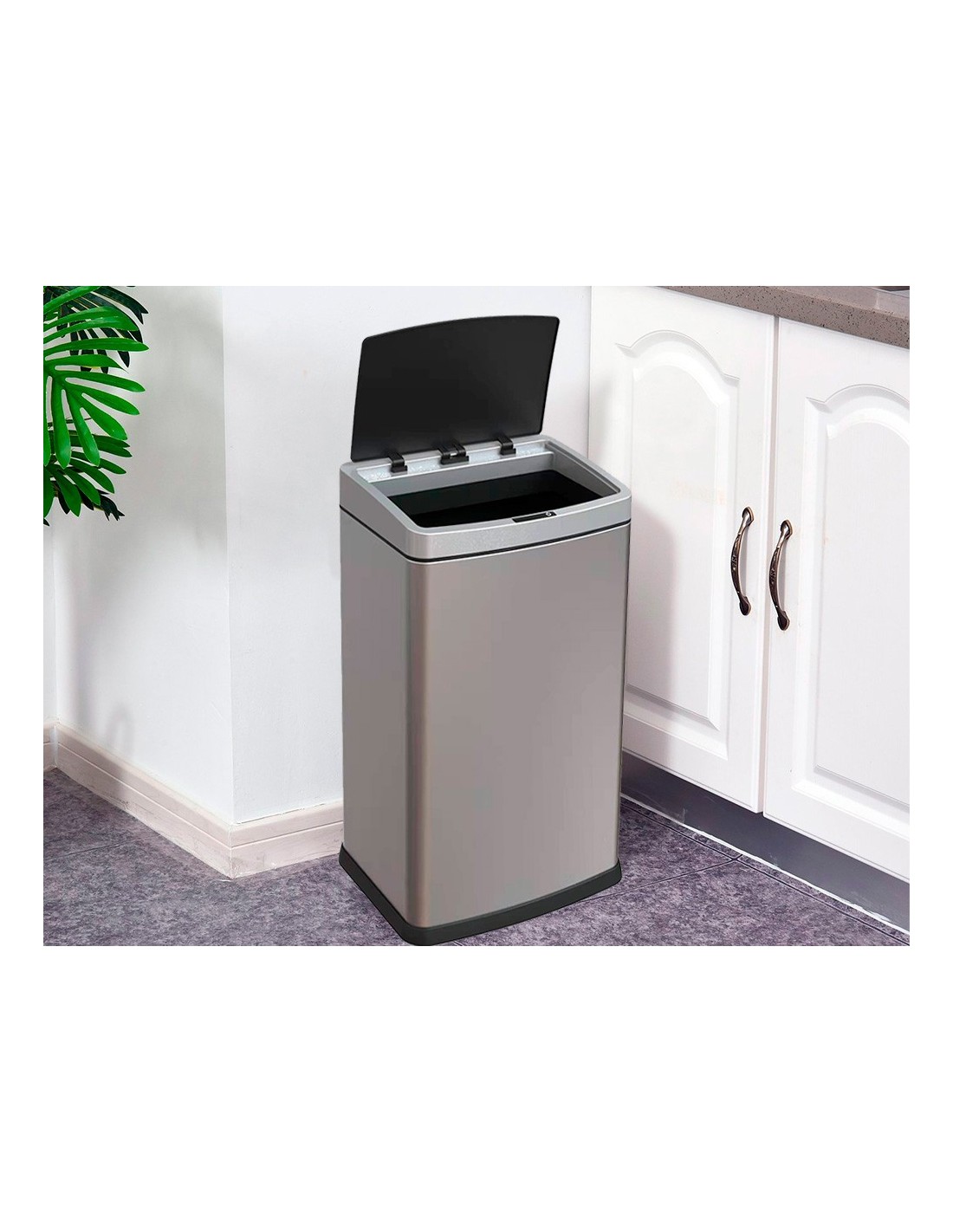 Papelera fabricada en metal con acabado espejo. Con sistema de apertura automática que detecta los movimientos. Resistente, higiénico y seguro. Funciona con pilas. Pilas no incluidas. Ideal para oficinas y restaurantes.
