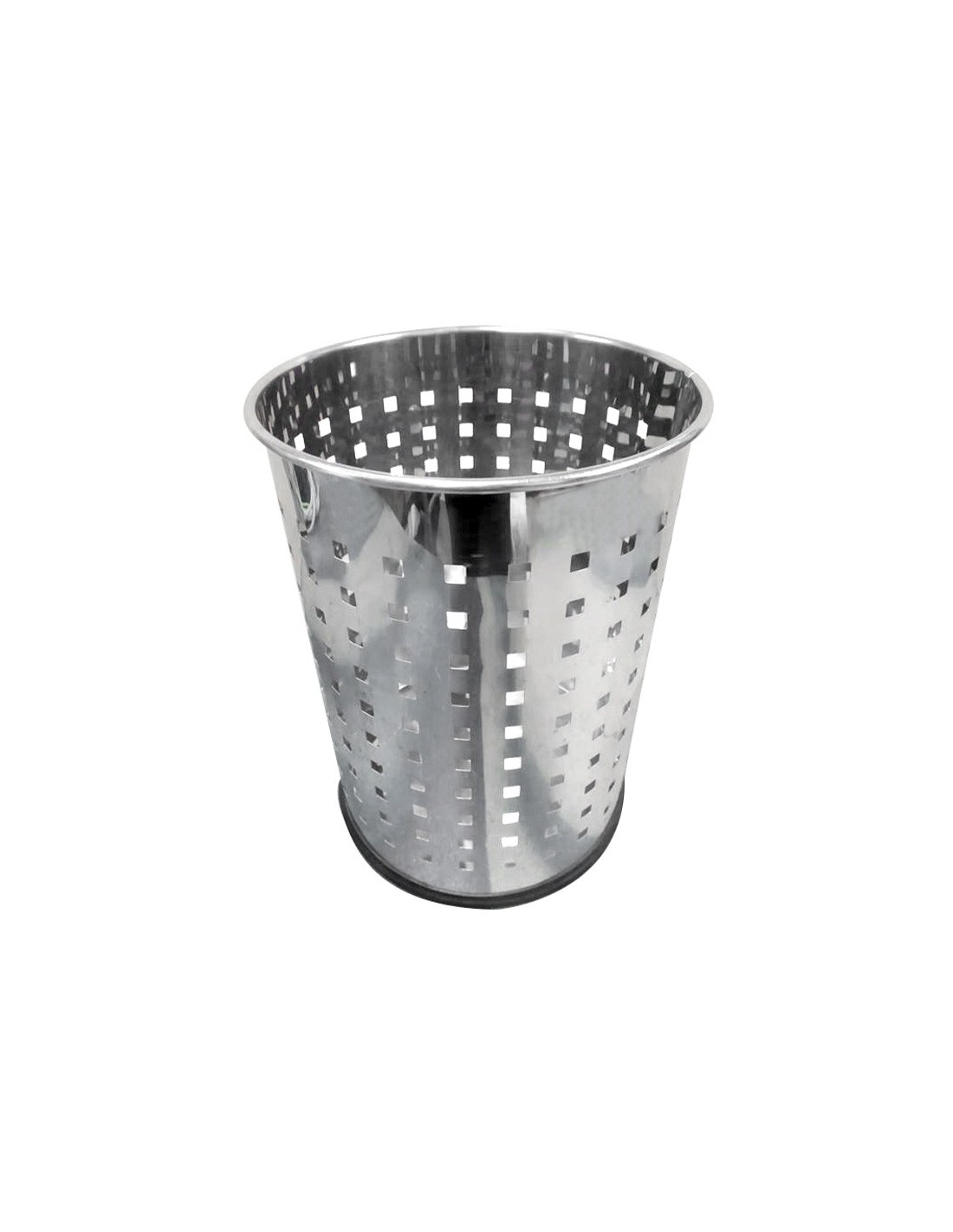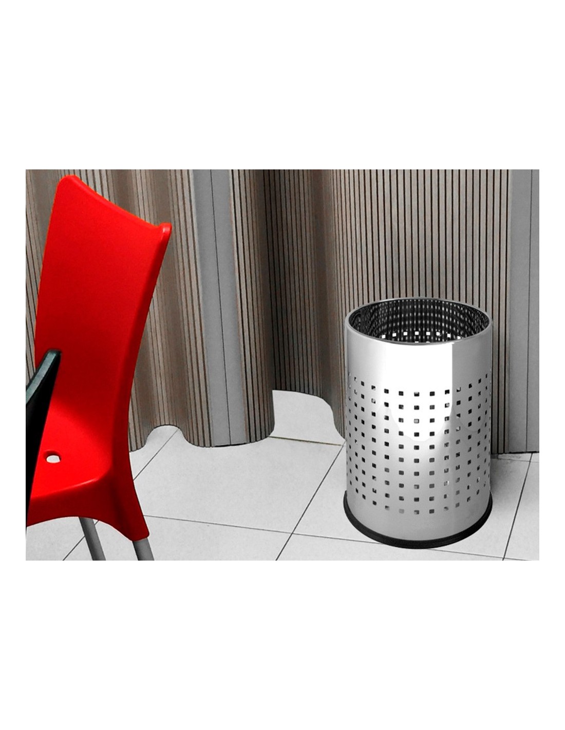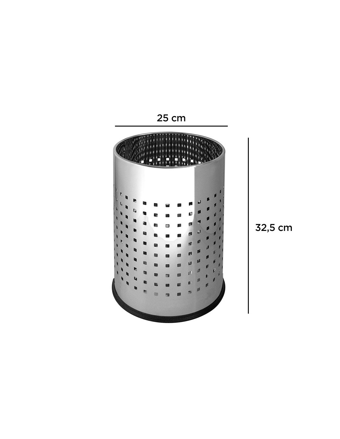 Papelera metálica con forma redonda. Aro inferior fabricado en PVC. Acabado cromado. Perforada. Capacidad: 12 litros. Medidas: Ø 25 x 32,5 cm.