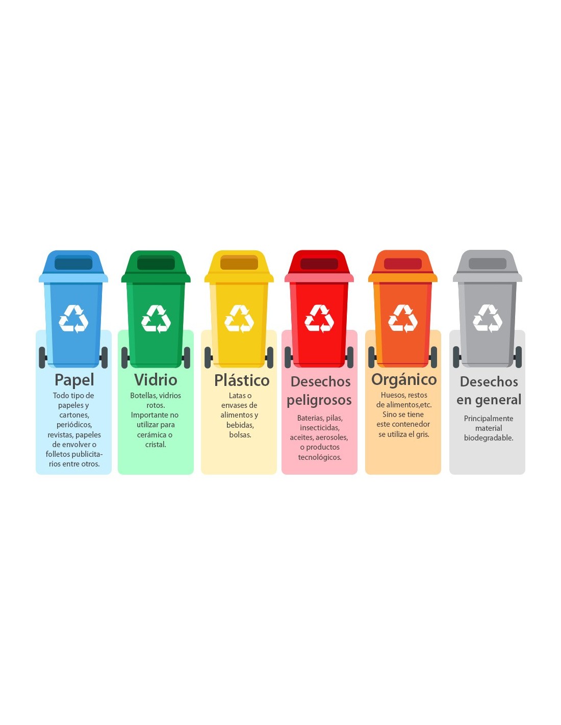Fabricada en plástico resistente. Con diferentes colores para facilitar el reciclaje. Capacidad: 100 litros. Medidas: 37 x 75 x 47 cm.