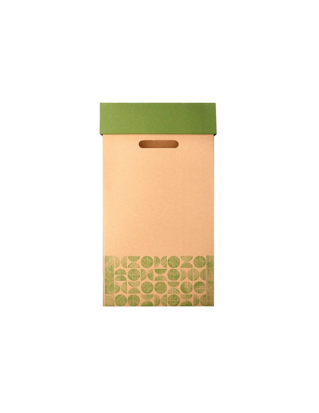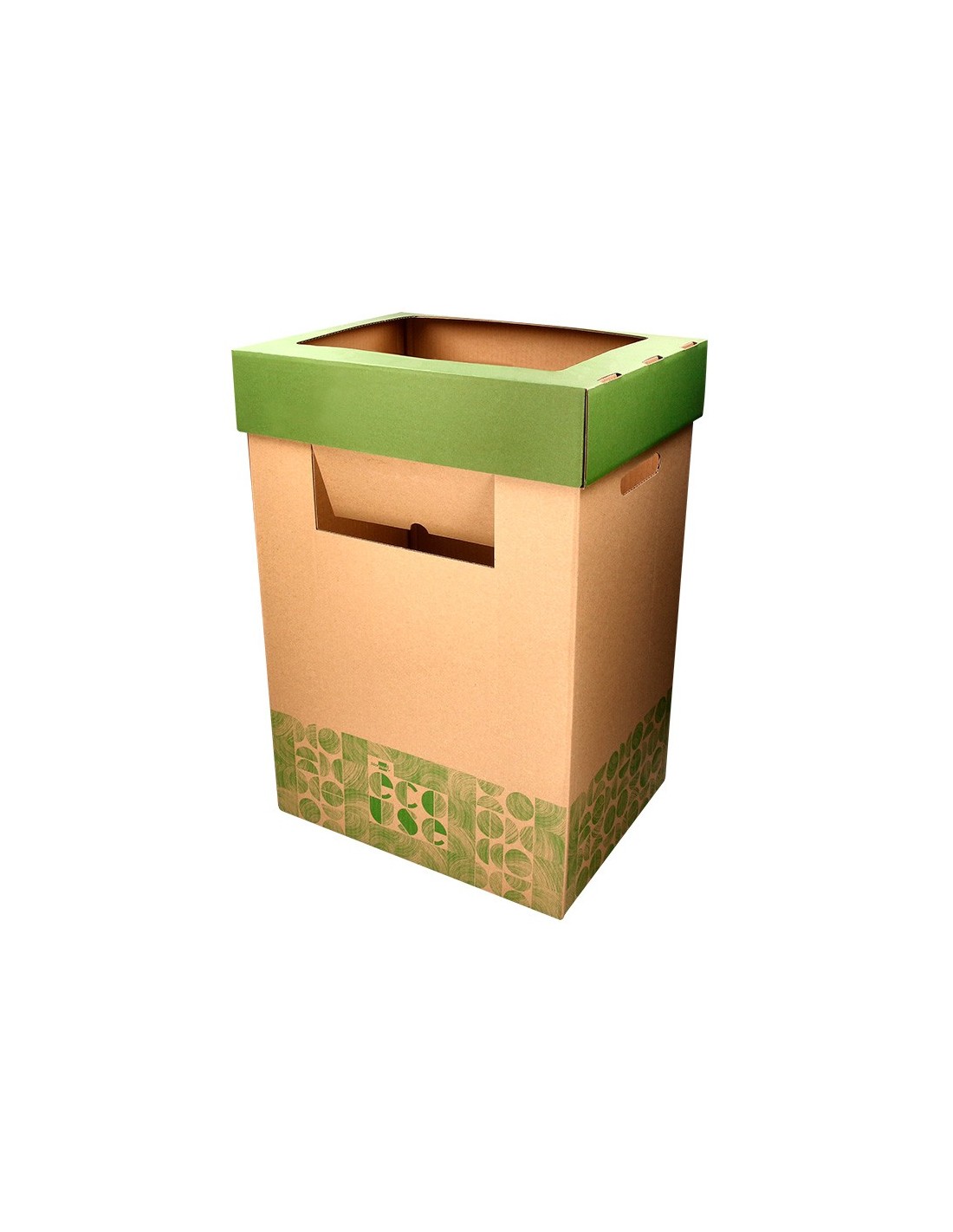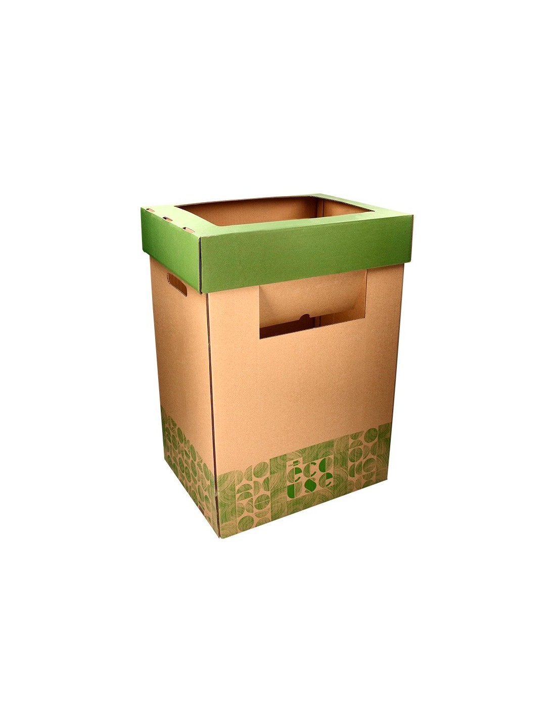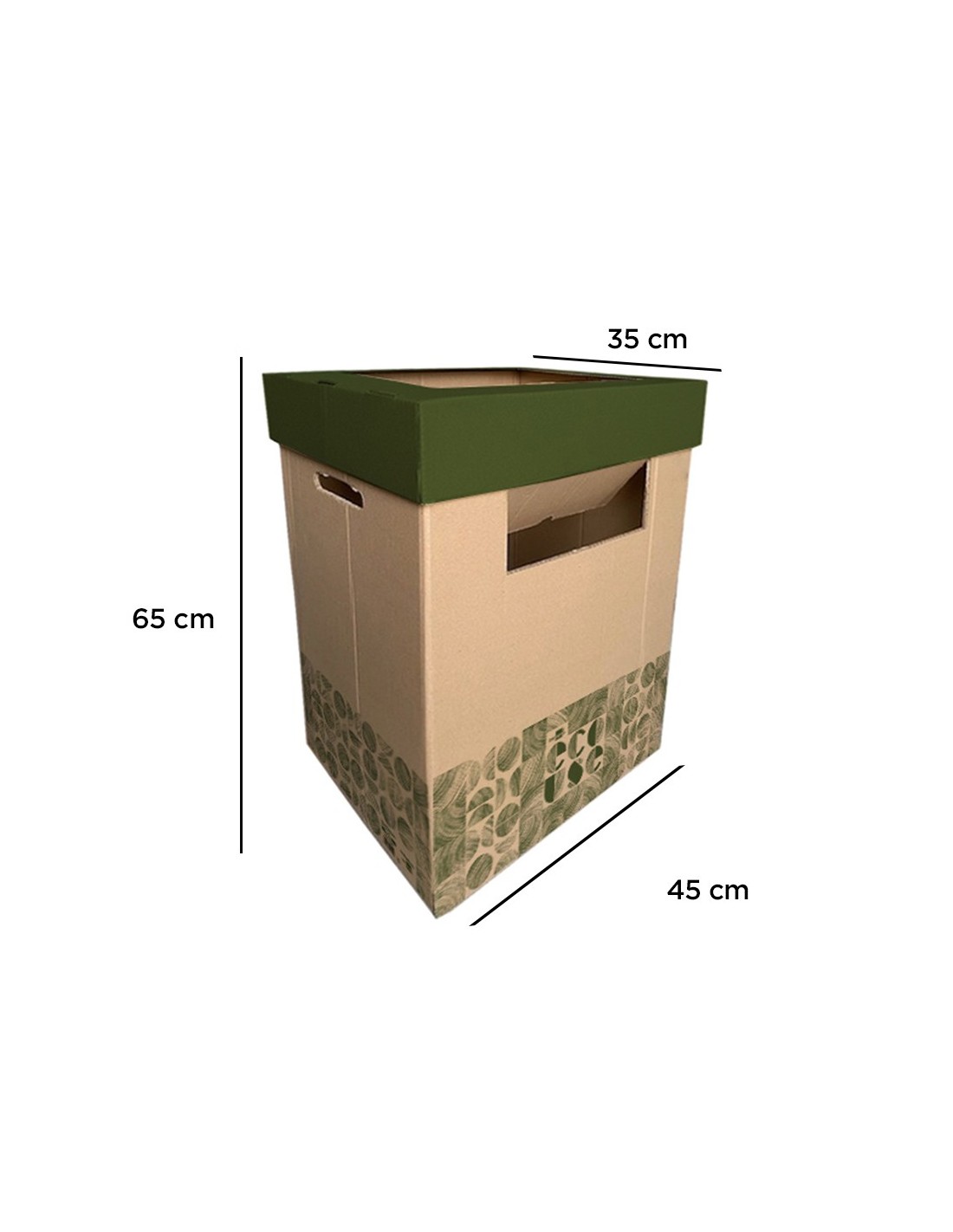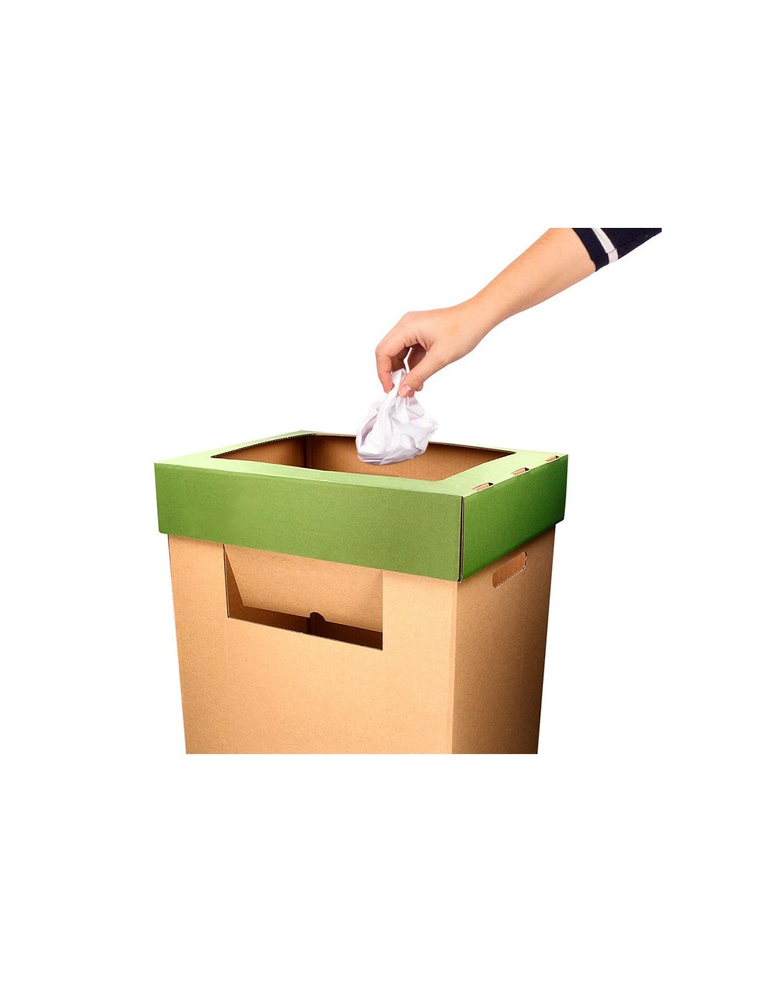 Papelera de gran capacidad fabricada en cartón de doble grosor y gran resistencia. 100% reciclada y reciclable. Sencillo montaje manual. Doble entrada disponible tanto superior o frontal. Capacidad: 70 litros. Medidas: 45 x 65 x 35 cm.