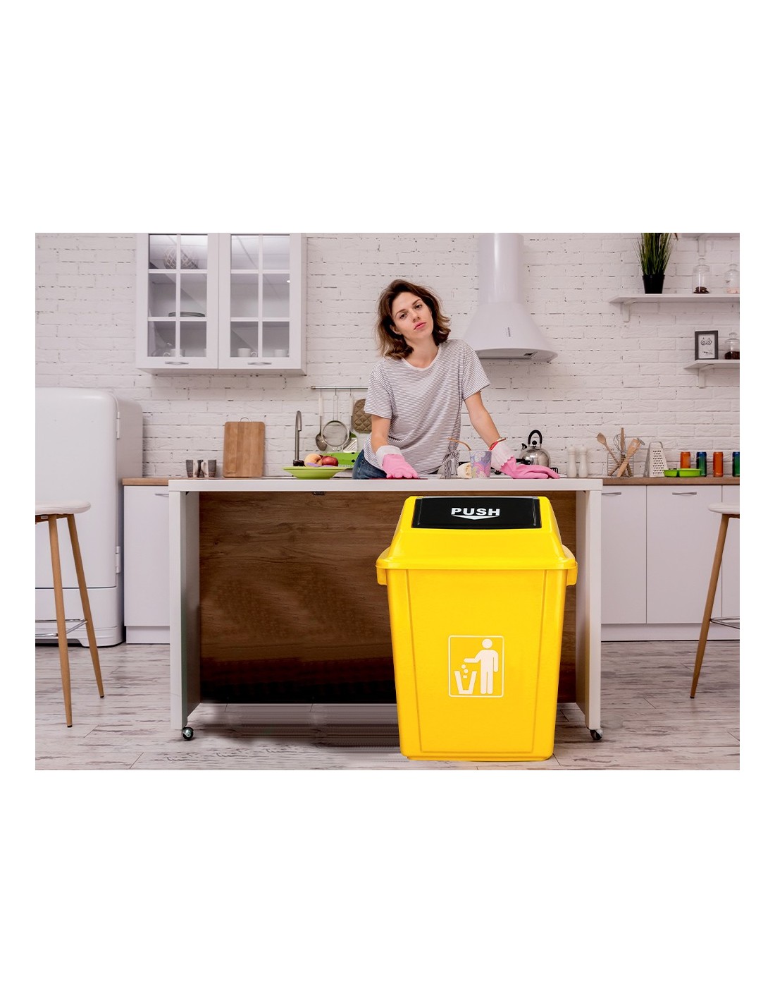 Fabricado en plástico resistente. Tapa de balancín, con 2 asas para facilitar el transporte. Capacidad 58 litros. Color amarillo. Medidas: 470x330x760 mm.