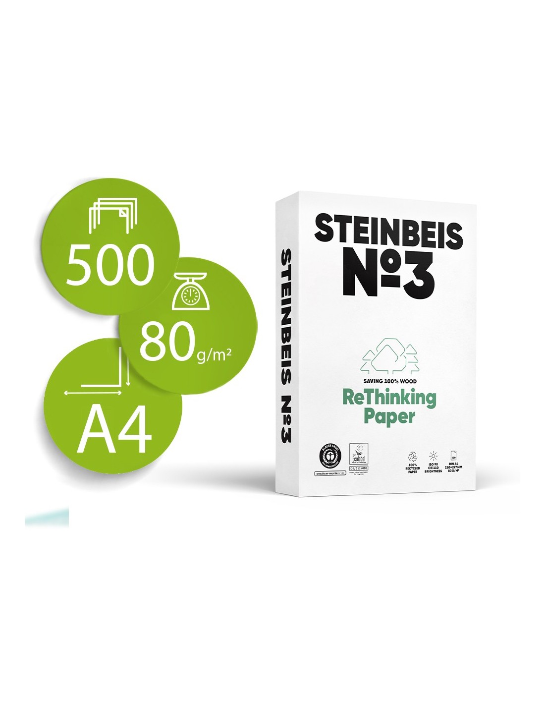 PAPEL FOTOCOPIADORA STEINBEIS N.3 100% RECICLADO A4 80 GR PQ.DE 500H.