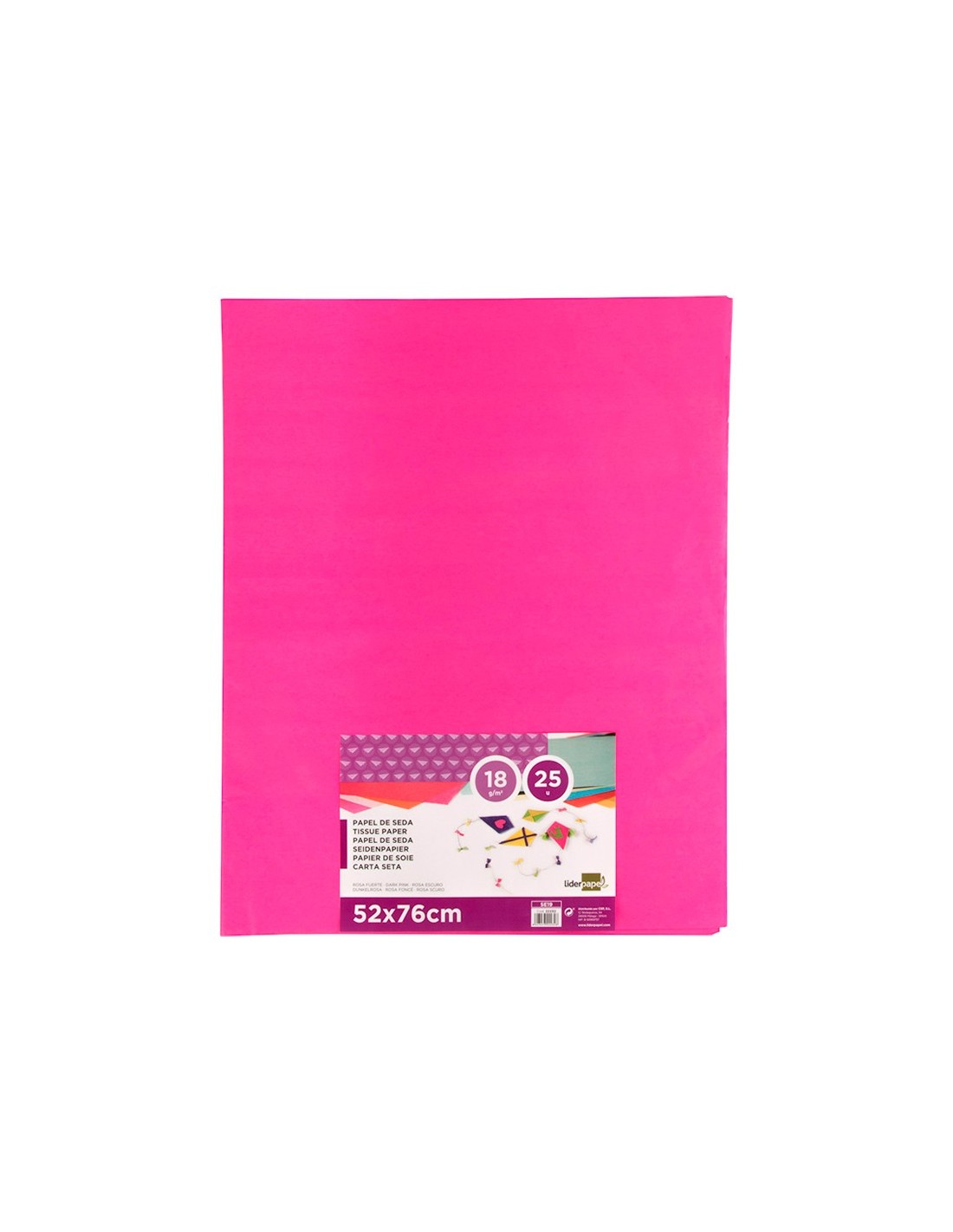 Gramaje: 18 g/m². Papel de seda, coloreado en masa, presentado en paquetes de 25 hojas. Aplicación: manualidades, decoración, etc. Medidas de la hoja: 52 x 76 cm.