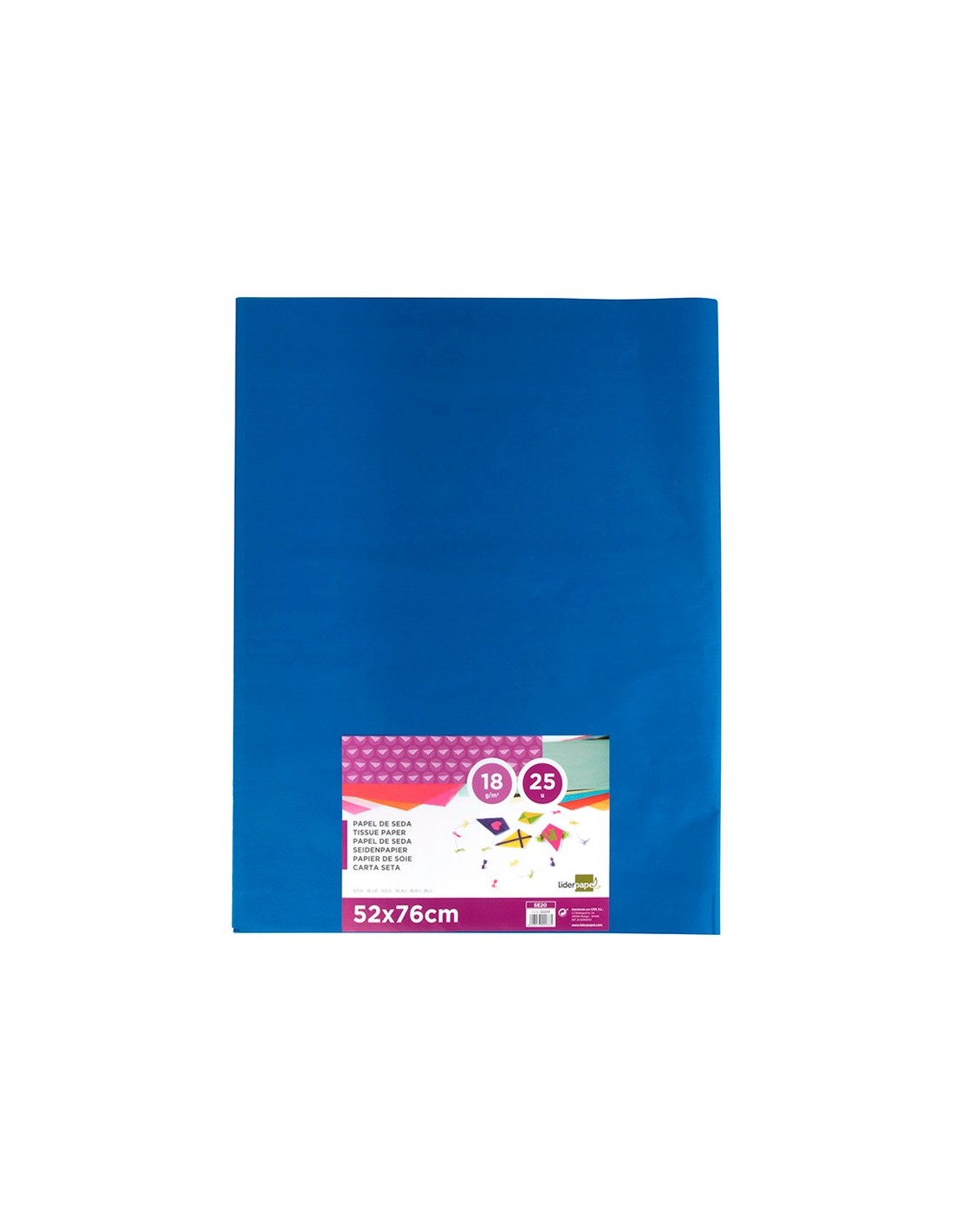 Gramaje: 18 g/m². Papel de seda, coloreado en masa, presentado en paquetes de 25 hojas. Aplicación: manualidades, decoración, etc. Medidas de la hoja: 52 x 76 cm.
