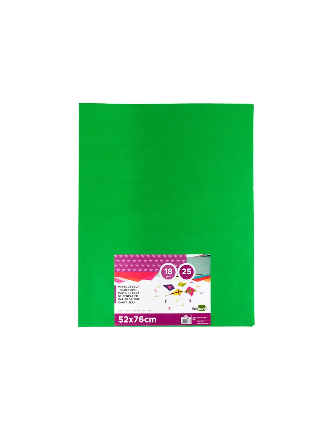 Gramaje: 18 g/m². Papel de seda, coloreado en masa, presentado en paquetes de 25 hojas. Aplicación: manualidades, decoración, etc. Medidas de la hoja: 52 x 76 cm.