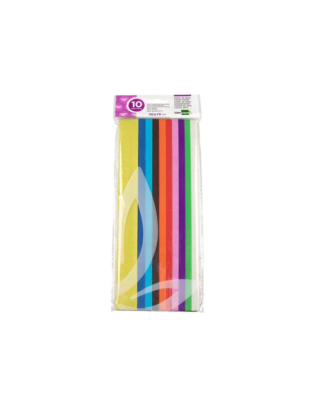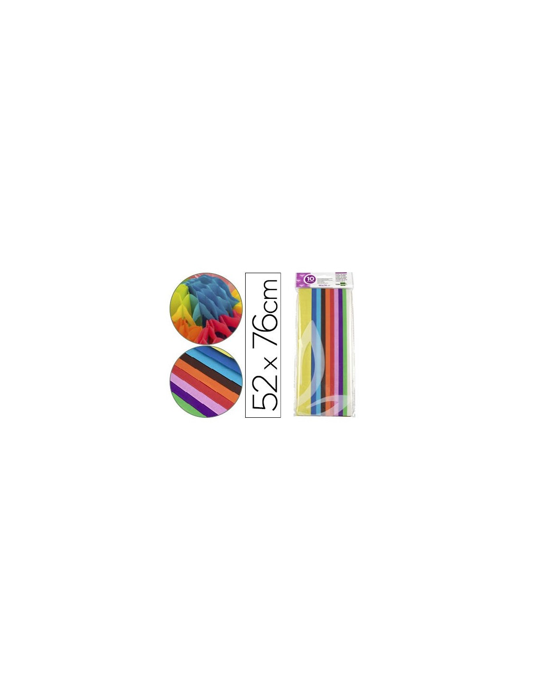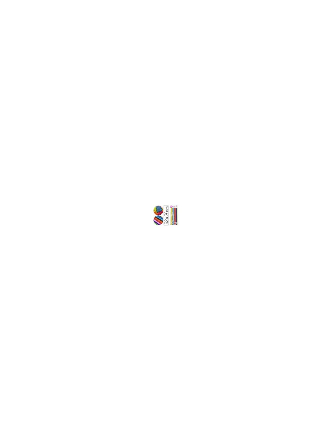 Gramaje: 18 g/m². Aplicación: manualidades, decoración, etc. Colores muy vivos e intensos. Cómoda presentación en bolsas de celofán. Medidas de la hoja: 52 x 76 cm. La bolsa de 5 unidades.