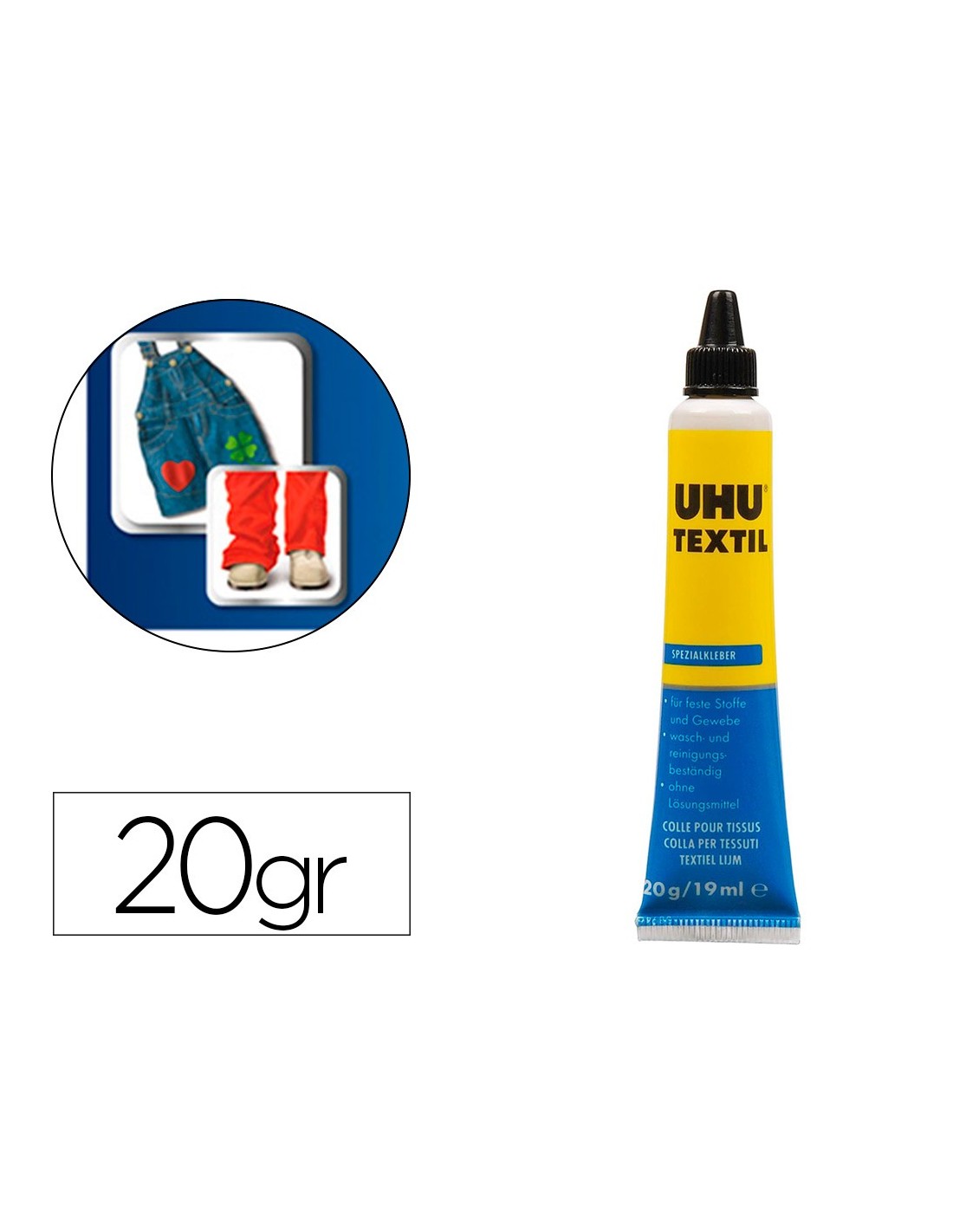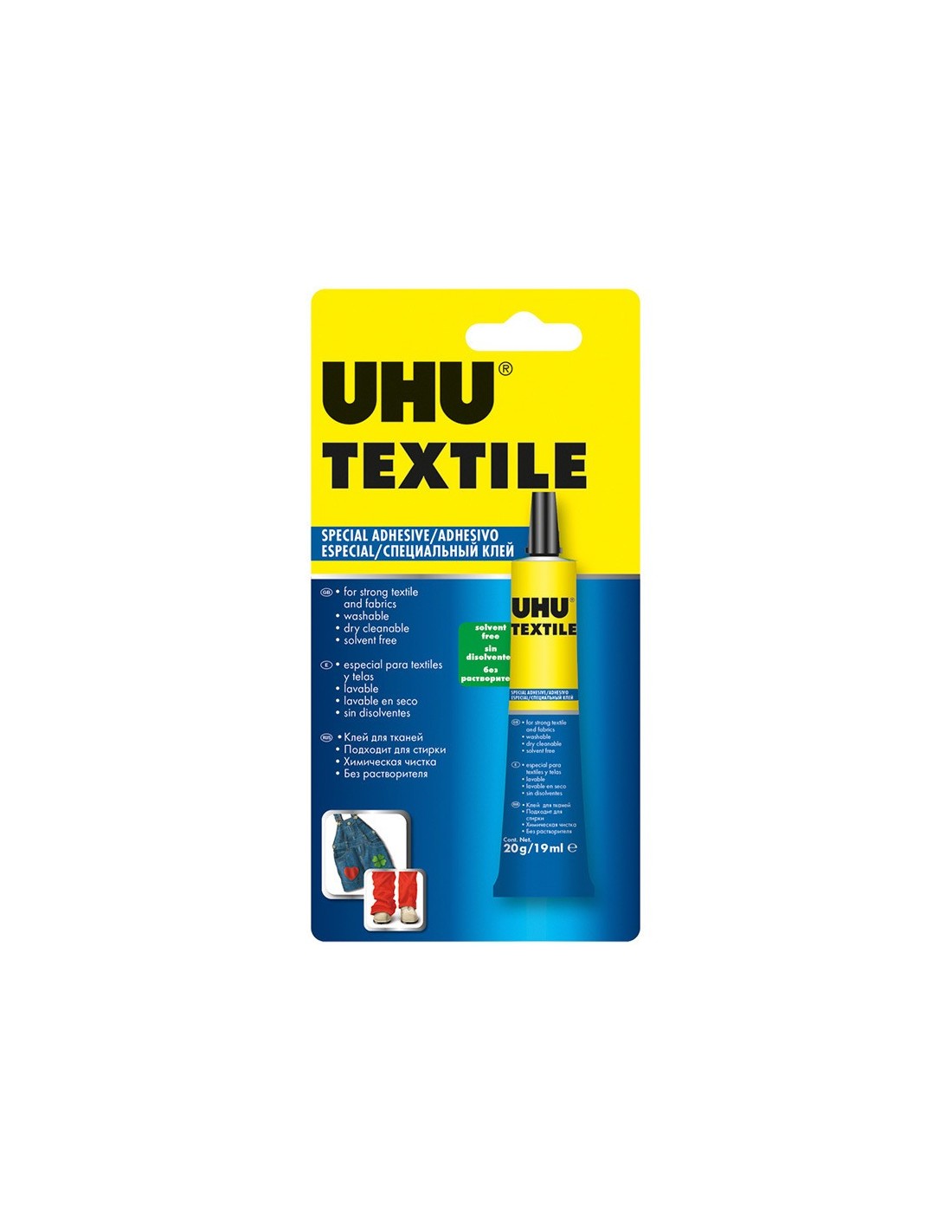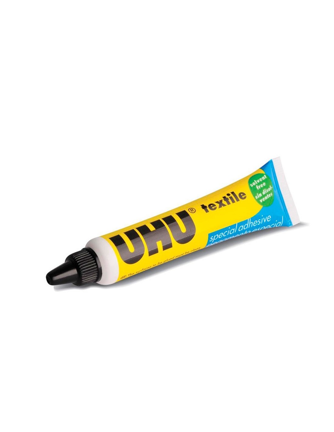 Pegamento especial sin disolventes para pegar algodón, tejidos con algodón, tela vaquera, cuerdas, fieltro y fibras de coco entre sí o a madera y cuero. El pegamento especial UHU TEXTIL blanco se vuelve transparente cuando se endurece, es muy flexible, se puede lavar a 90°C y puede plancharse y limpiarse en seco. El planchado después del secado (aprox. 30 min) puede mejorar la resistencia al lavado y a la limpieza en seco.