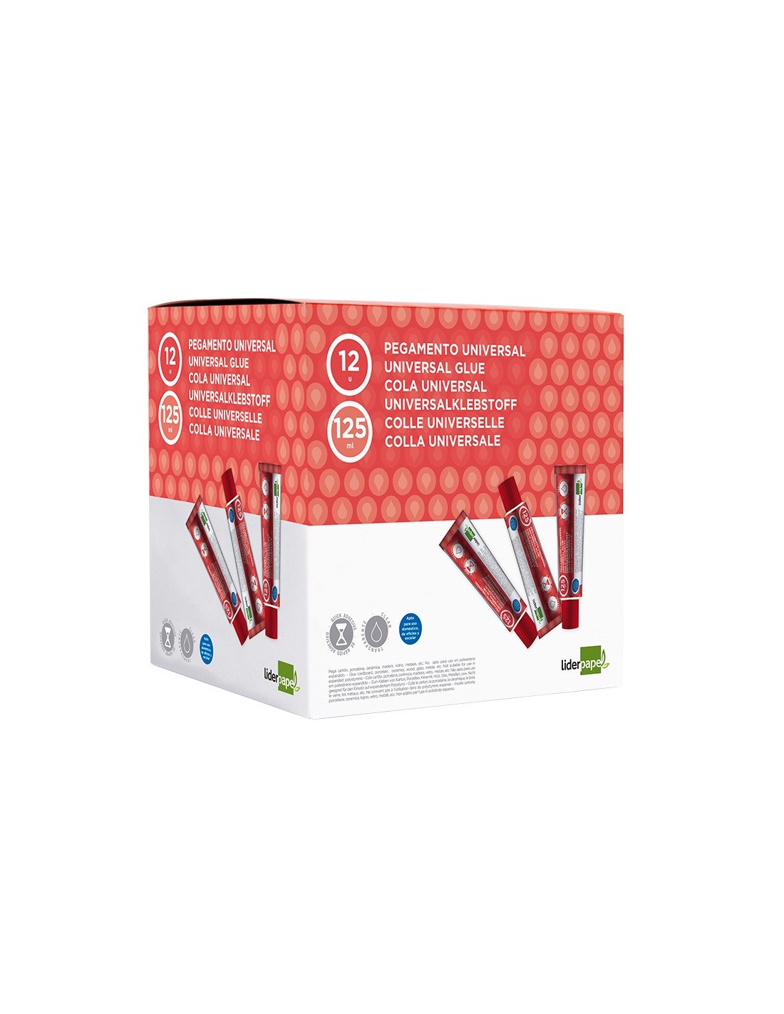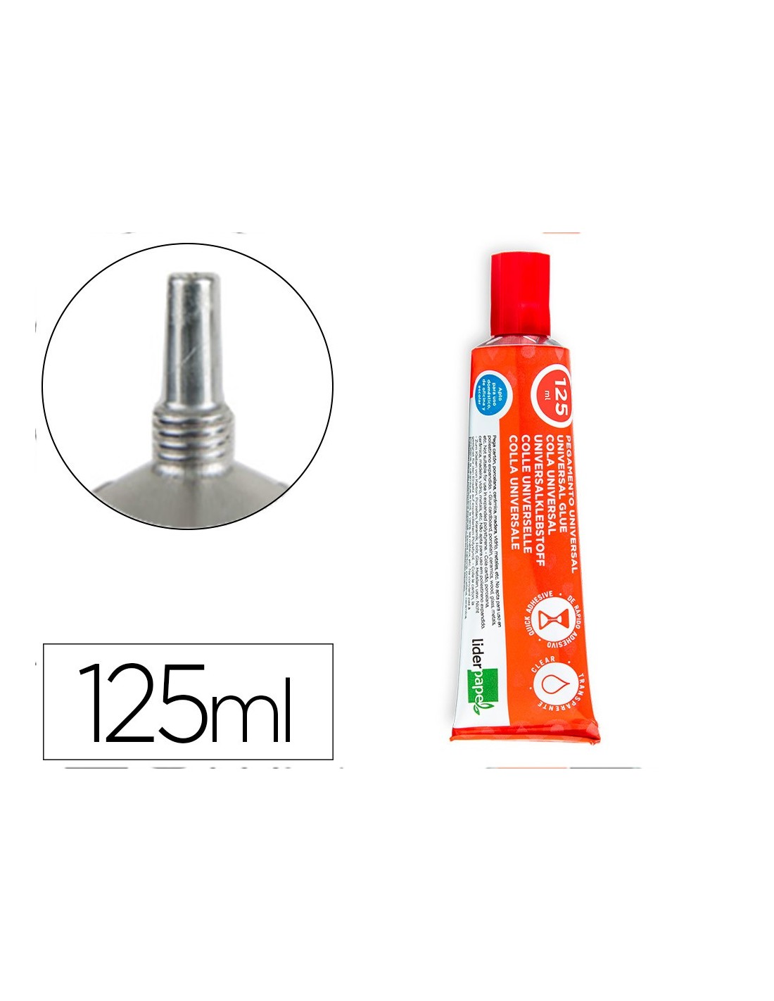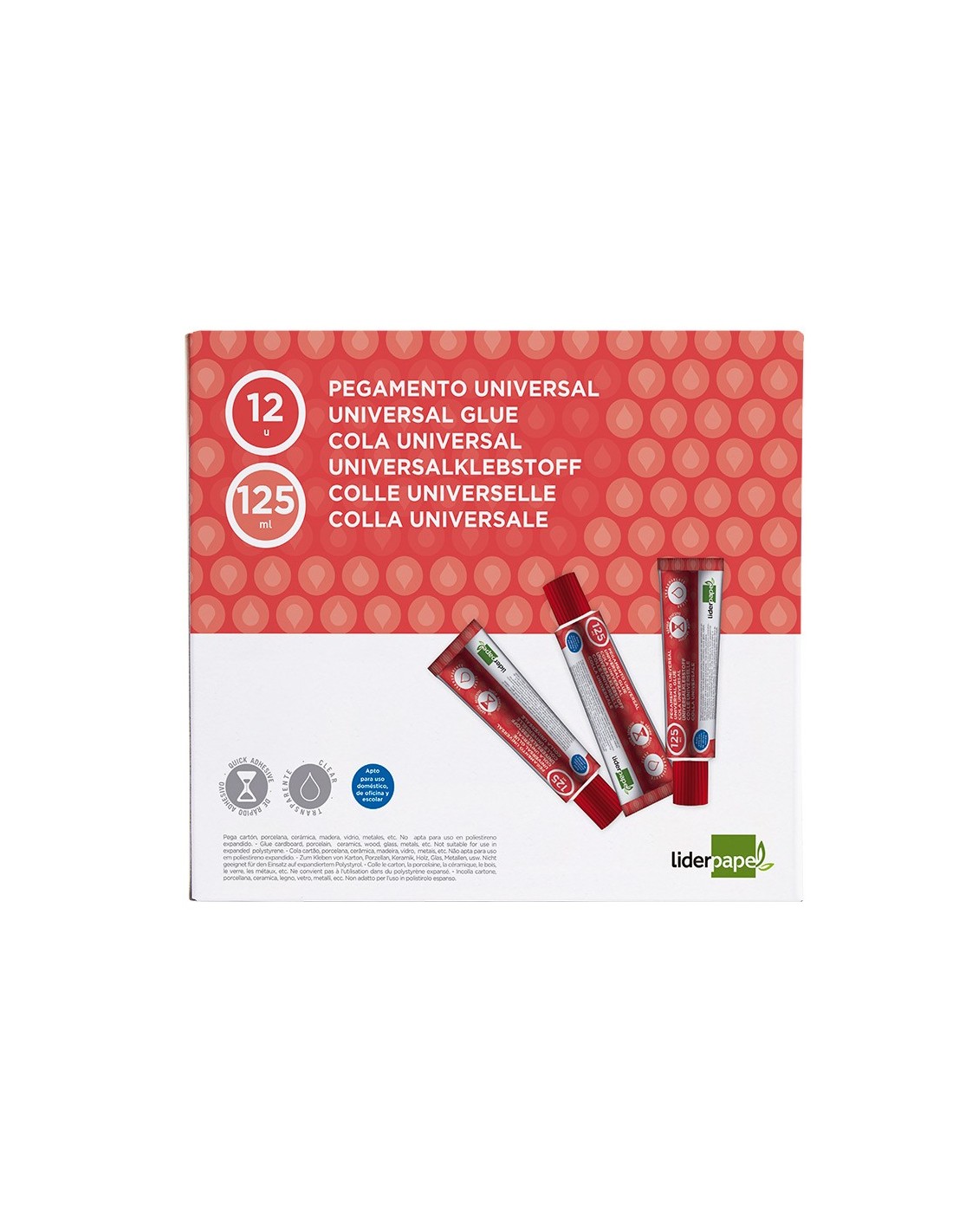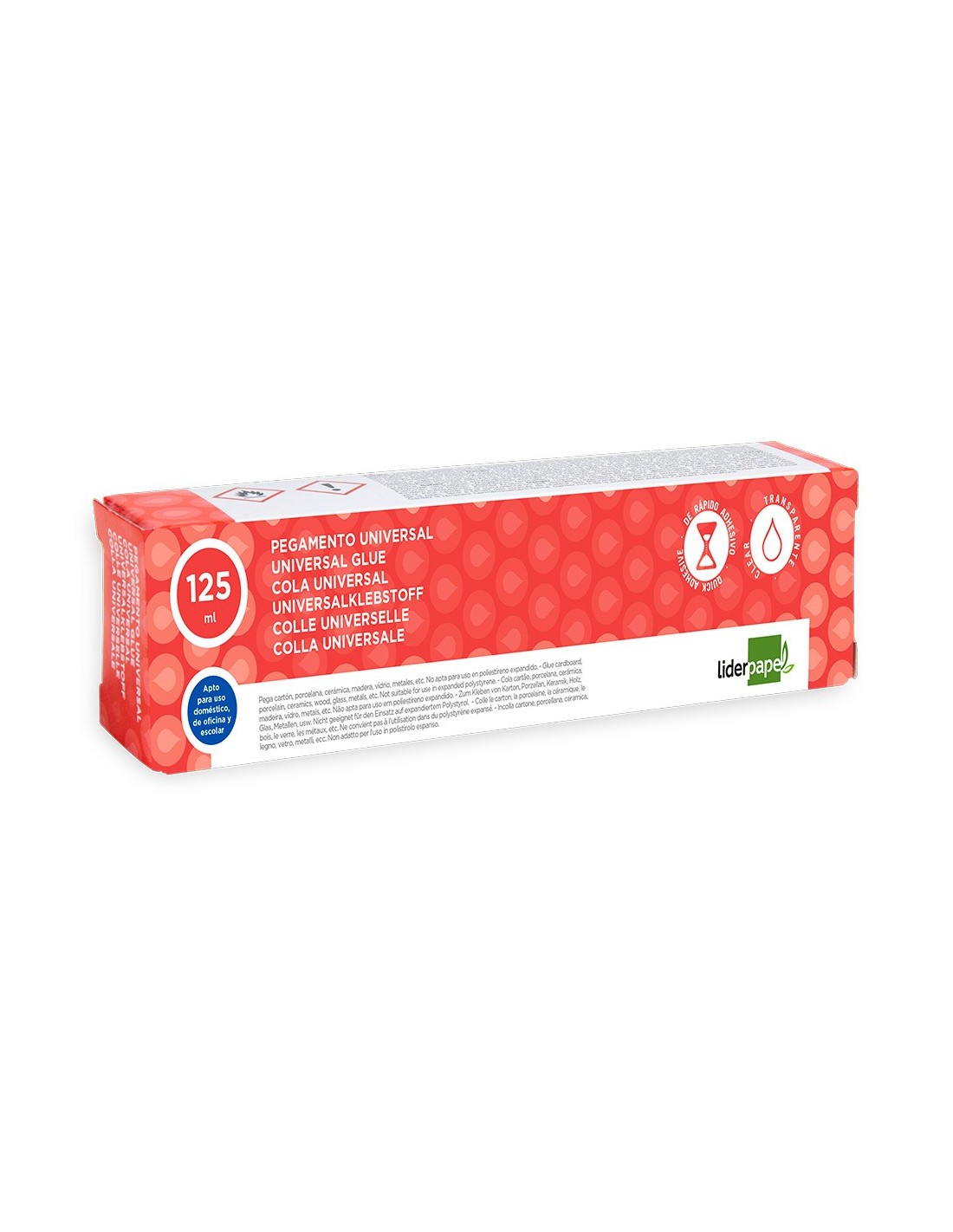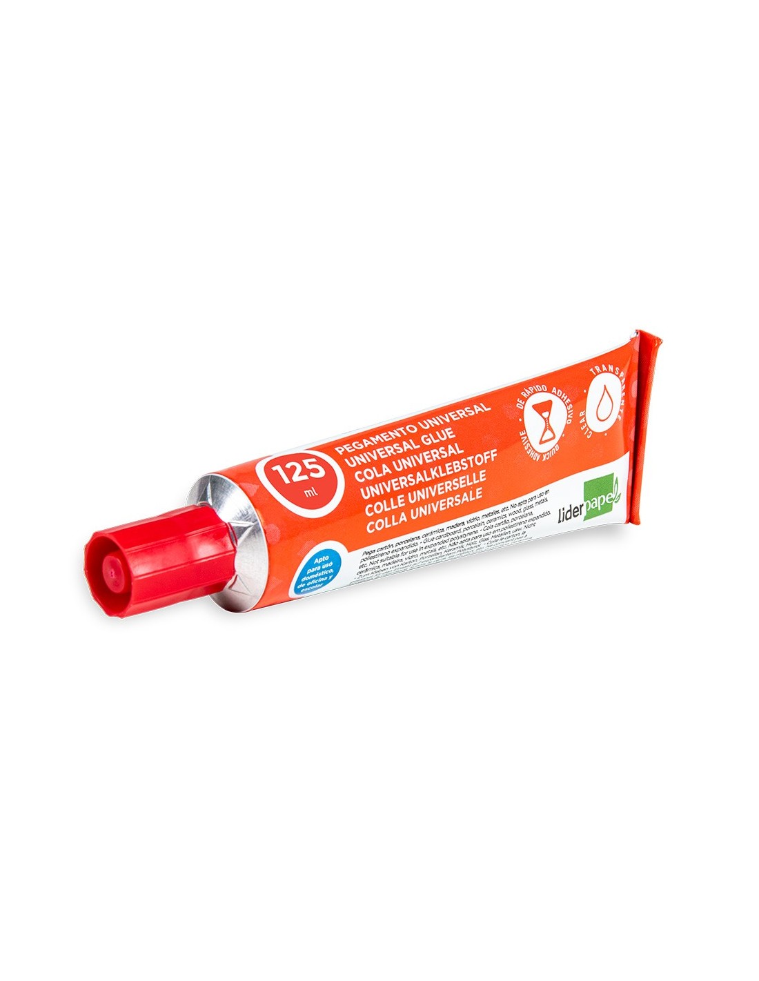 Pegamento transparente para uso universal. Pegado limpio y fácil de usar. Secado rápido. Ideal para manualidades, bricolaje y artesanía. Pega cartón, porcelana, cerámica, madera, vidrio, metales etc. Apto para uso escolar,doméstico y de oficina. Tubo ergonómico. 125 ml.