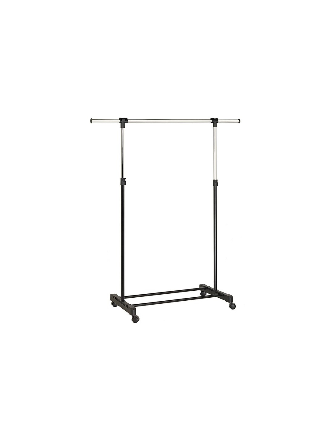 Perchero con ruedas para facilitar su desplazamiento. Su barra trasversal es ajustable en altura y anchura. Con capacidad para 40 prendas y 20 kg de peso. Color negro/cromado. Medidas: 80 - 150 x 102 - 166 x 42 cm. Peso: 1,9 kg.