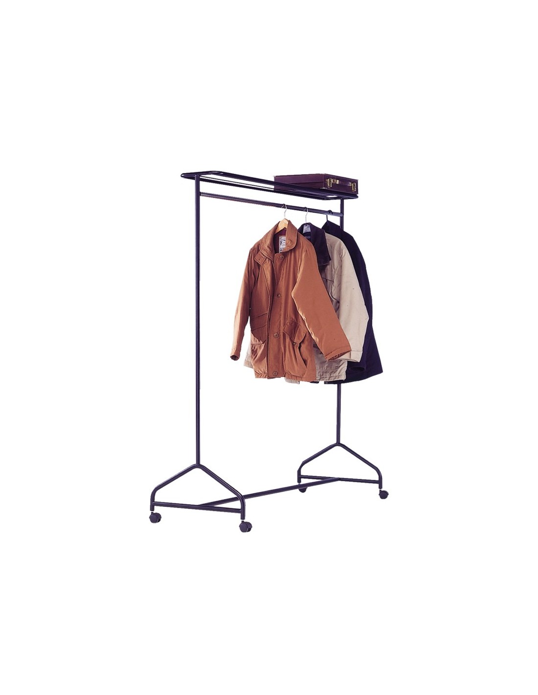Perchero vestidor portátil con ruedas y con repisa superior para soporte de ropa y objetos. Pintado en epoxi. Con capacidad para 40 perchas. Medidas: 150 x 170 x 55 cm.