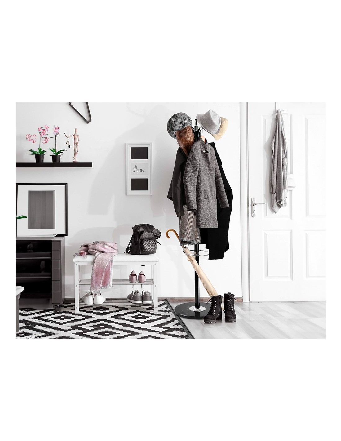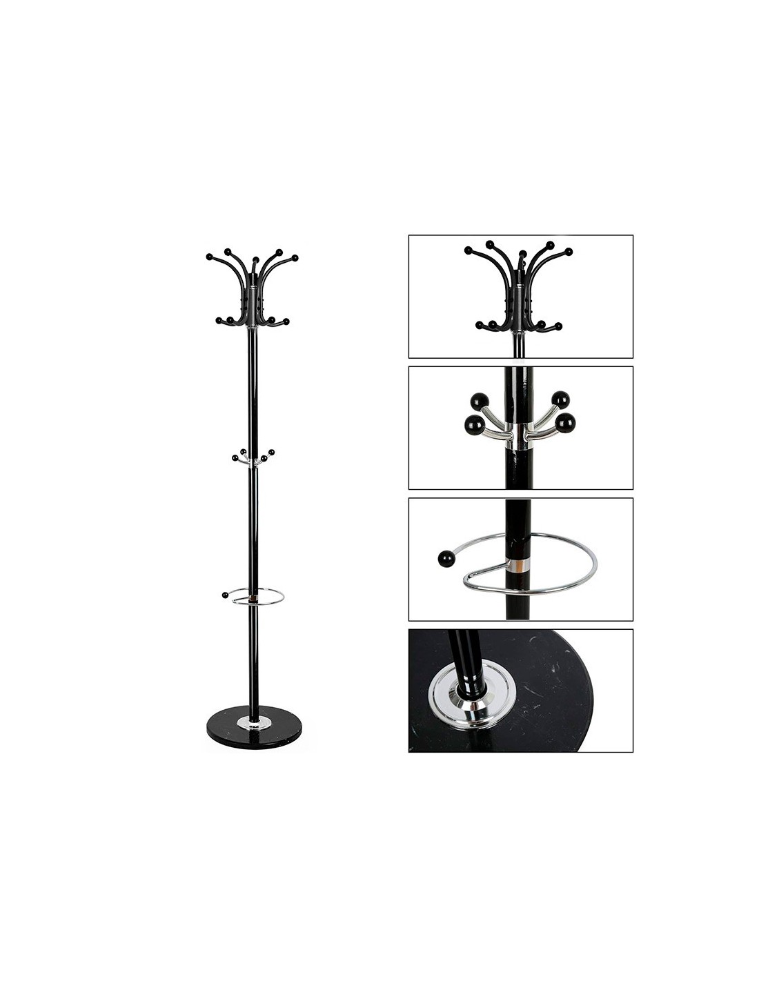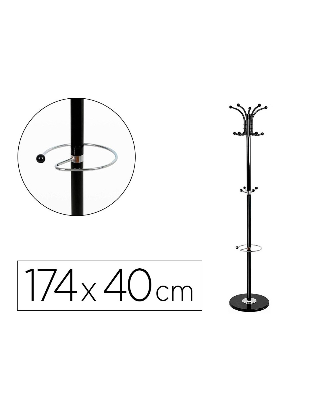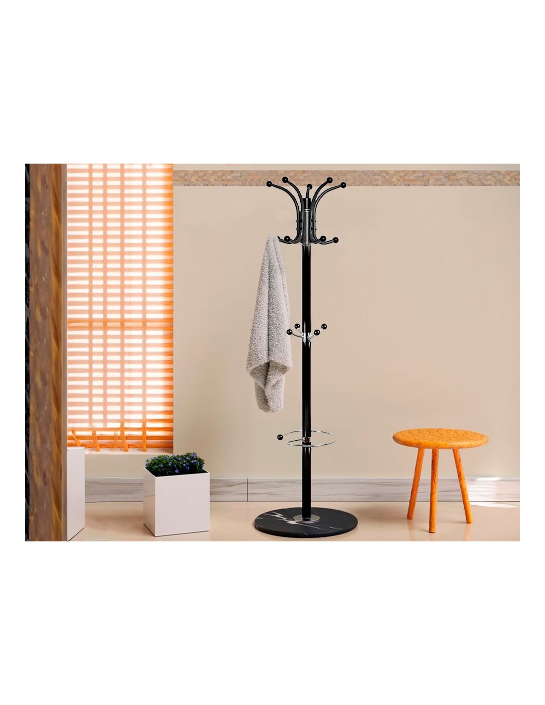 Perchero metálico con base redonda que proporciona mayor estabilidad. Con 10 colgadores, paragüero y ganchos portabolso. Con acabado redondeado para proteger las prendas de ropa. Medidas: Ø 40 x 174 cm.