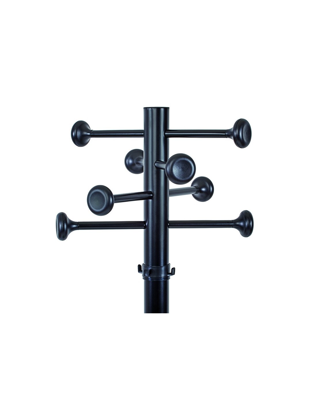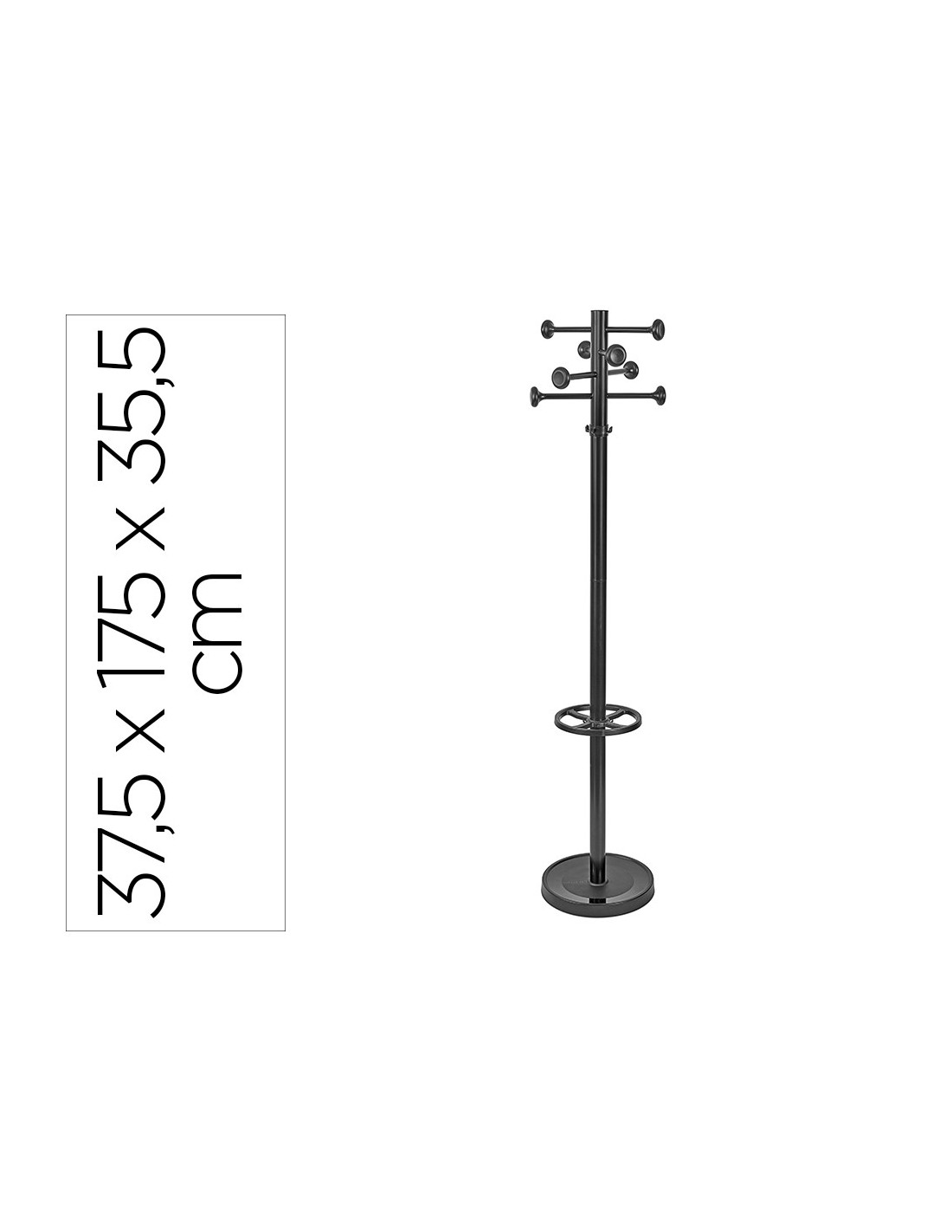 Perchero de acero para uso intensivo. Los rieles de ropa con ganchos en ambos lados distribuyen la carga y permiten un fácil acceso. Base revestida de plástico pesado y protectores de fieltro para el suelo. Parte superior giratoria de Ø 37,5 cm. 16 ganchos, 8 ganchos de metal para abrigos, 4 ganchos adicionales de plástico en el poste y el soporte para paraguas. Soporte para paraguas de Ø 27 cm (hasta 8 paraguas y 4 paraguas telescópicos). Color negro RAL 9004. Reciclable: desarmar y reciclar. Medidas: 39 x 180 x 39 cm. Peso 9,5 kg