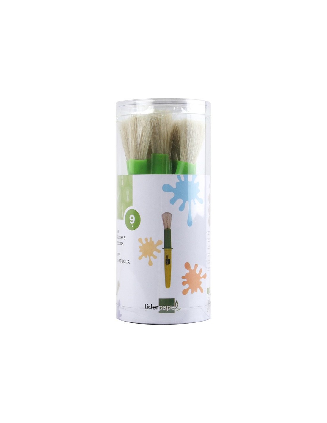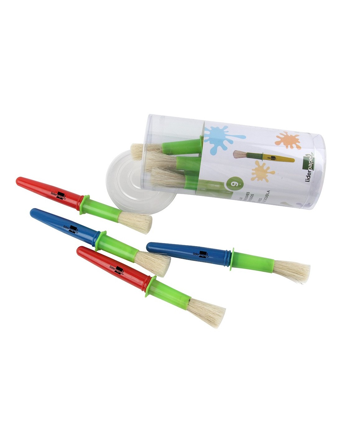 Pinceles escolares, perfectos para niños. Las puntas grandes son ideales para los principiantes y para pintar fondos. El mango, fácil de agarrar, ayuda a manejar y controlar el pincel fácilmente. Con adaptador para evitar que rueden sobre la mesa, no gotean y se limpian fácilmente con agua tibia y jabón. Colores surtidos.