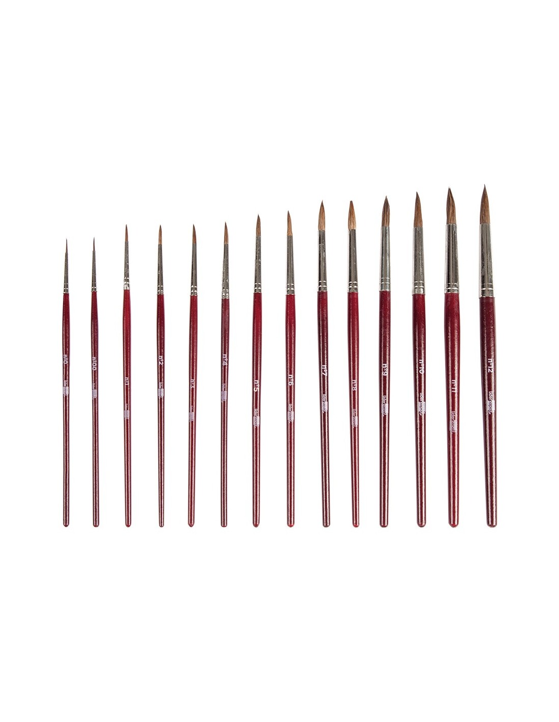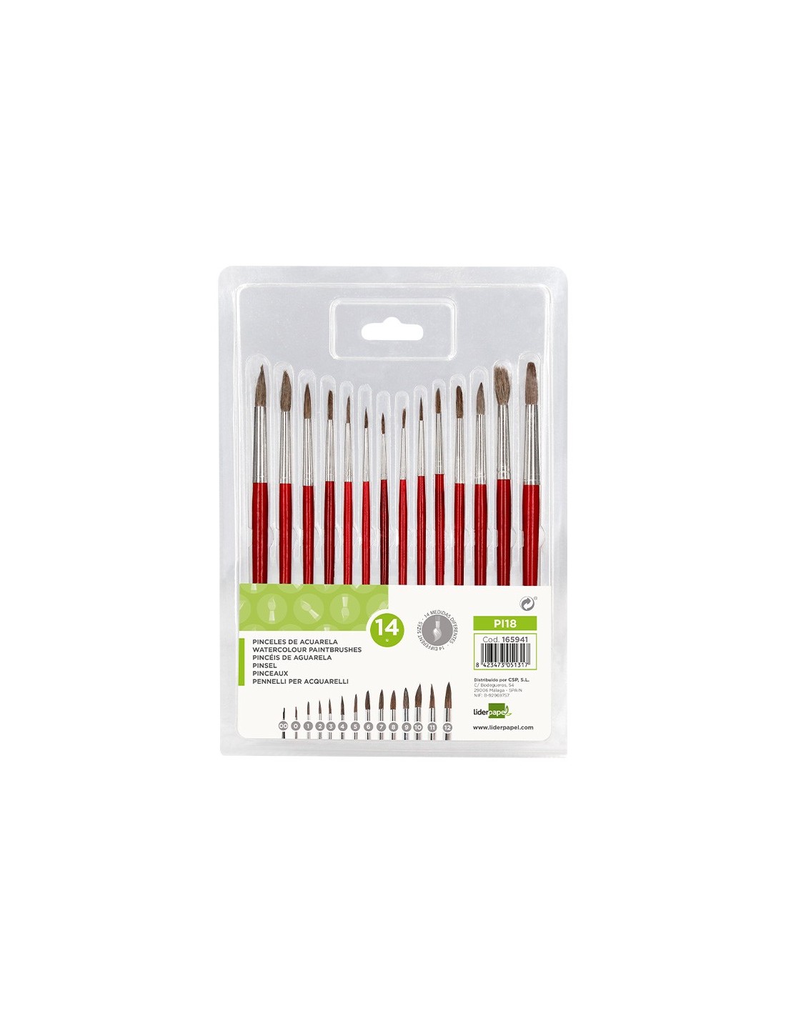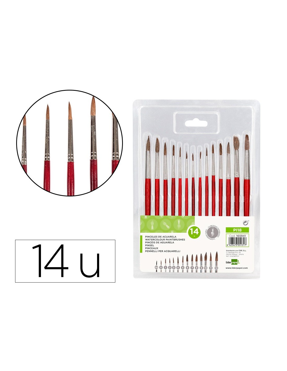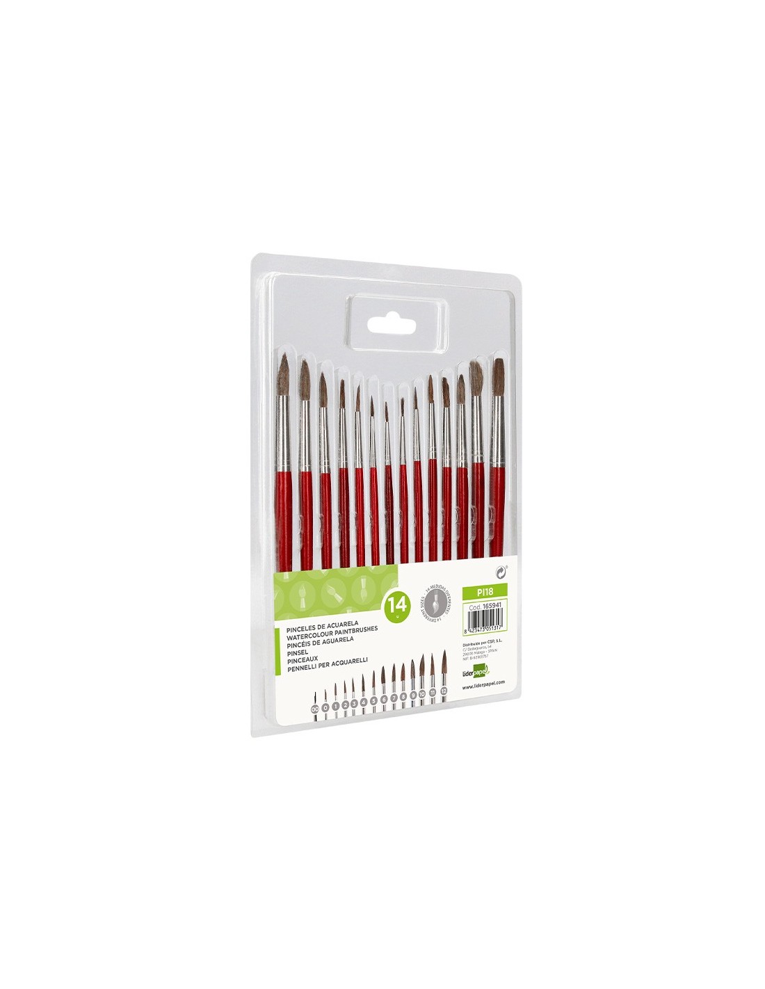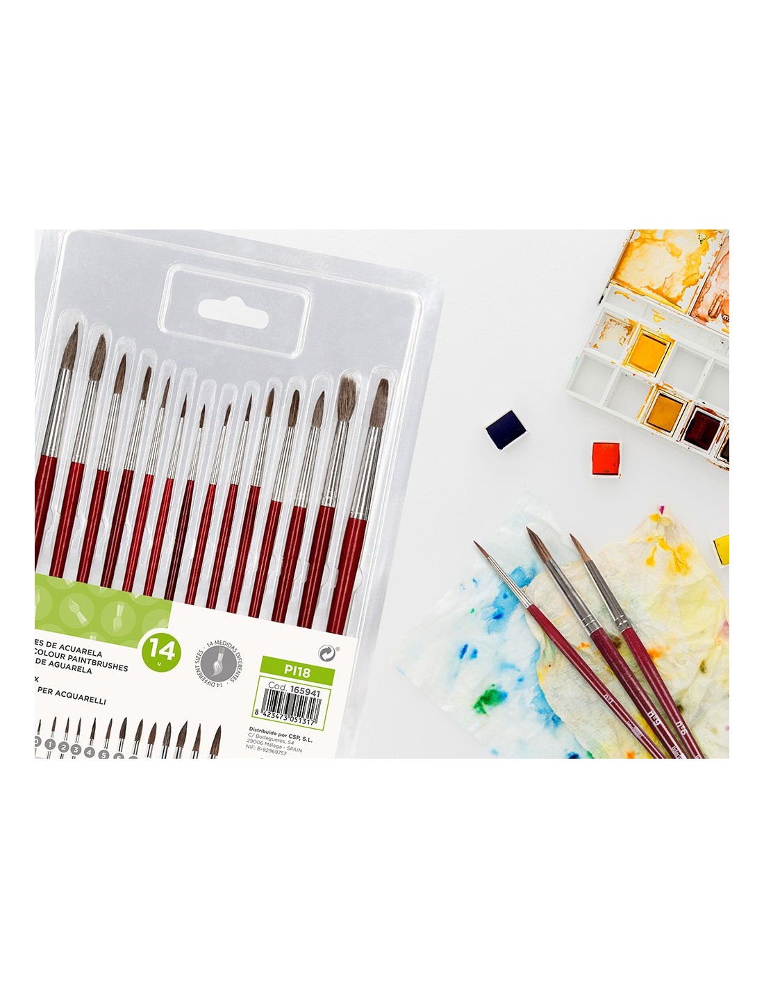 Pinceles de madera con virola cromada. Pelo engomado. Indicados para utilizar con acuarela. Blíster de 14 unidades surtidos. Contiene los números 00-0-1-2-3-4-5-6-7-8-9-10-11 y 12. Una gama completa, más cómoda, facilita todas las posibilidades creativas.
