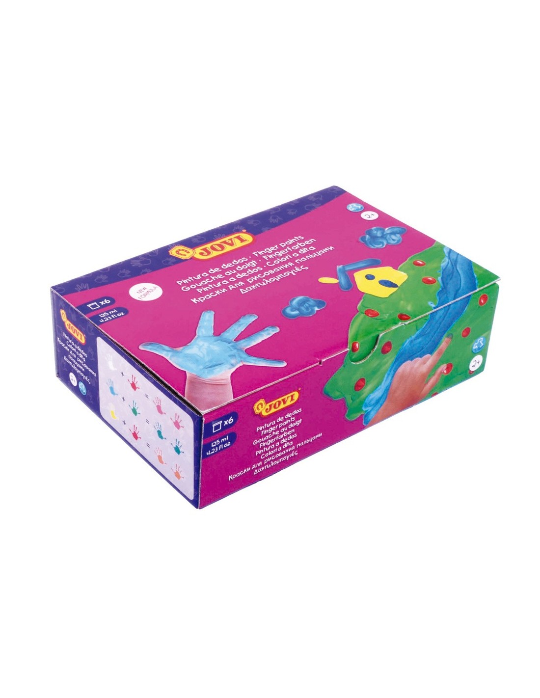Pintura opaca de secado rápido y color intenso. Se aplica directamente con los dedos sin necesidad de agua. Los colores se pueden mezclar entre sí. 6 colores surtidos: amarillo, azul, blanco, marrón, rojo y verde.