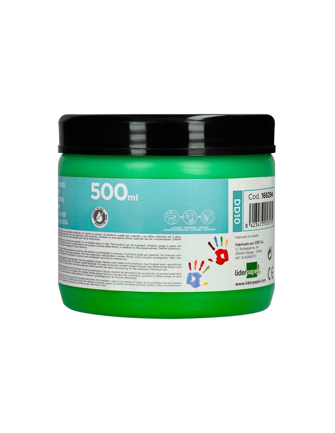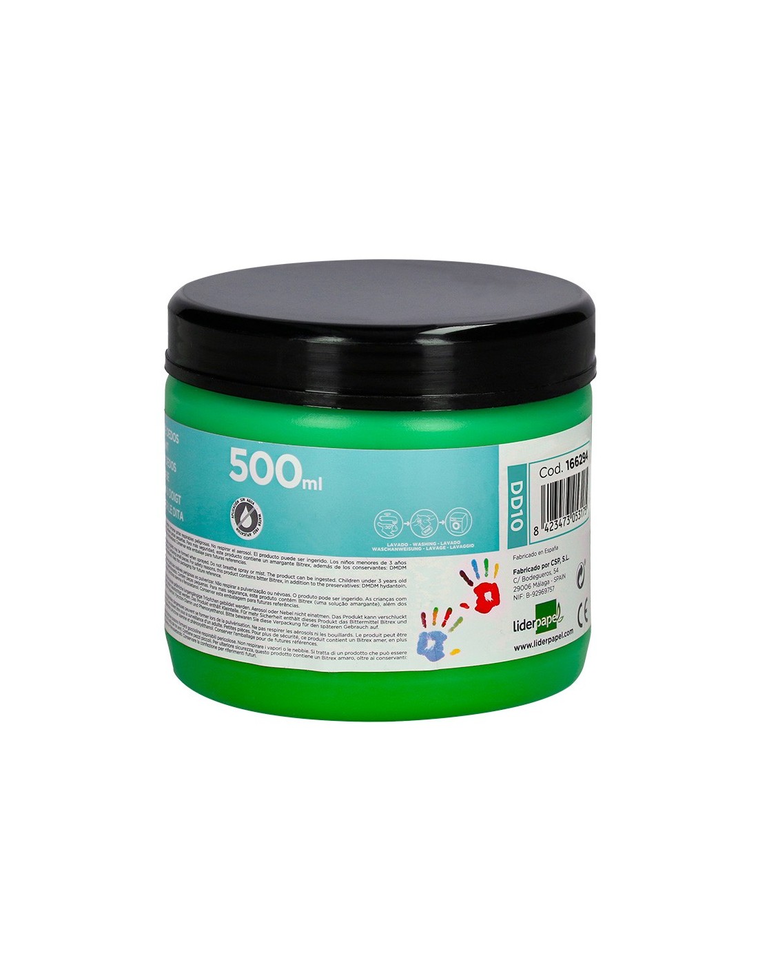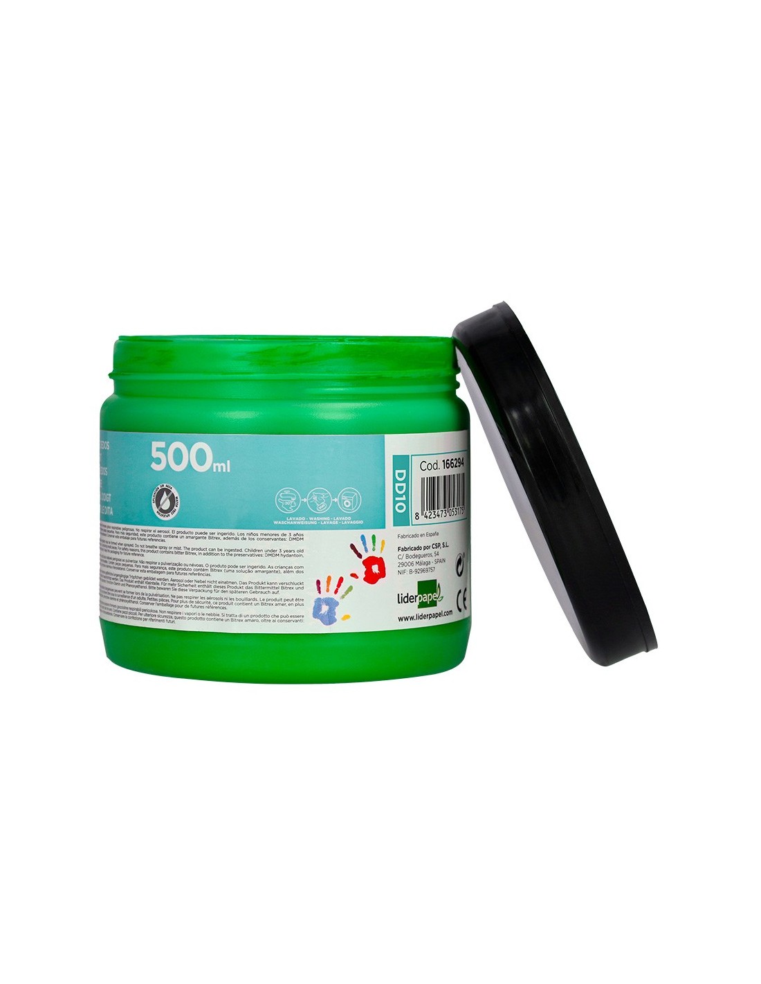 Pintura dedos en base agua, buena viscosidad antigoteo. Se aplica con los dedos sobre cualquier tipo de papel. Aplicación directa sin necesidad de agua. Fácil lavado con agua y jabón en la mayoría de los tejidos. Fabricación bajo normativa europea en 71-3. Sin gluten y libre de los principales agentes causantes de alergias. Tarrina 500 cc. Color verde.