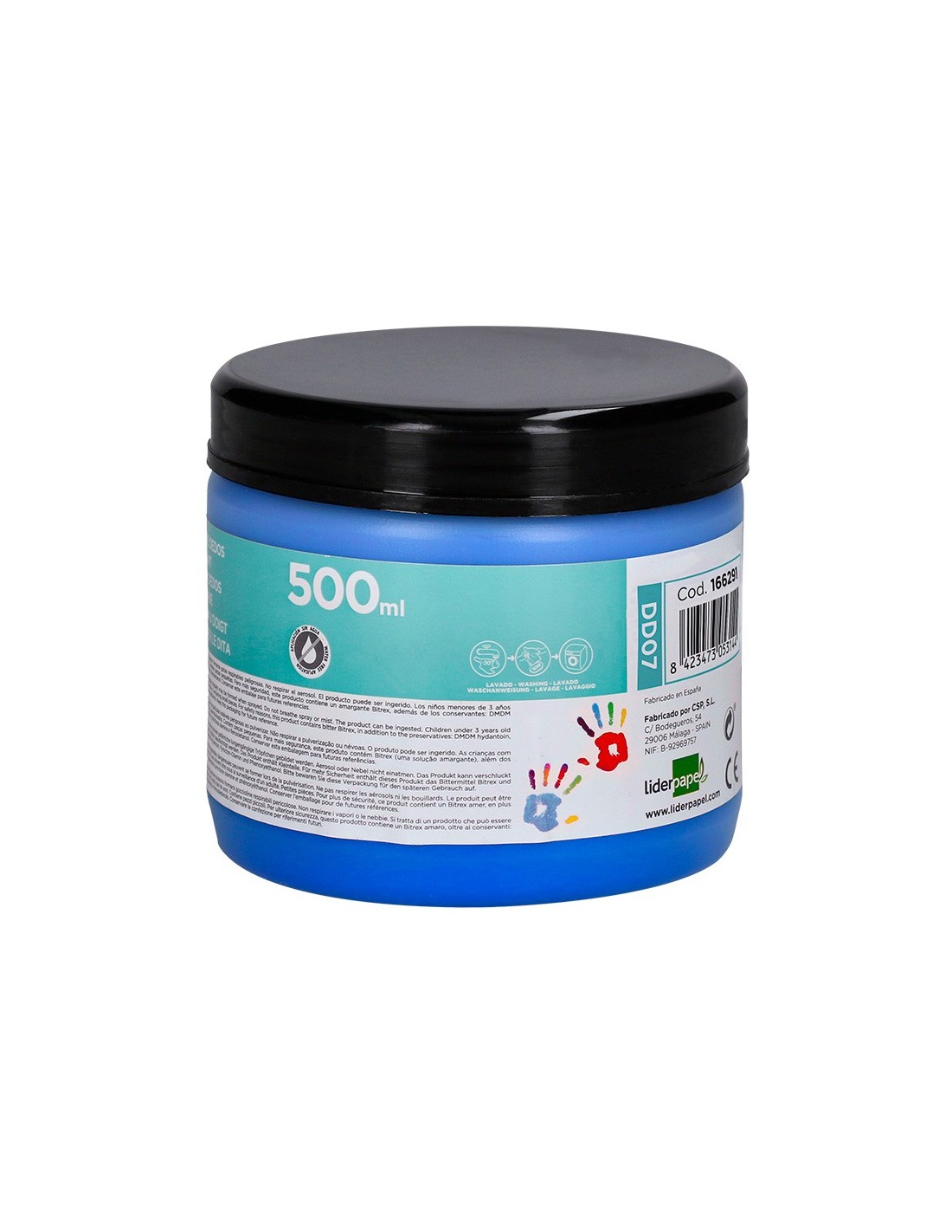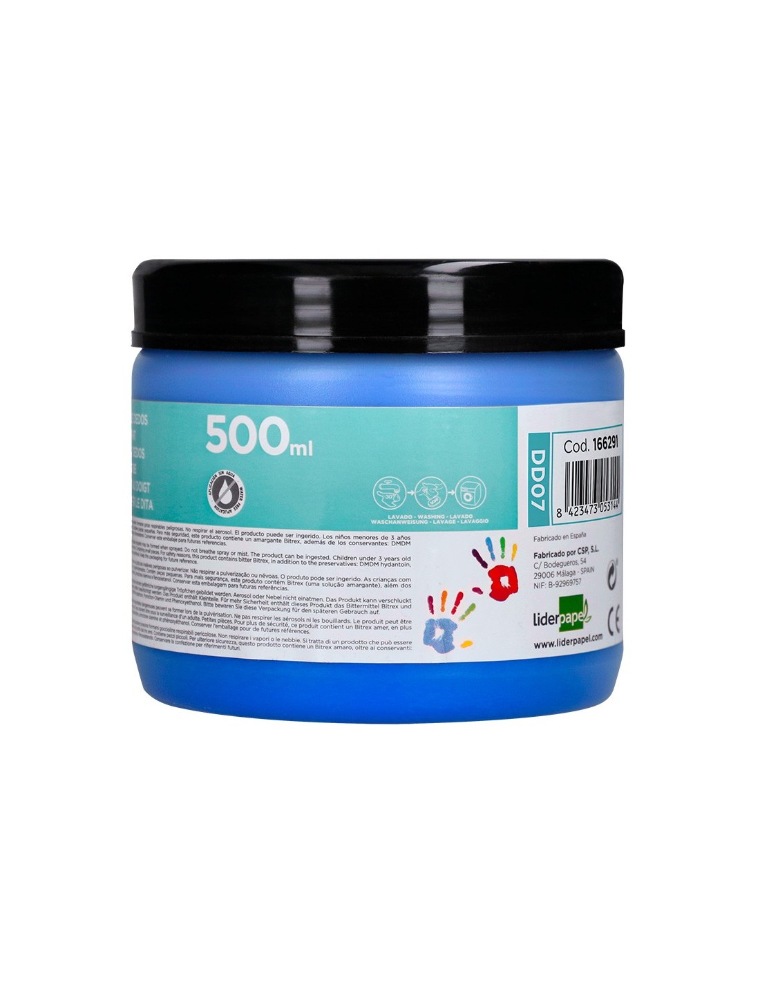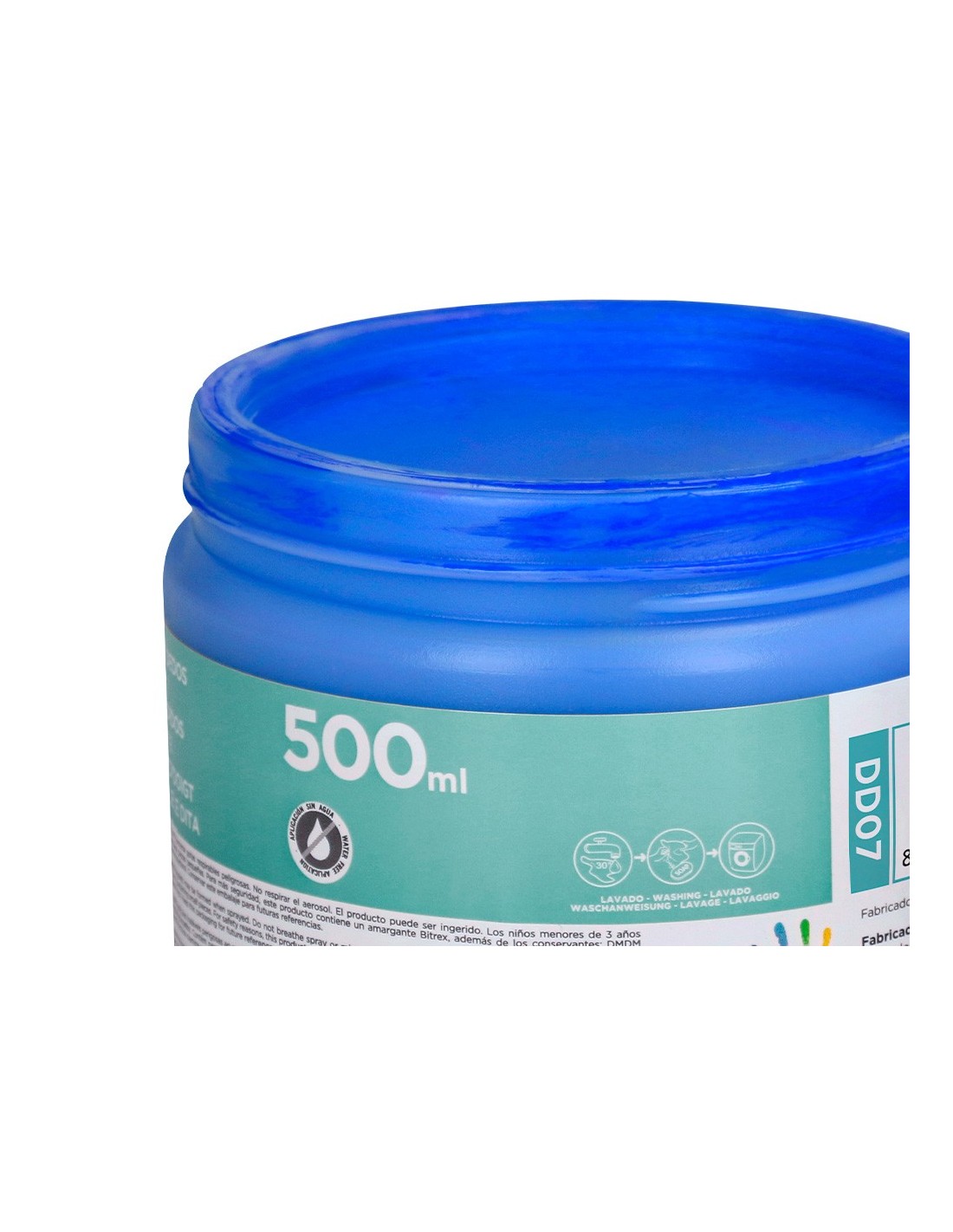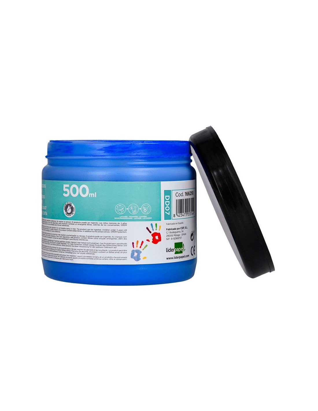 Pintura dedos en base agua, buena viscosidad antigoteo. Se aplica con los dedos sobre cualquier tipo de papel. Aplicación directa sin necesidad de agua. Fácil lavado con agua y jabón en la mayoría de los tejidos. Fabricación bajo normativa europea en 71-3. Sin gluten y libre de los principales agentes causantes de alergias. Tarrina 500 cc. Color azul.