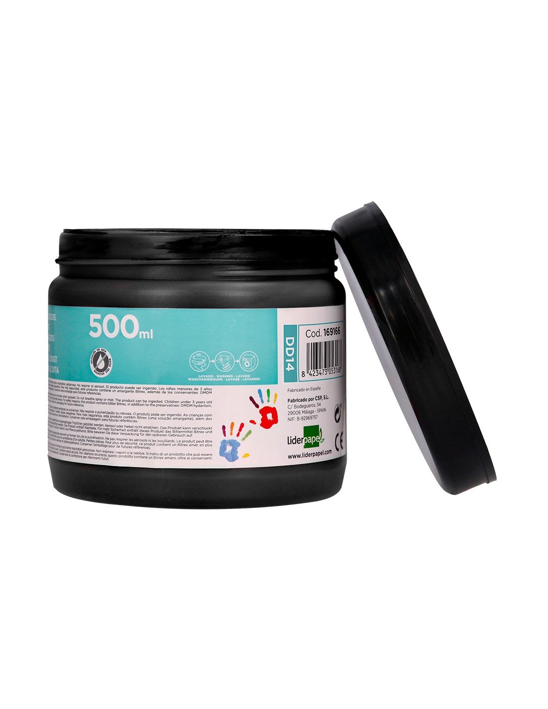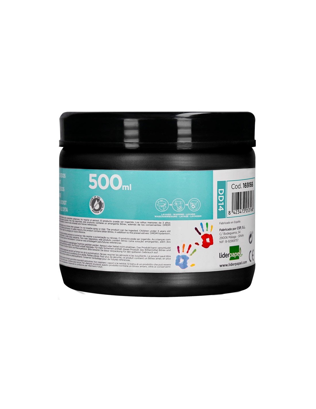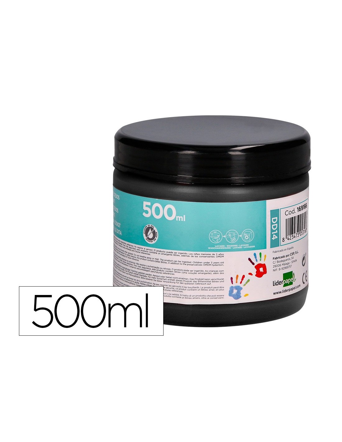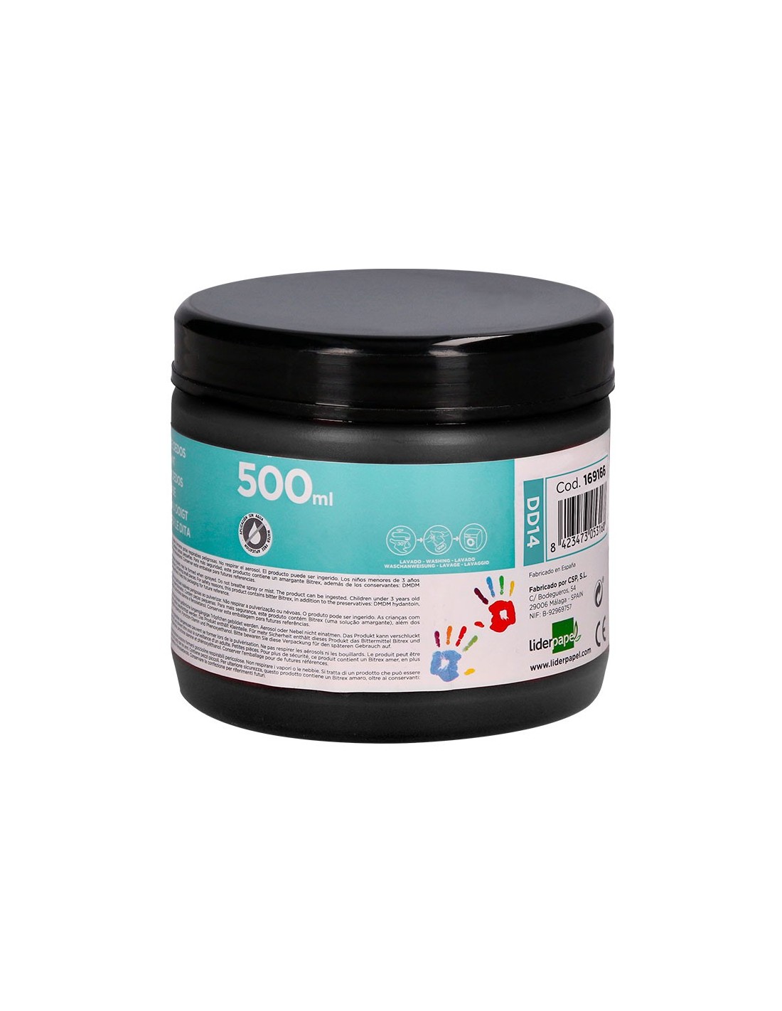 Pintura dedos Liderpapel tarrina de 500 ml color. Pintura dedos en base agua, buena viscosidad antigoteo. Se aplica con los dedos sobre cualquier tipo de papel. Aplicación directa sin necesidad de agua. Fácil lavado con agua y jabón en la mayoría de los tejidos. Fabricación bajo normativa europea en 71-3. Sin gluten y libre de los principales agentes causantes de alergias. Tarrina 500 cc. Color negro.