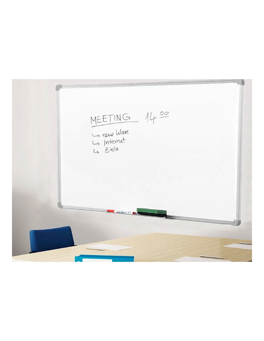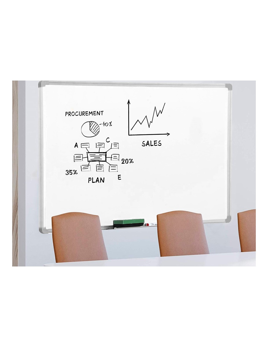 Superficie lisa. Con marco de aluminio. Utilizar sólo rotuladores especiales para pizarra blanca. Bandeja incluida. Adaptable a formato vertical. Provista de accesorios de fijación a la pared.