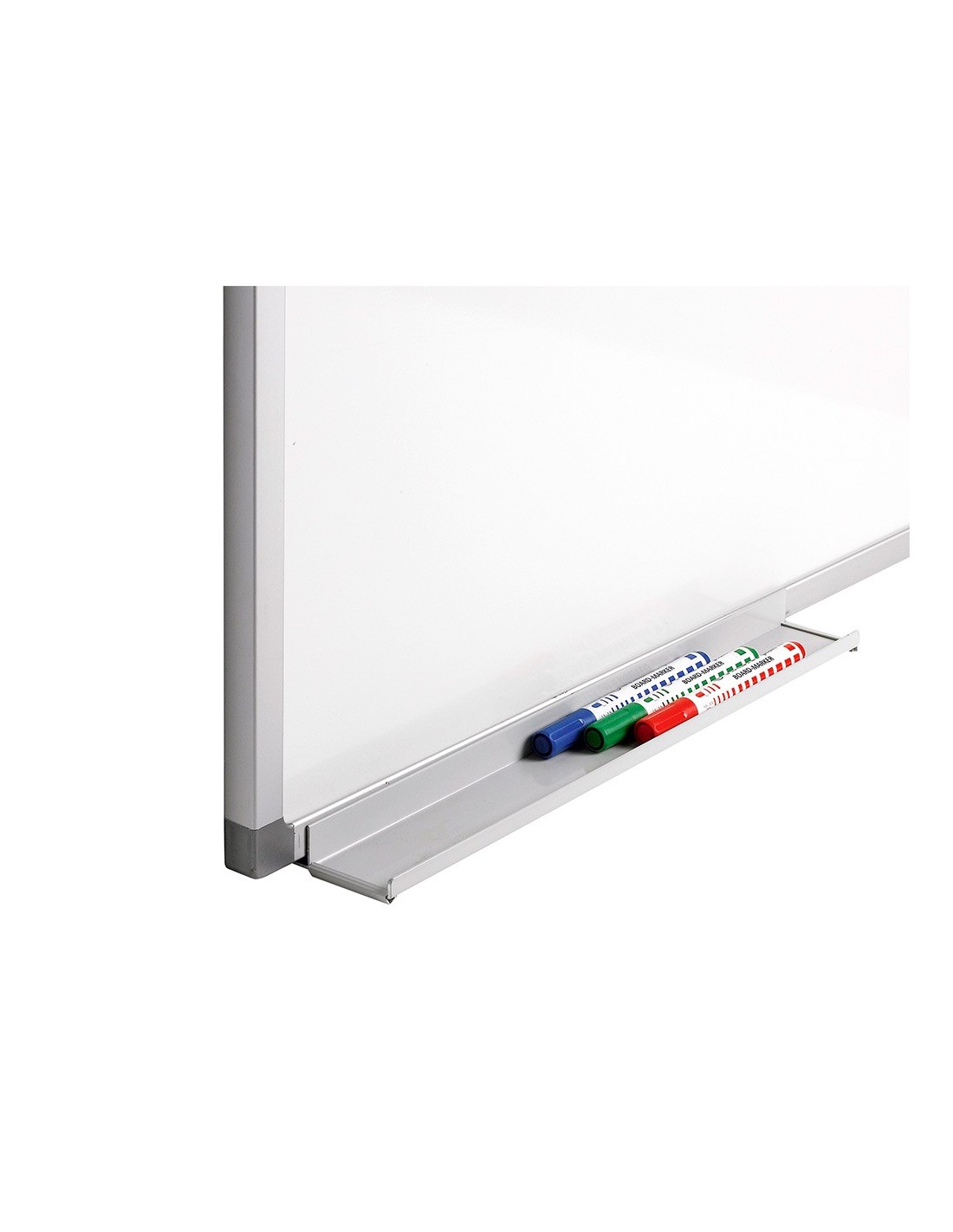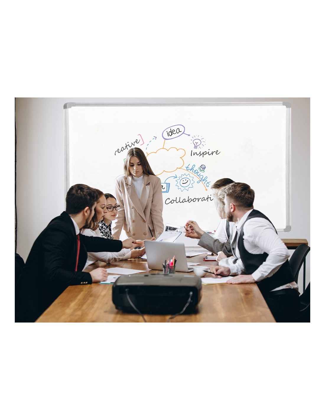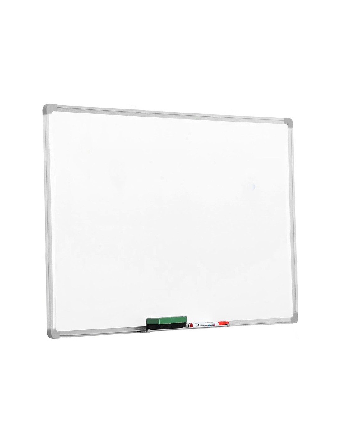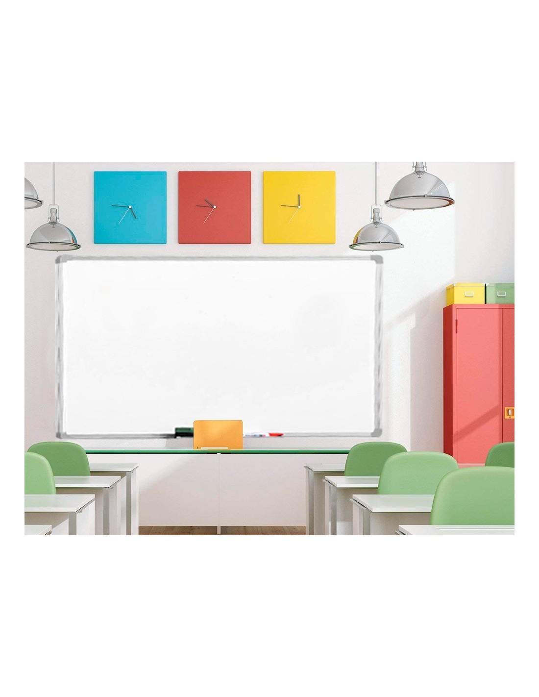 Superficie laminada blanca. Marco de aluminio plata mate y cantoneras redondeadas de plástico gris claro. Su acabado permite borrar con mayor facilidad sin que queden marcas. Provista de accesorios de fijación a la pared. Bandeja incluida. Utilizar solo rotuladores para pizarras blancas. Por su tamaño y características es ideal para centros de formación: academias, institutos, universidades, etc.