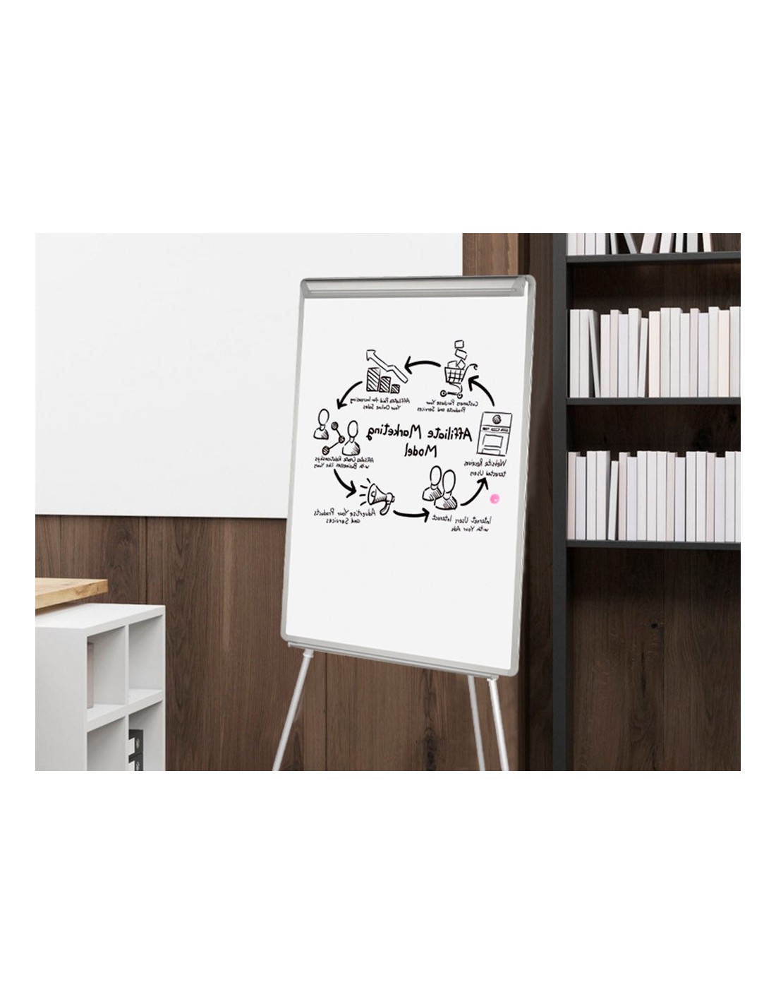 Pizarra trípode con marco y bandeja en plástico gris. Superficie disponible en acabado laminado no magnético para un uso moderado o lacado magnético para un uso frecuente, ambas aptas para escritura con rotuladores de borrado en seco. También apta para todo tipo de blocs de papel gracias a su pinza superior. Pies telescópicos con altura regulable hasta 200 cm. Con bandeja inferior para rotuladores y accesorios. Medidas del tablero: 70 x 100 cm.