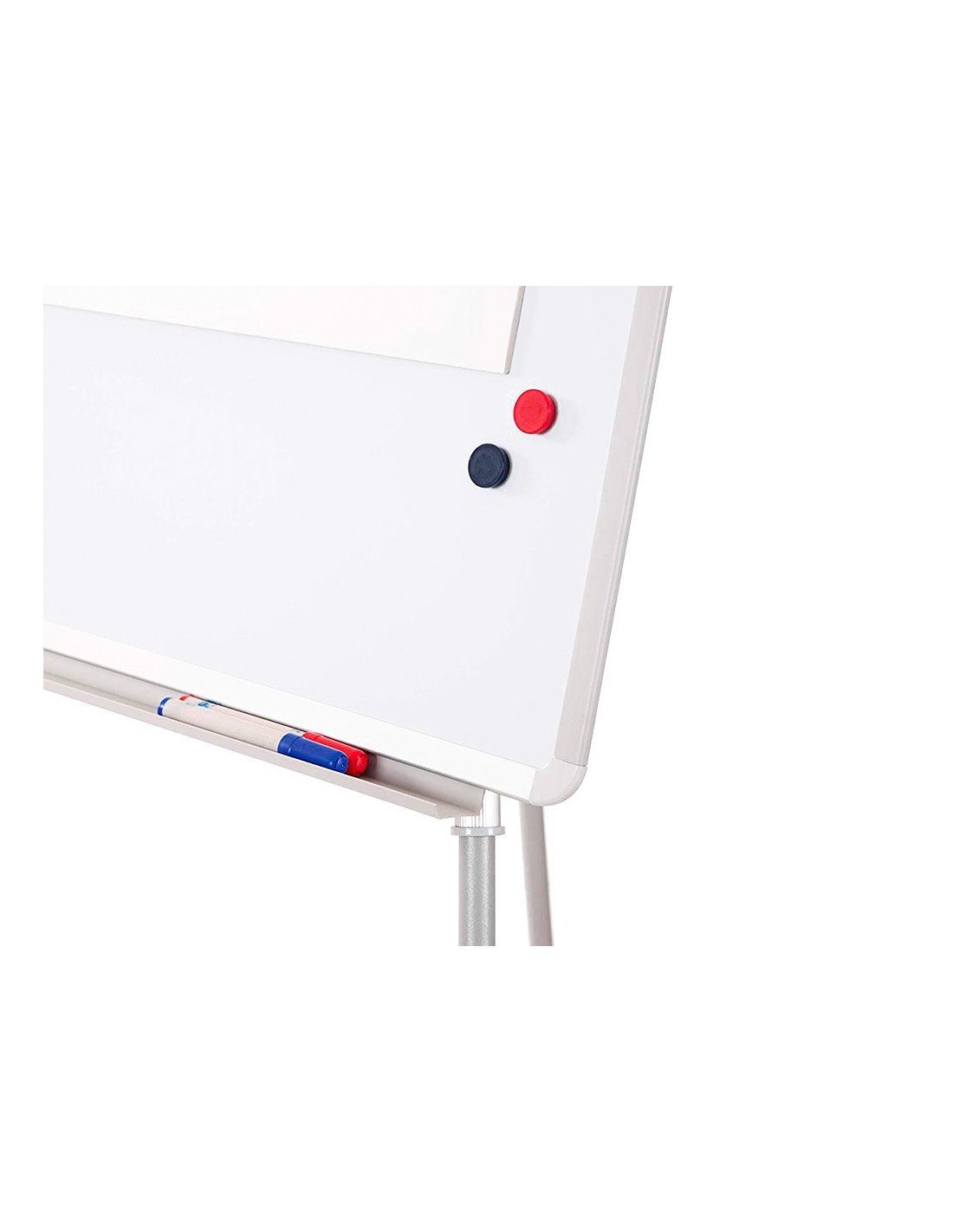 Pizarra trípode con marco y bandeja en plástico gris. Superficie disponible en acabado laminado no magnético o lacado magnético, ambos aptos para escritura con rotuladores de borrado en seco. También aptas para todo tipo de blocs de papel gracias a su pinza superior. Pies telescópicos con altura regulable hasta 195 cm. Con bandeja inferior para rotuladores y accesorios. Medidas del tablero: 70 x 100 cm.