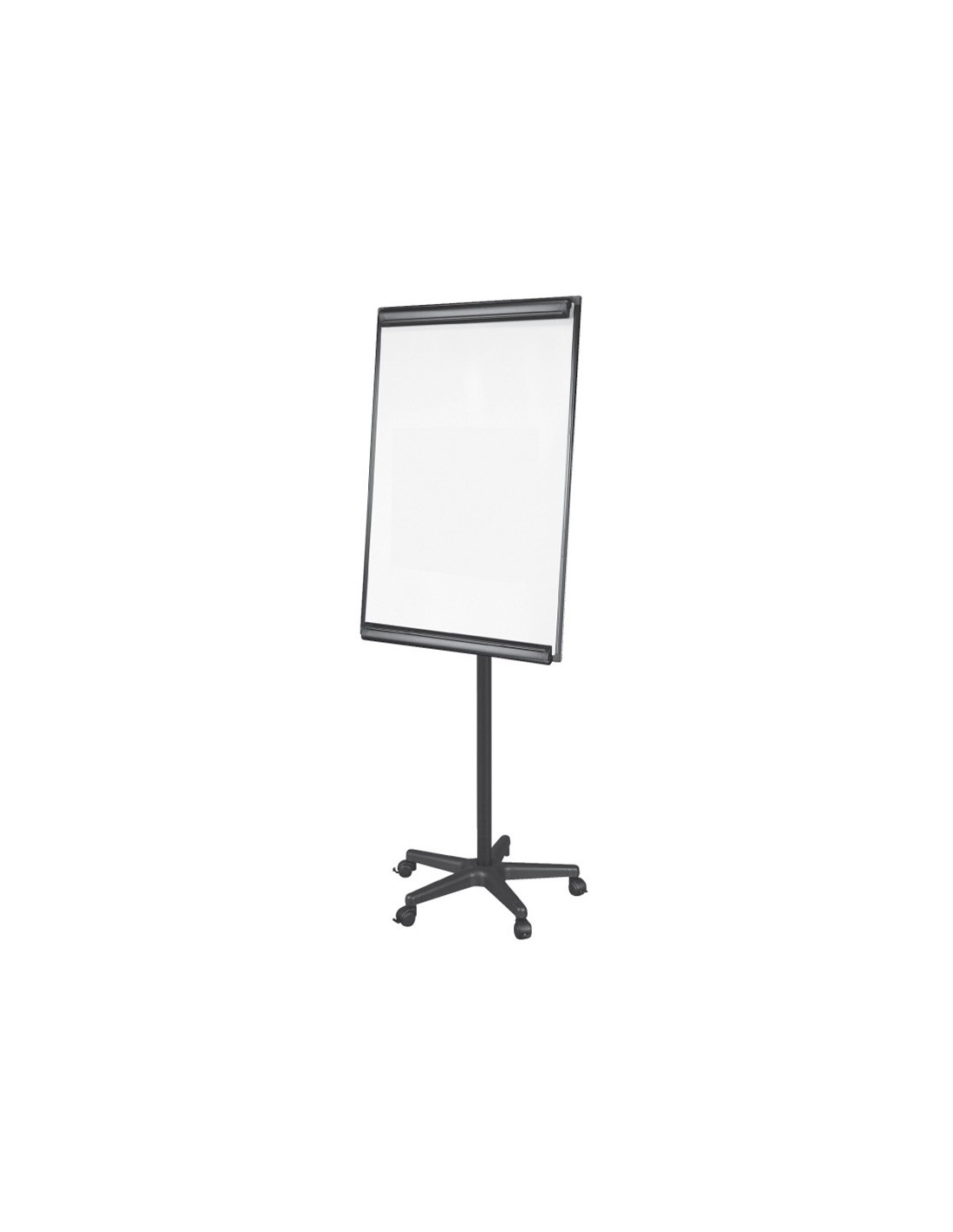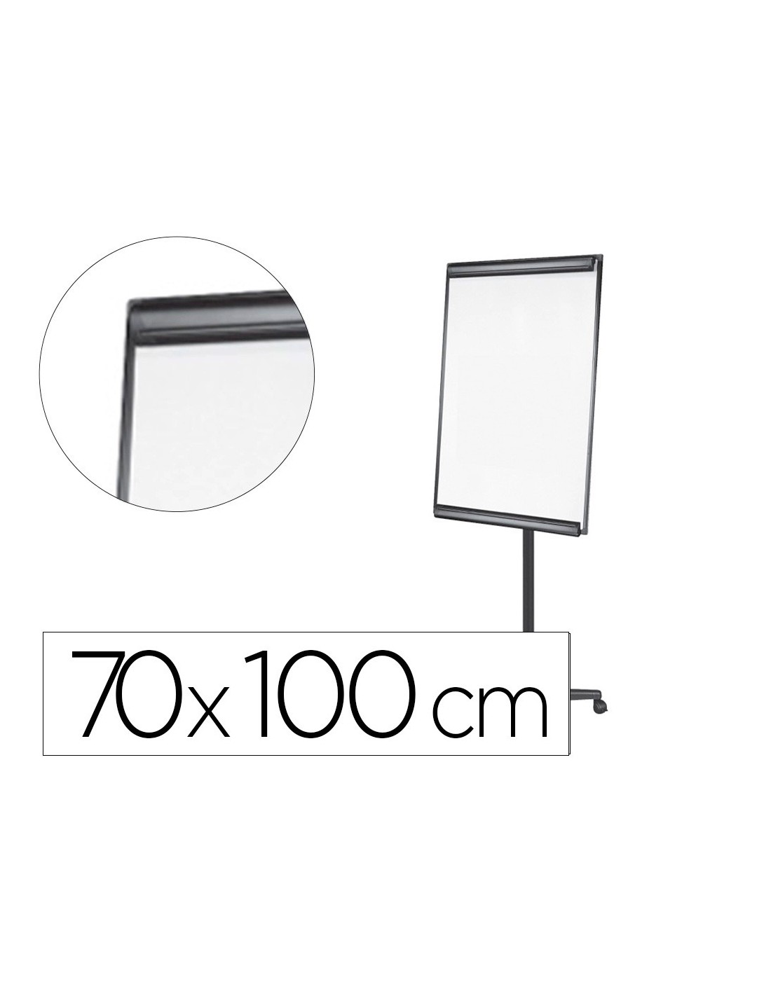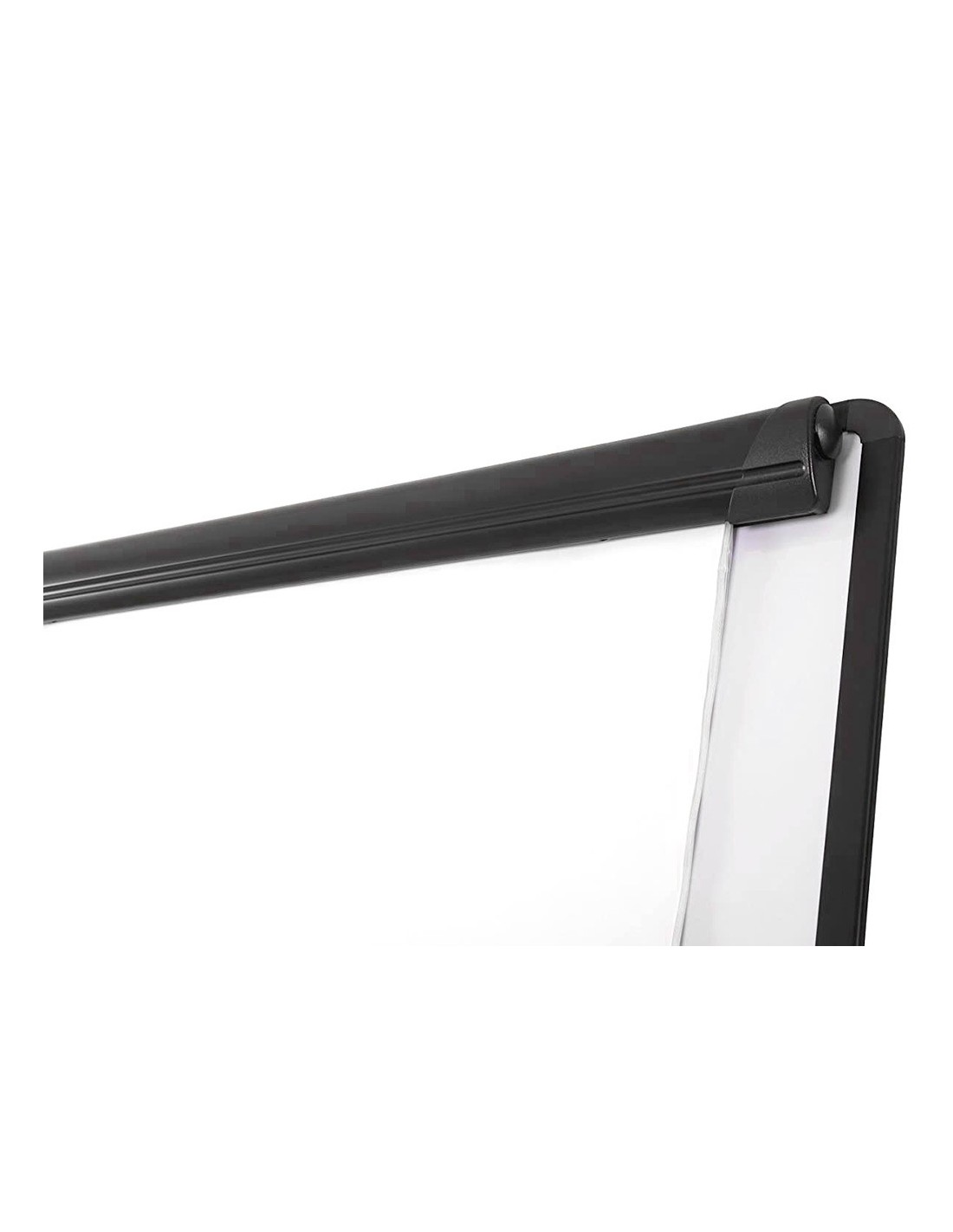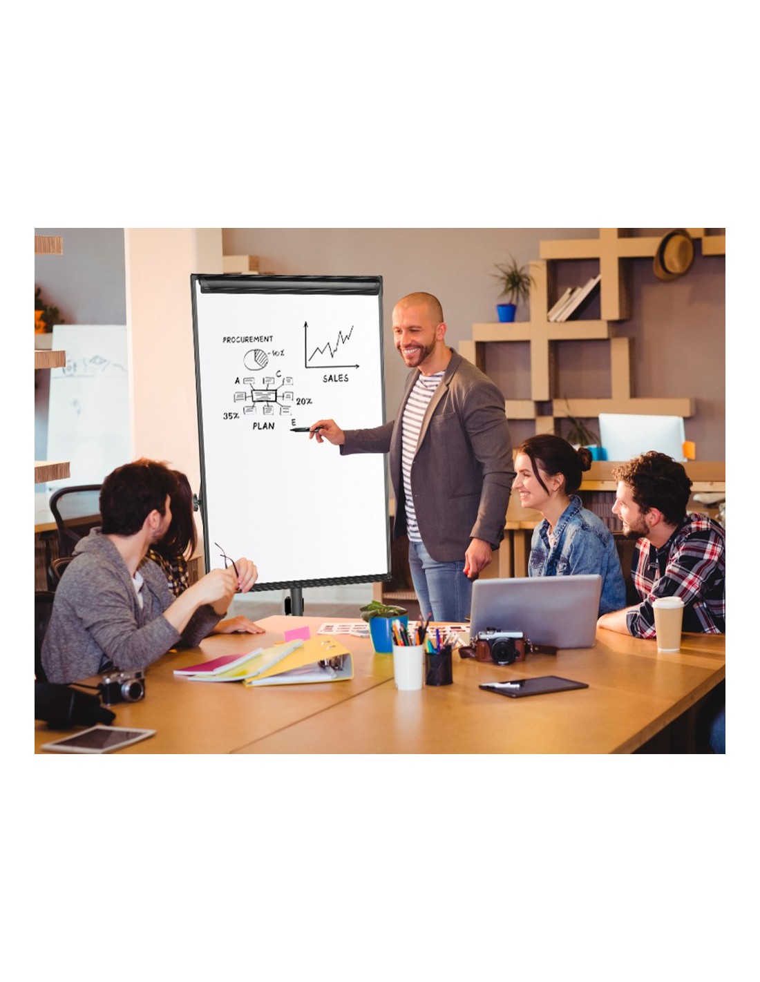 Pizarra caballete móvil con superficie lacada blanca magnética para un uso frecuente y marco de aluminio lacado en negro. Apta para la escritura directa con rotuladores de pizarra de borrado en seco. También apta para bloc de papel gracias a su pinza superior. Con bandeja inferior para rotuladores y útiles. Altura regulable hasta 195 cm. 5 ruedas con freno. Medidas del tablero: 70 x 100 cm. Medidas: 70 x 103 x 195 cm.