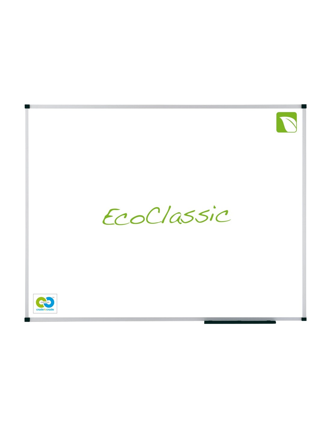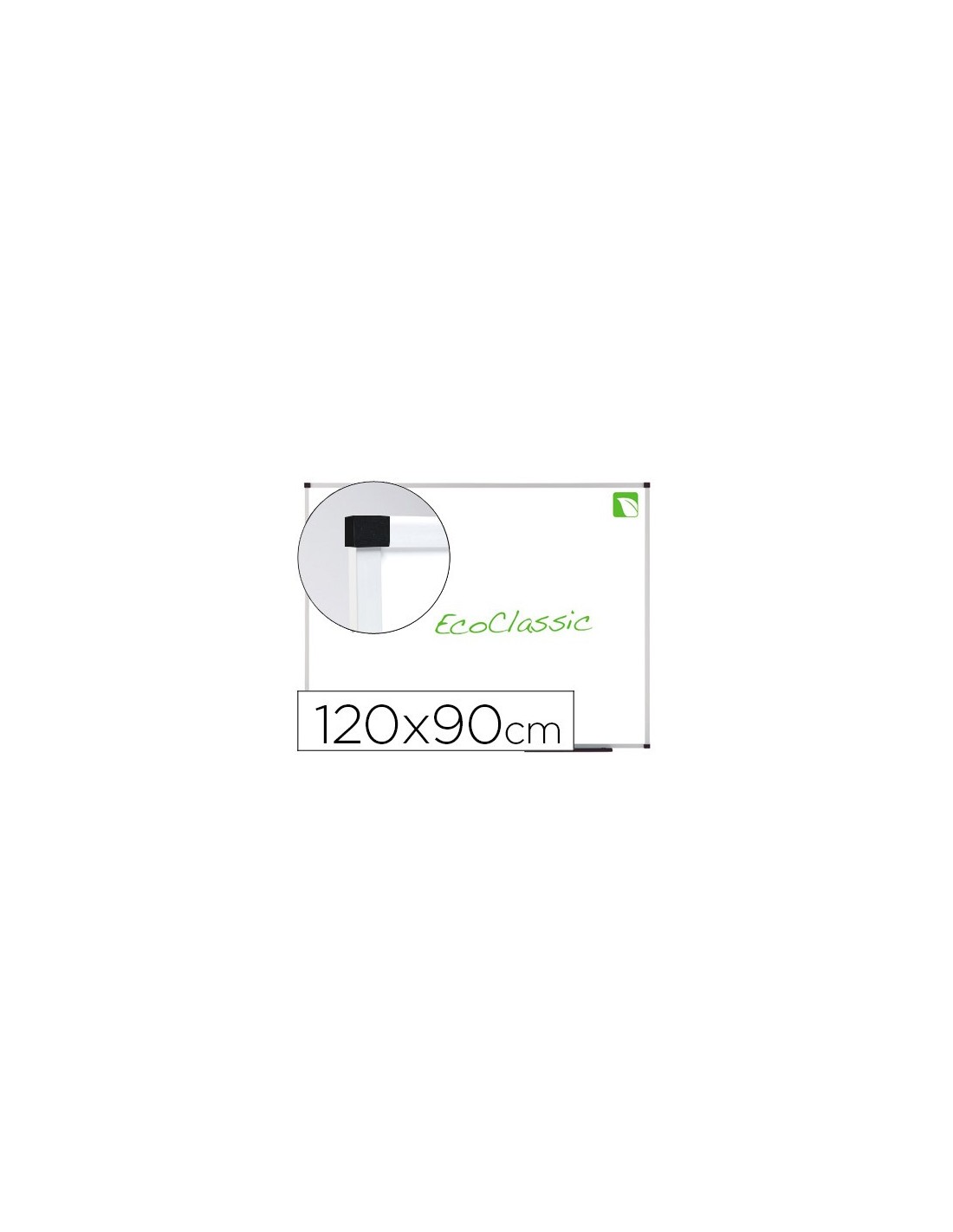 Pizarra blanca ecológica. Superficie magnética de acero vitrificado adecuada para un uso frecuente debido a su legibilidad superior con alta resistencia a manchas de tinta, marcas de rotulador, arañazos y abolladuras. Marco de aluminio anodizado de alta calidad. Fabricada en un 40 % con materiales reciclados. Garantía de por vida. Equipo de fijación a la pared incluido. Medidas: 120 x 90 cm.