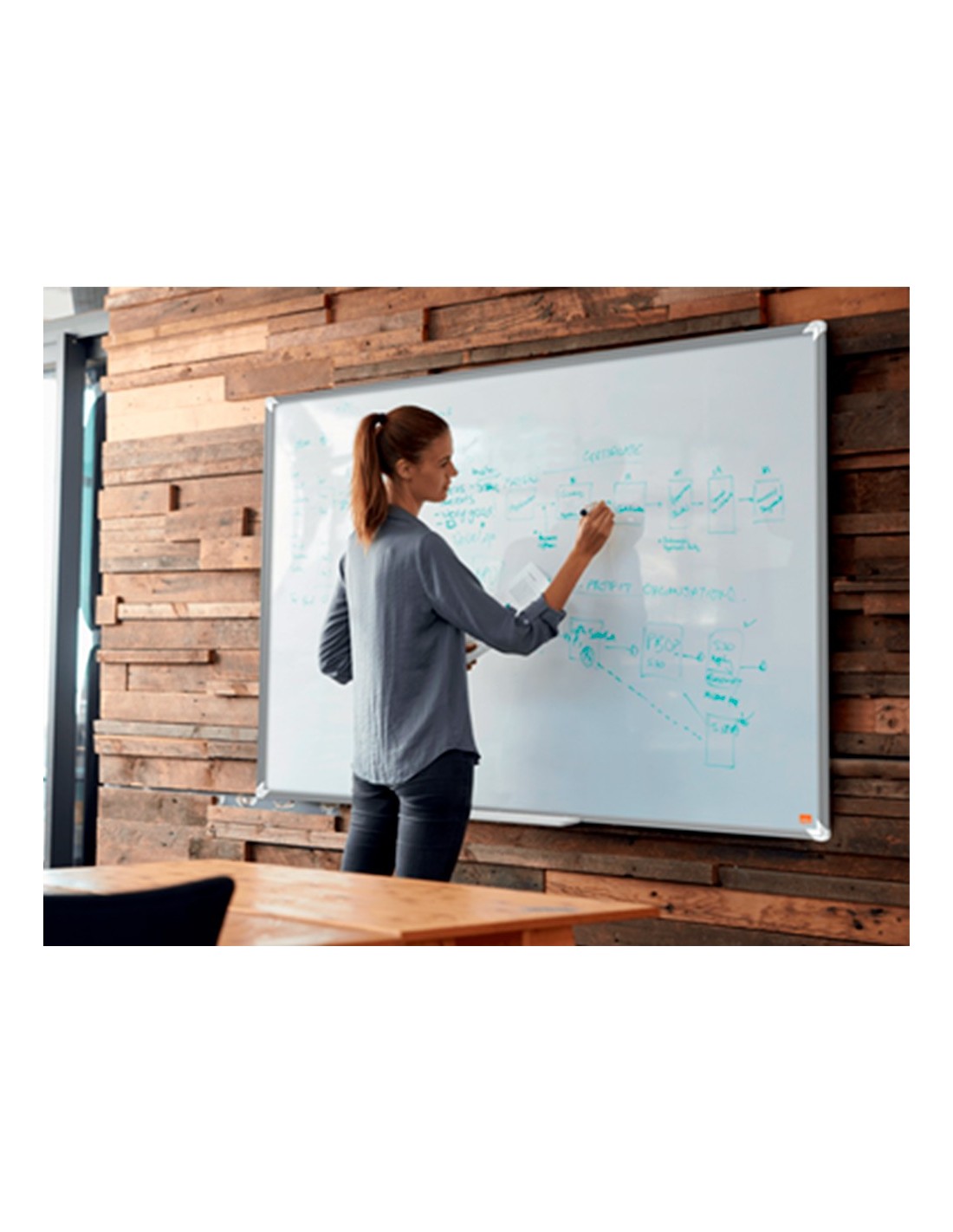 Pizarra magnética de esmalte de formato panorámico con un moderno y elegante marco de aluminio. Se fija mediante un montaje en la pared a través de la esquina e incluye una gran bandeja para el almacenamiento conveniente de rotuladores y borradores. La superficie ofrece un nivel superior de borrabilidad y durabilidad para un uso frecuente.