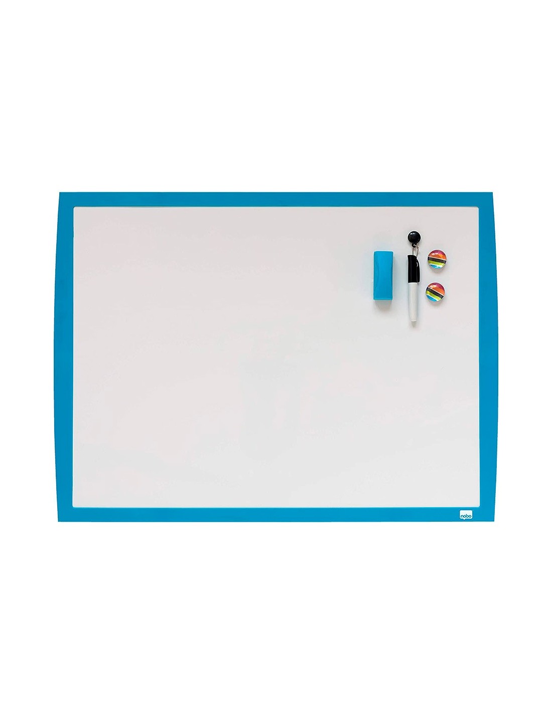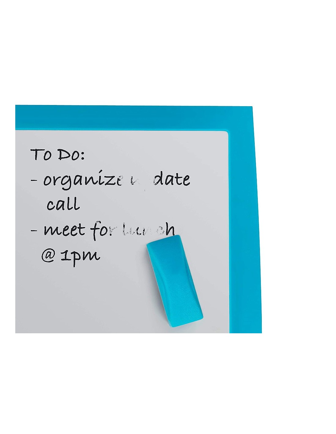 Pizarra magnética pequeña con marco de colores vibrantes. Con un minirrotulador magnético para pizarra, imanes de pizarra estampados, borrador de pizarra blanca a juego y un kit de fijación para montaje en la pared. Medidas: 58 x 43 cm.